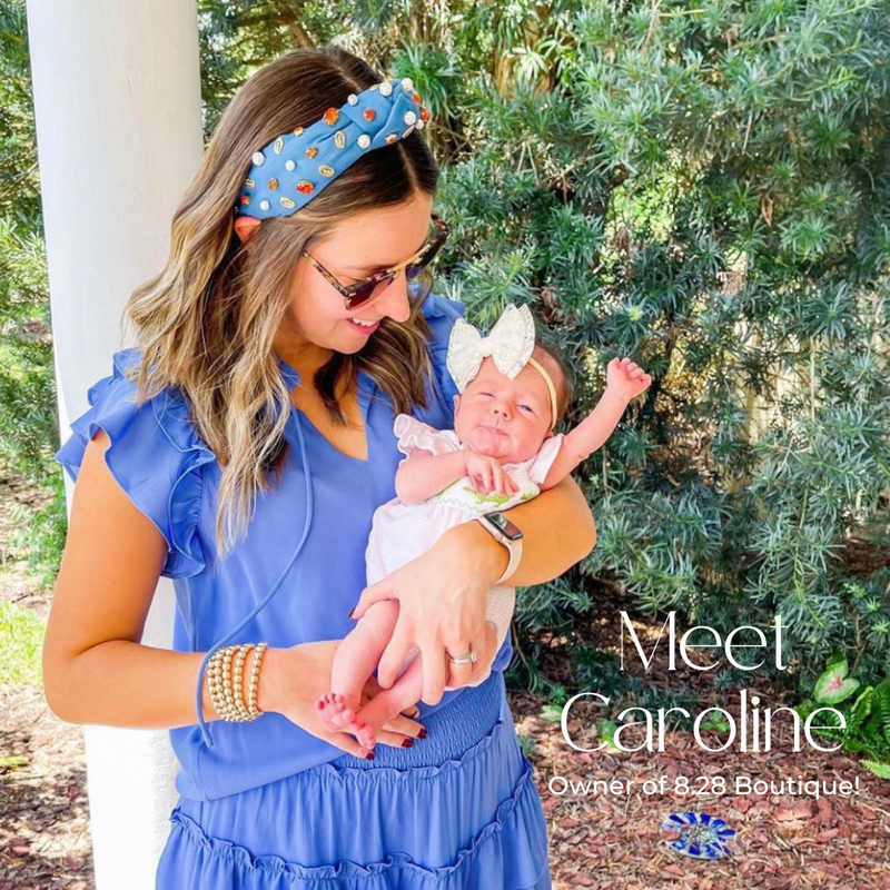 Meet Caroline, dress-lover, beach-goer, new mom, and owner of 8.28 Boutique! She is passionate about offering confidence-boosting pieces to all of her customers, with a few fun trends scattered throughout. Read on to see what she has to say about her favorite things, personal style, and inspiration when buying for the boutique.