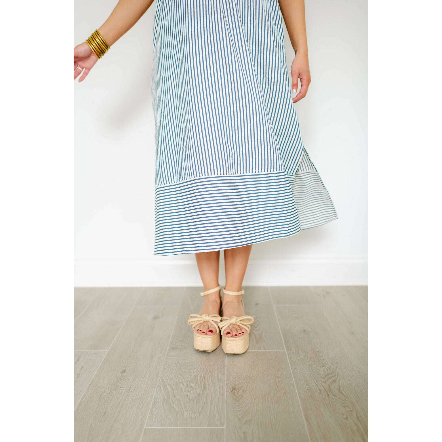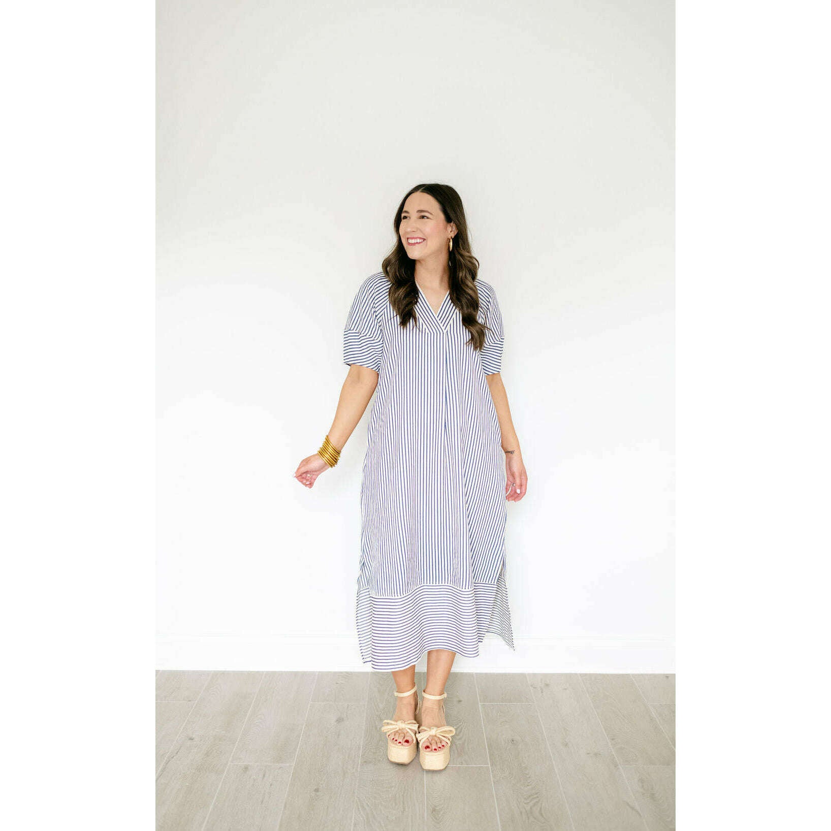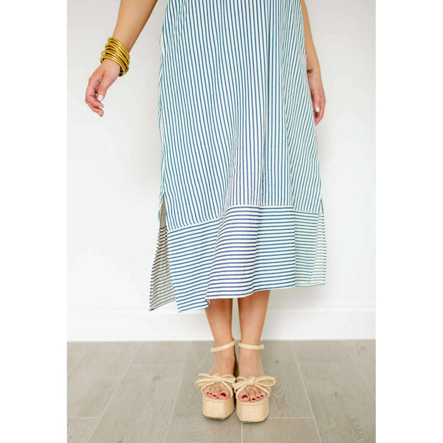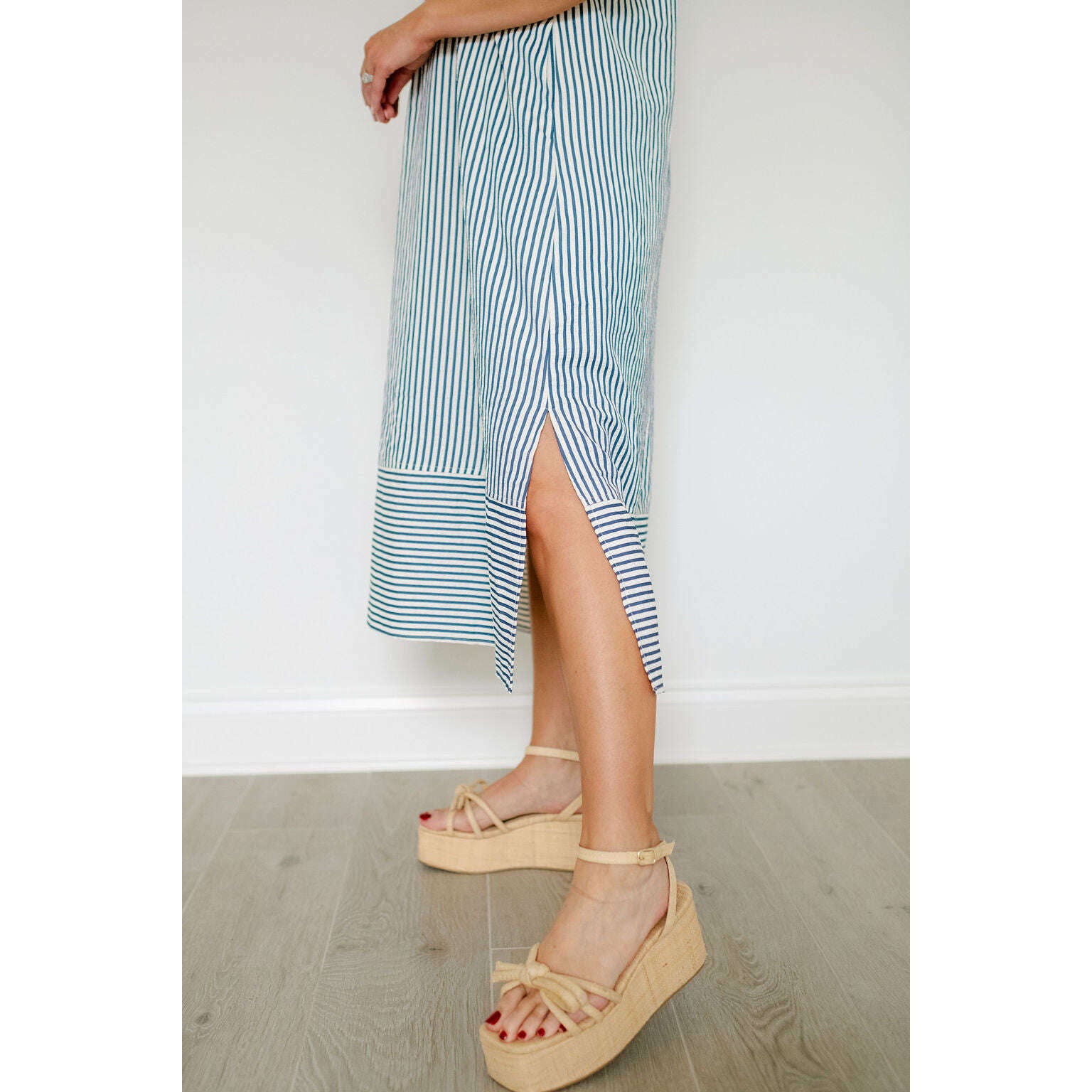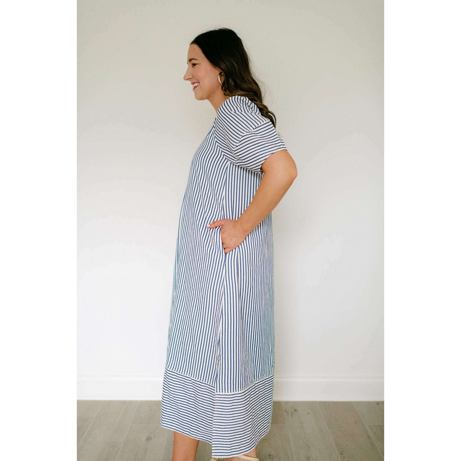 The Entro Blue and White Stripe Midi Dress is the perfect spring essential with its cheerful striped pattern and flattering midi length. This fun piece effortlessly transitions from casual outings to weekend brunches, making it a versatile addition to your wardrobe.
