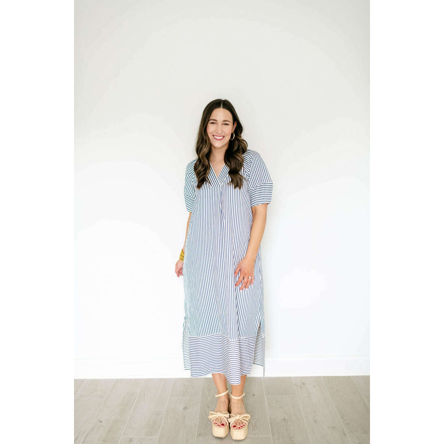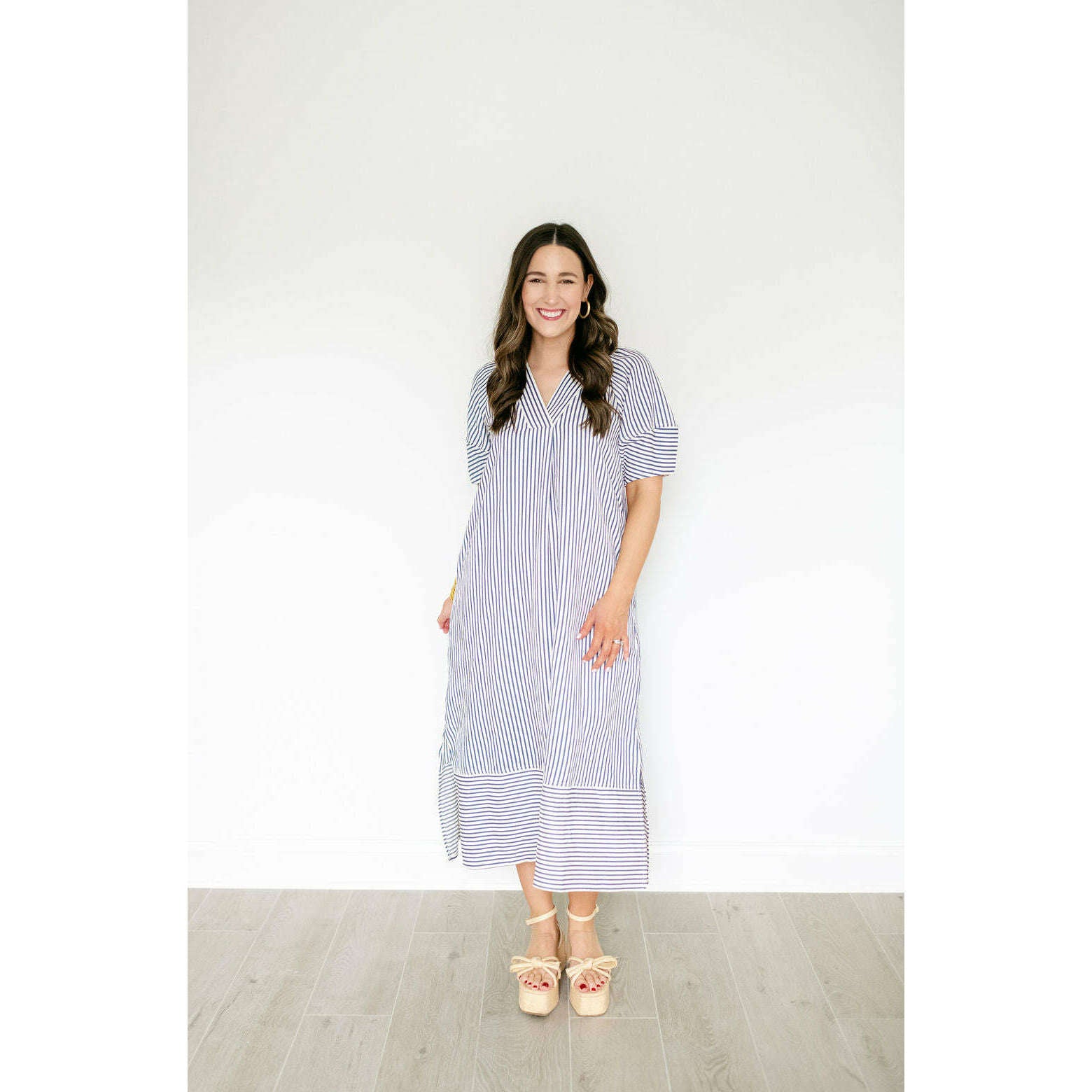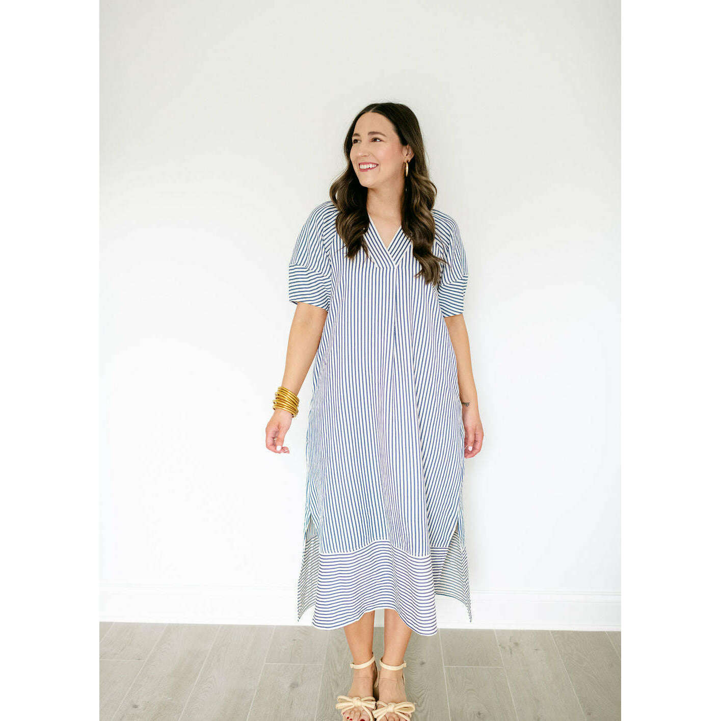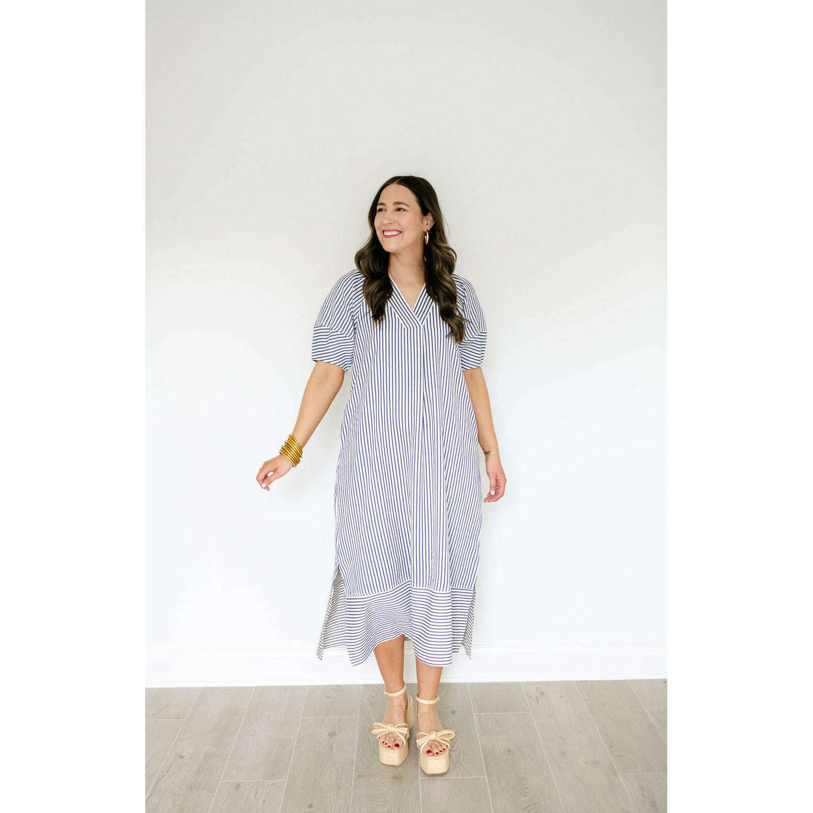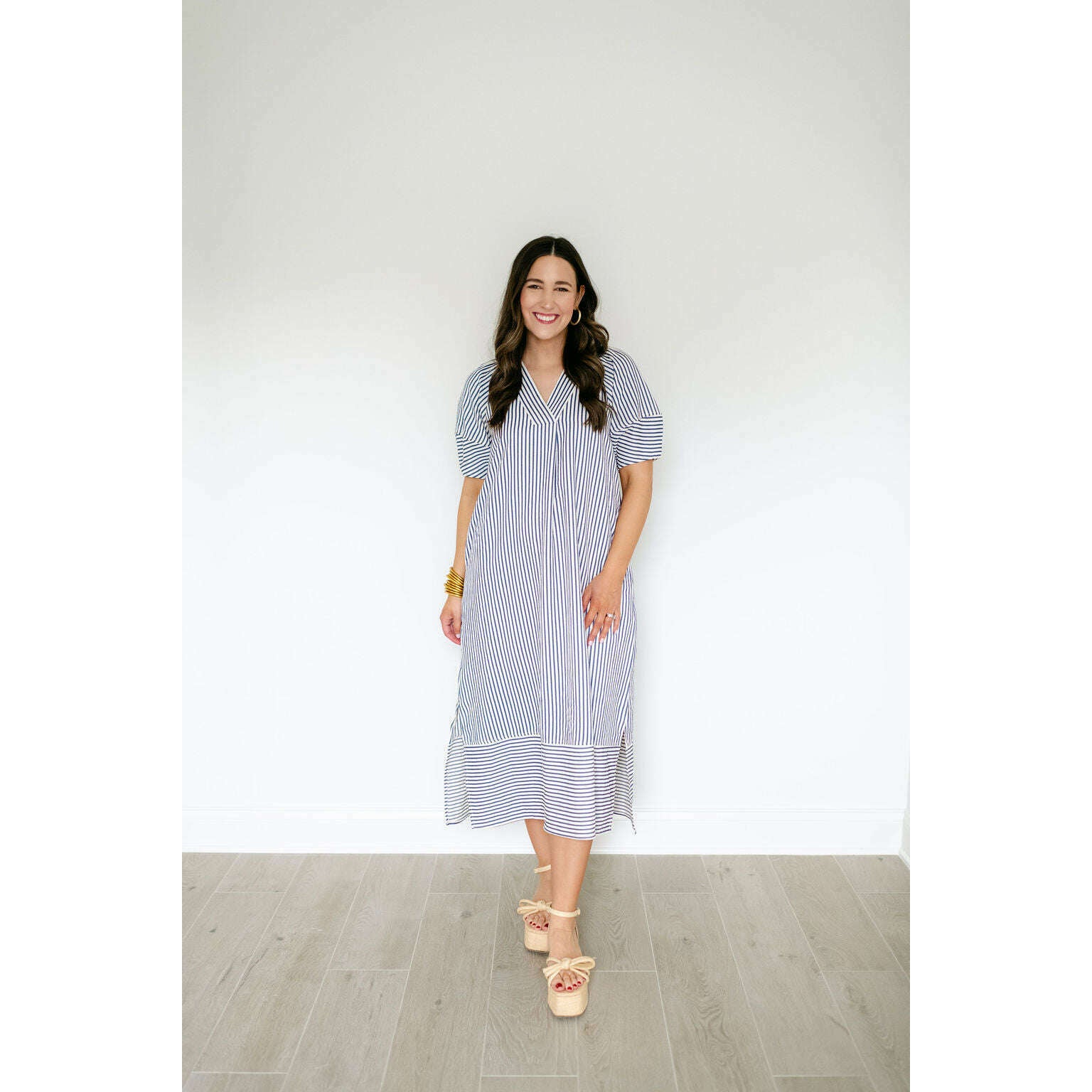 The Entro Blue and White Stripe Midi Dress is the perfect spring essential with its cheerful striped pattern and flattering midi length. This fun piece effortlessly transitions from casual outings to weekend brunches, making it a versatile addition to your wardrobe.