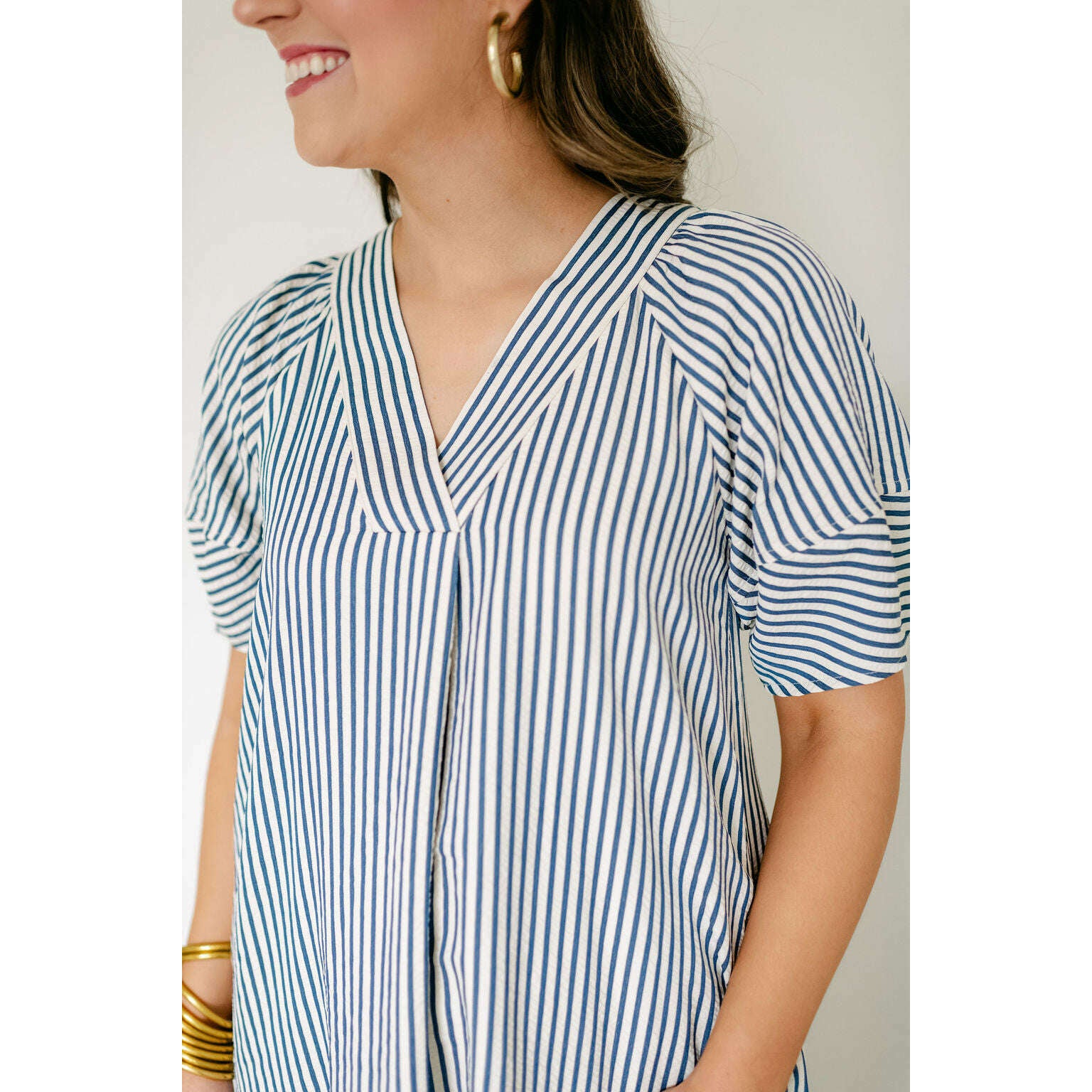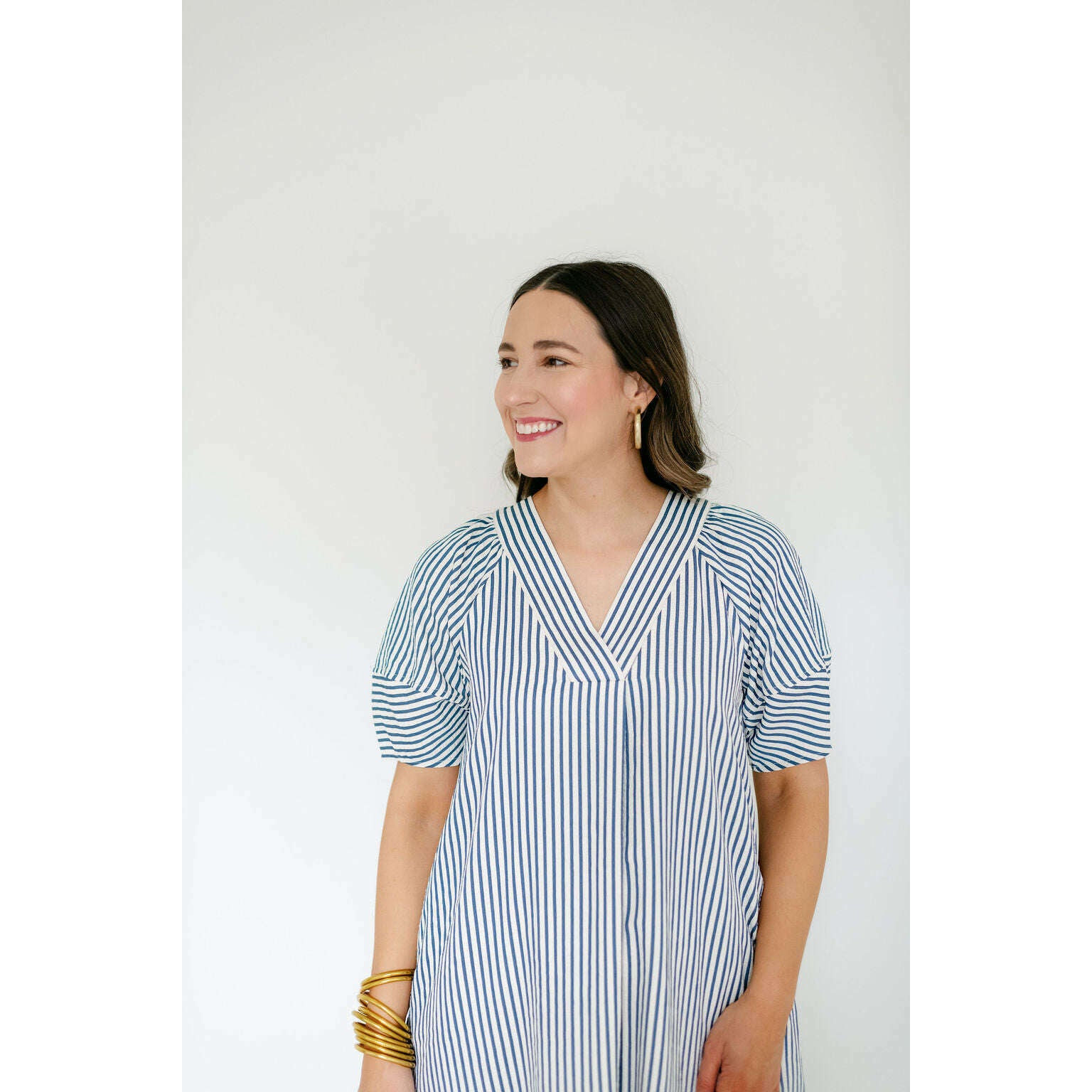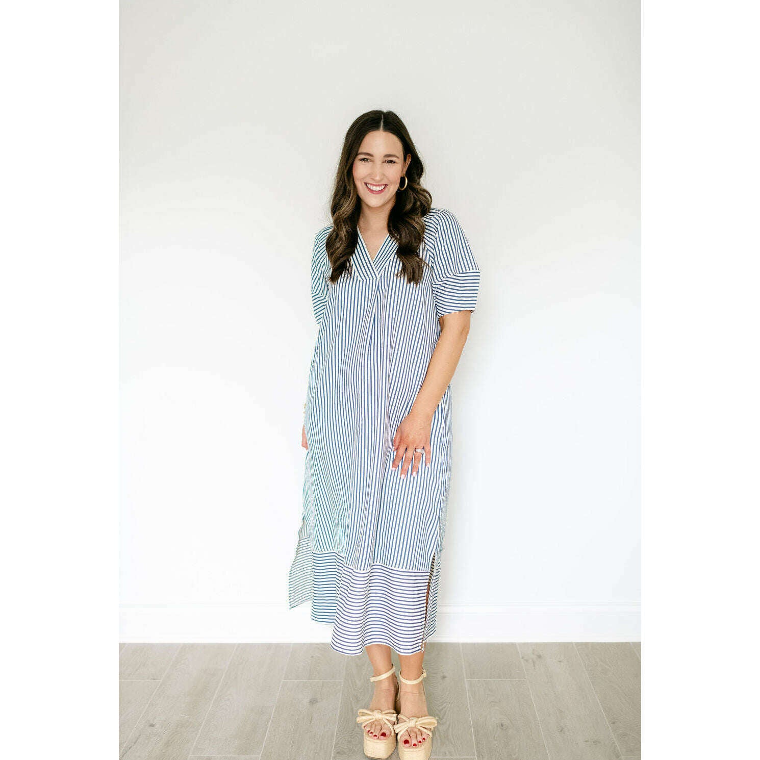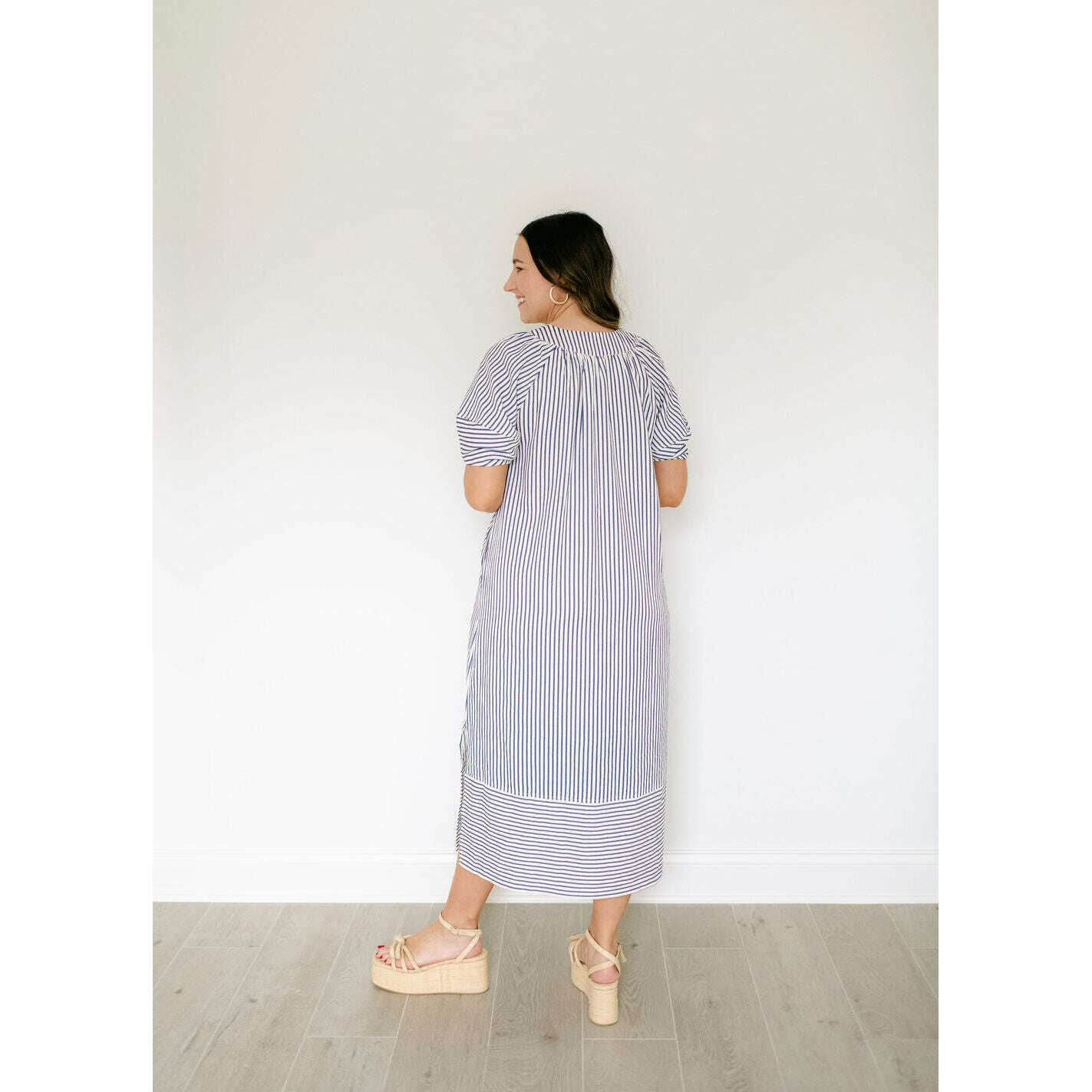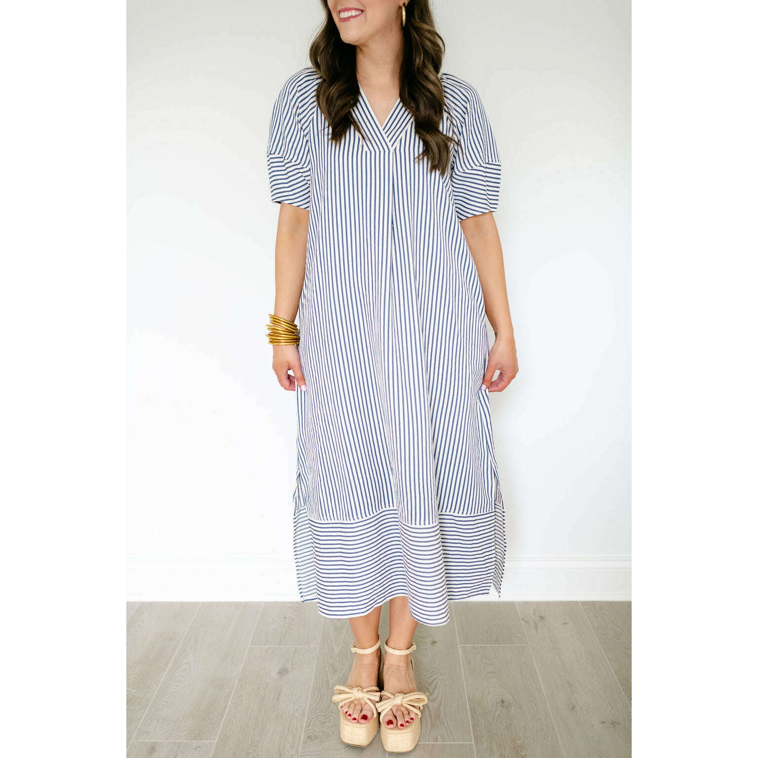 The Entro Blue and White Stripe Midi Dress is the perfect spring essential with its cheerful striped pattern and flattering midi length. This fun piece effortlessly transitions from casual outings to weekend brunches, making it a versatile addition to your wardrobe.