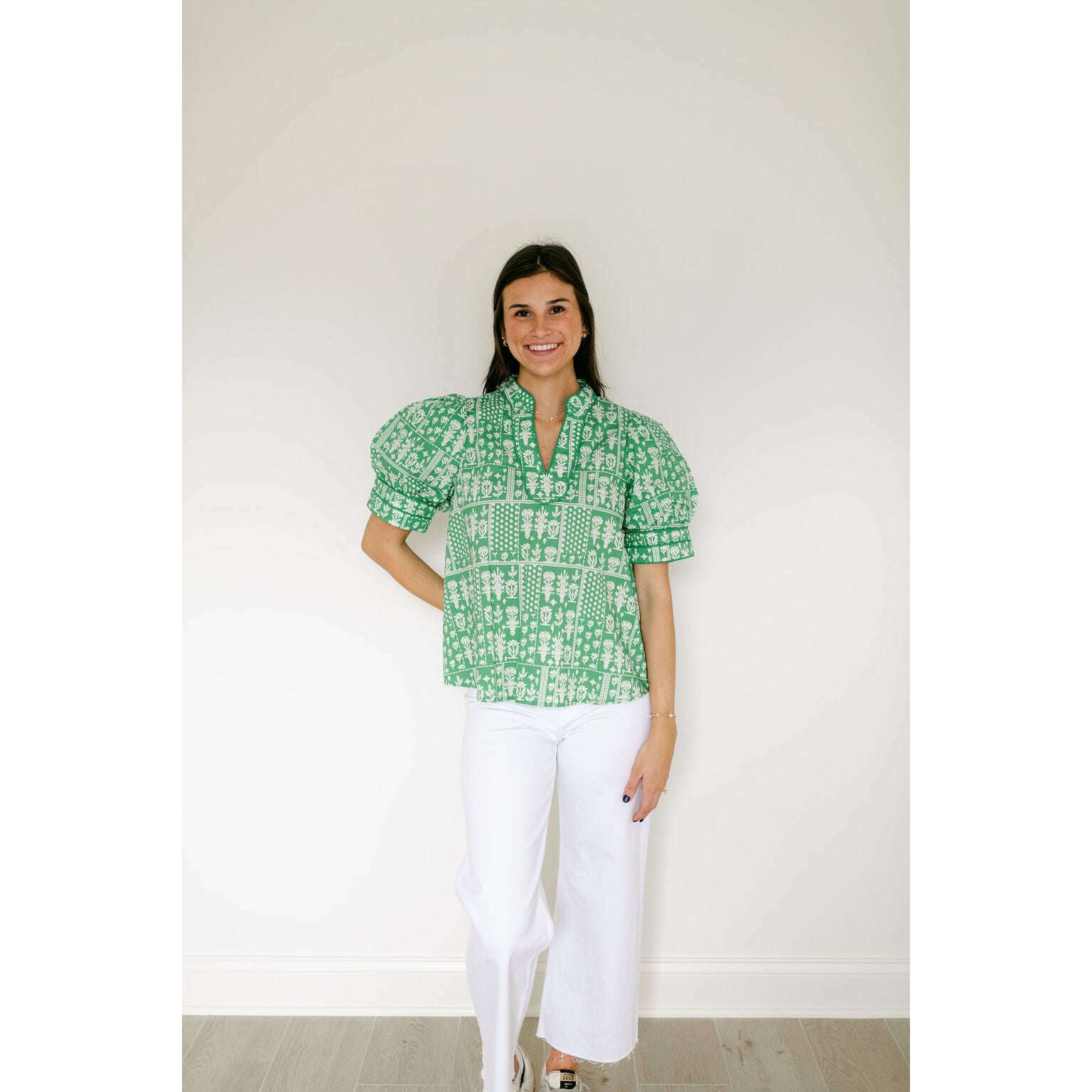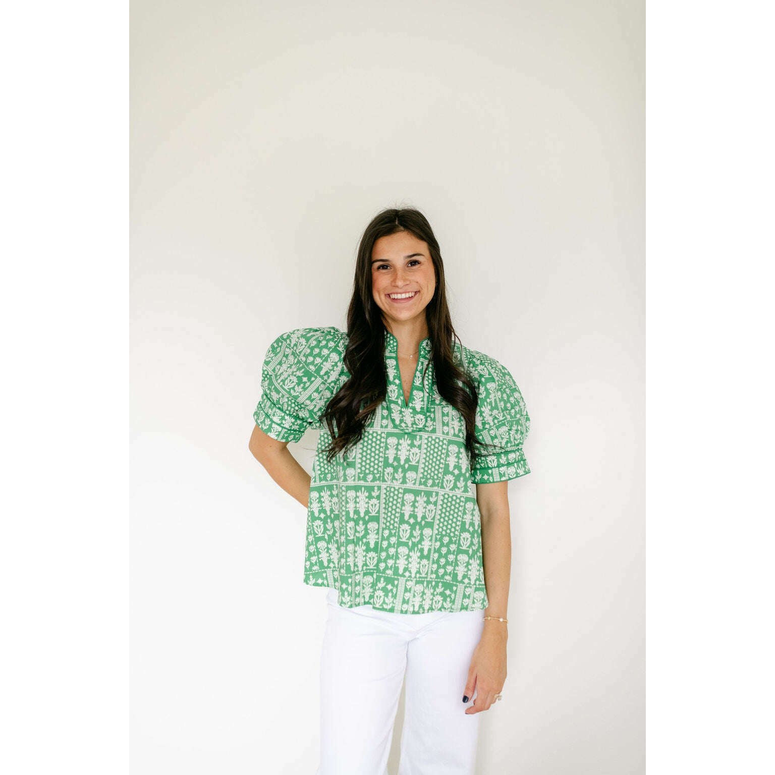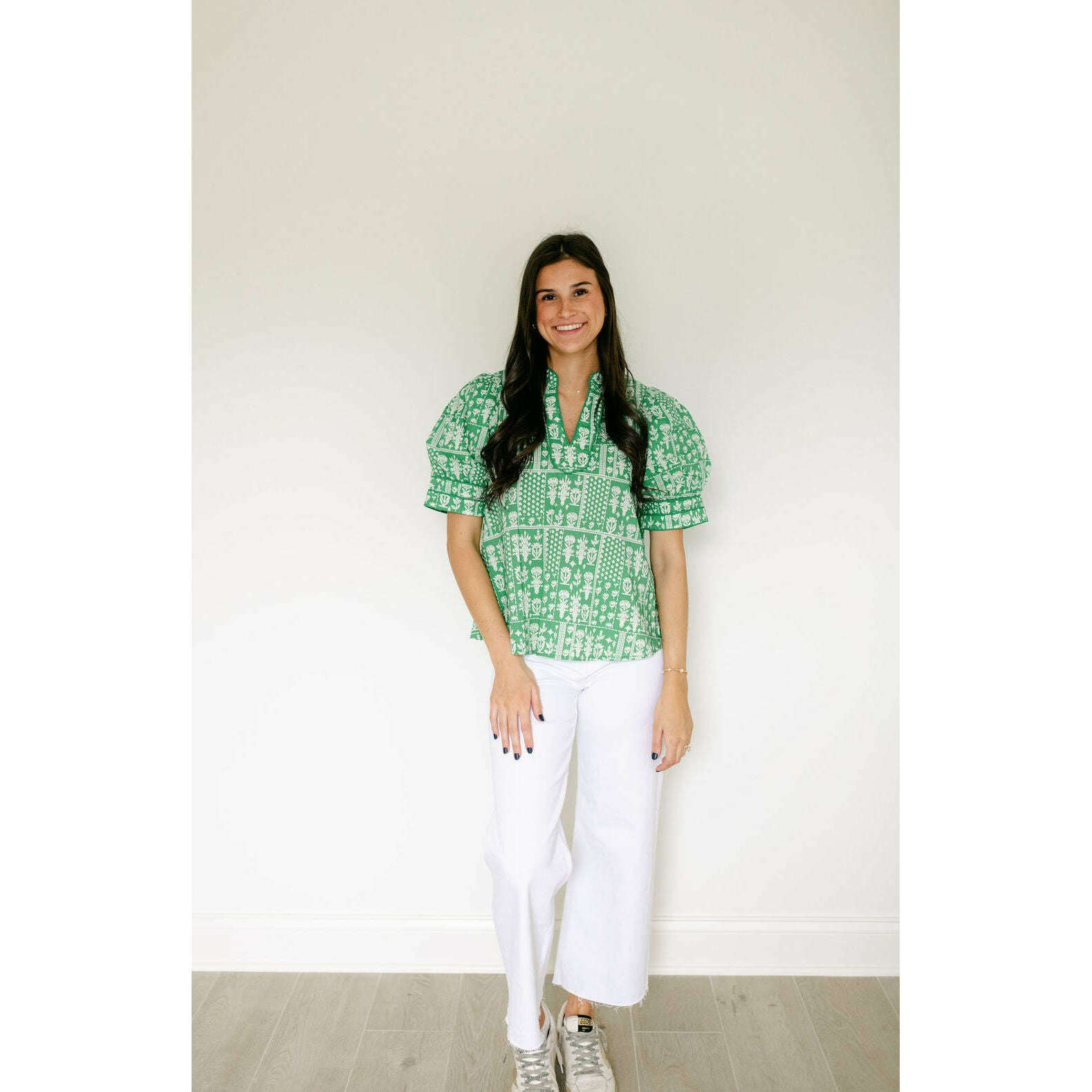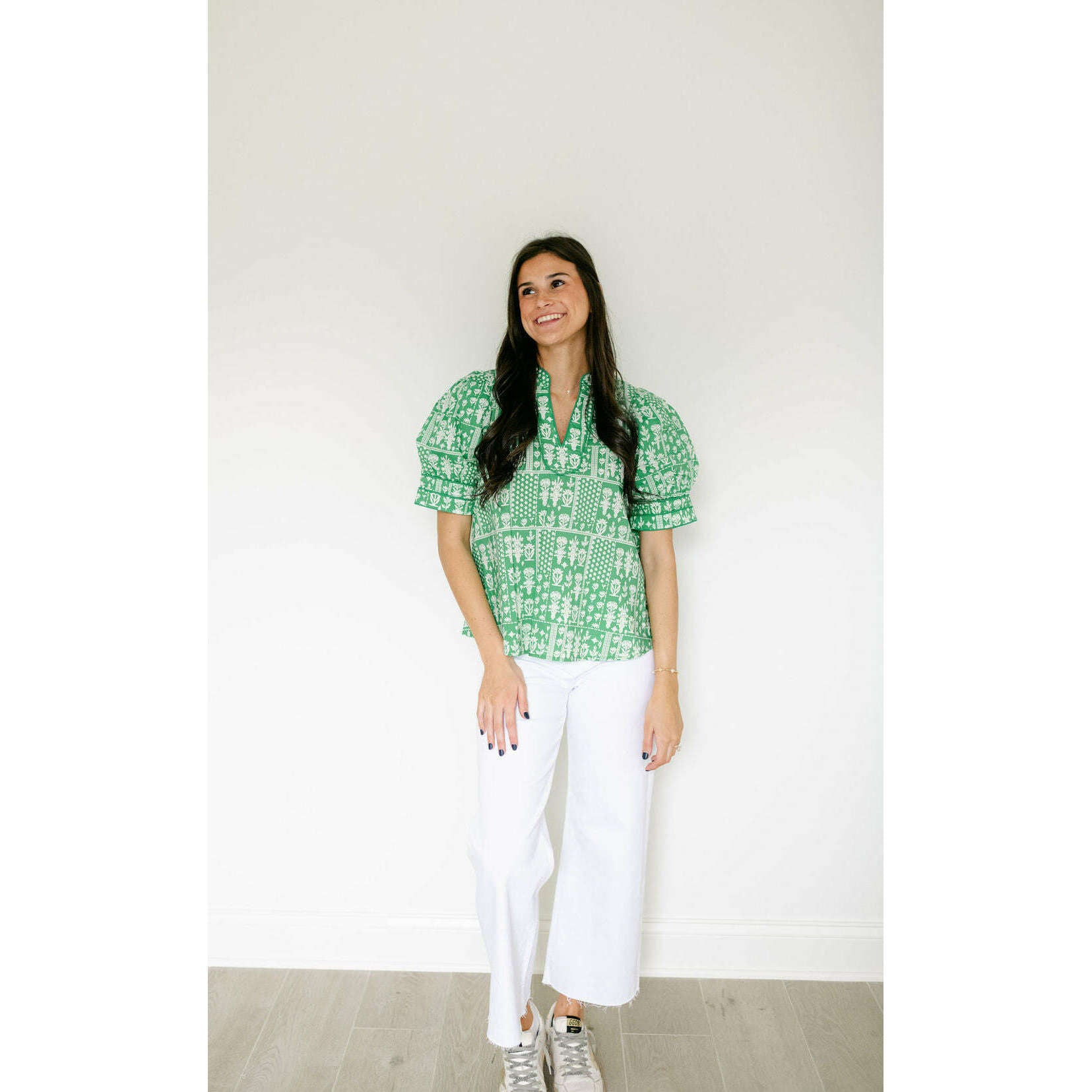 This charming Entro green floral stamp print top is the perfect addition to your spring wardrobe, effortlessly transitioning from casual days to weekend outings. Style it with shorts for a breezy summer look or pair it with white denim for a crisp, put-together aesthetic that works year-round.