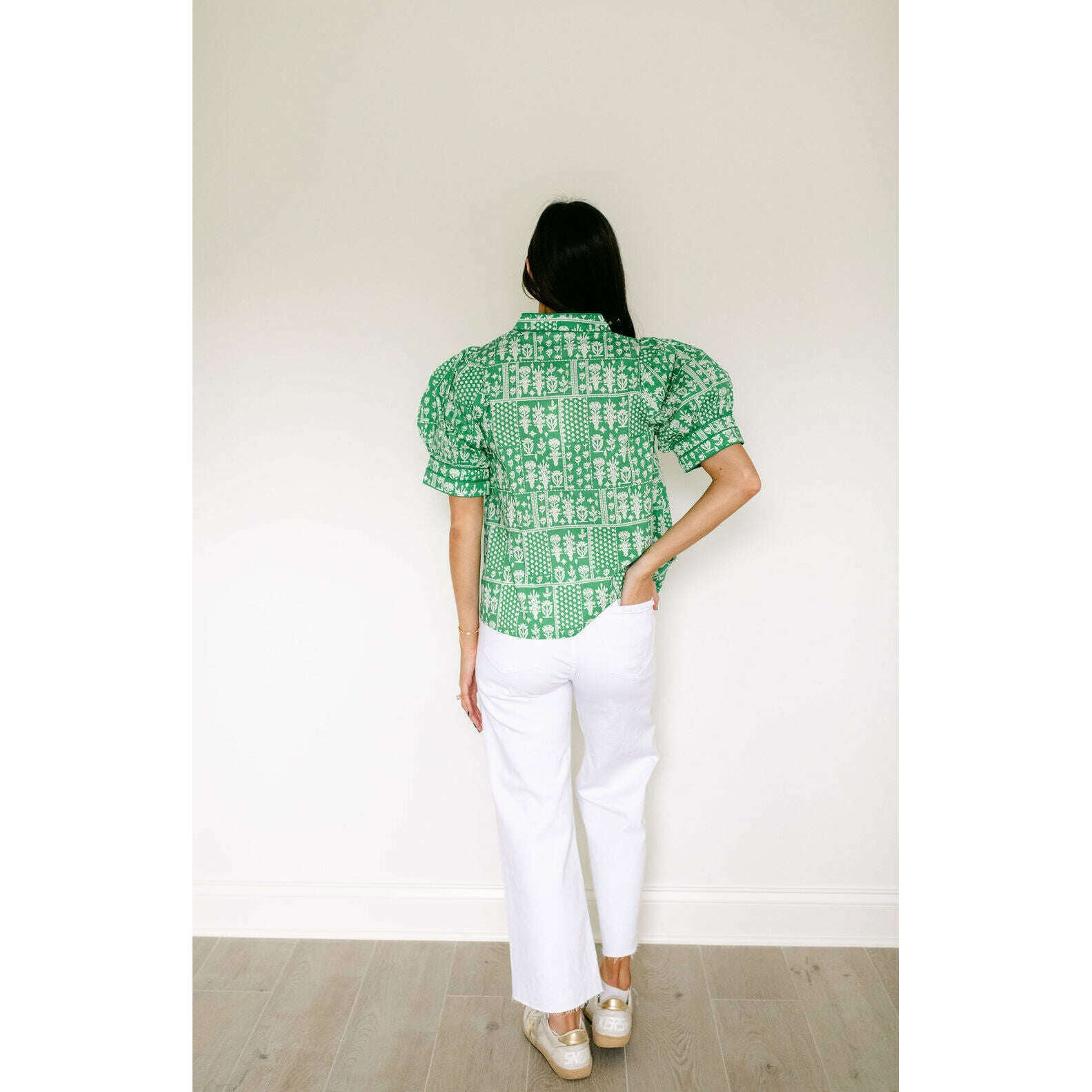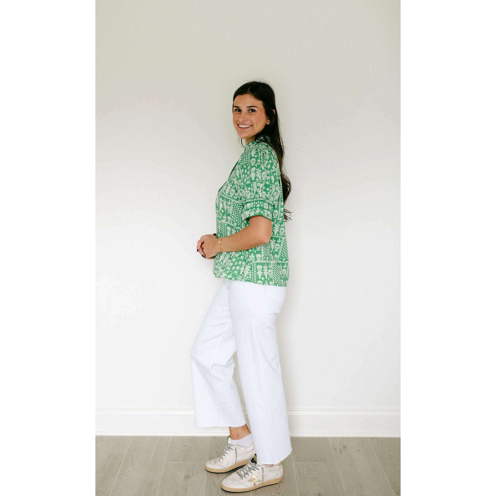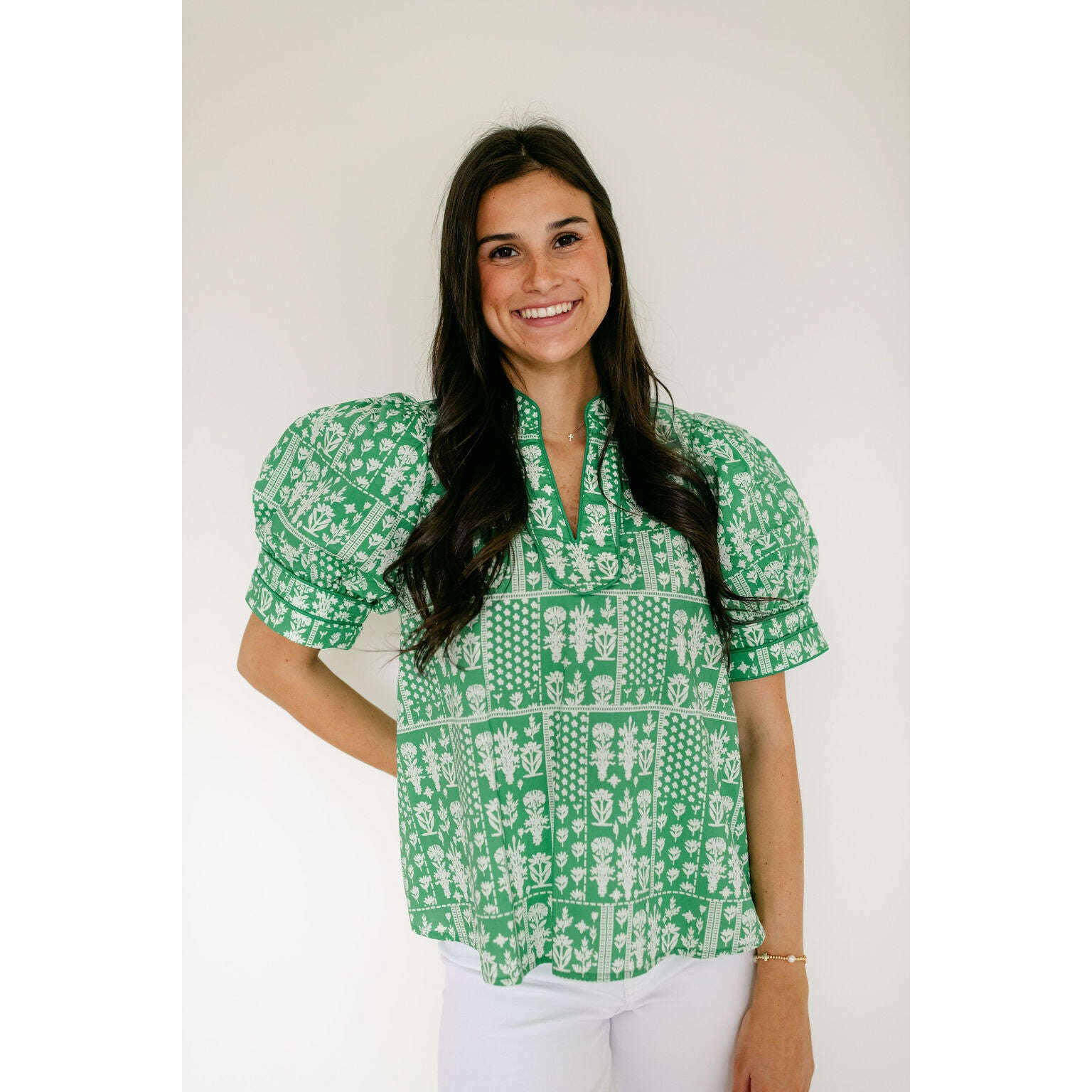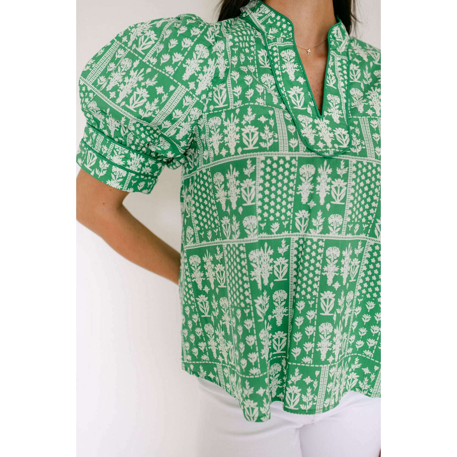 This charming Entro green floral stamp print top is the perfect addition to your spring wardrobe, effortlessly transitioning from casual days to weekend outings. Style it with shorts for a breezy summer look or pair it with white denim for a crisp, put-together aesthetic that works year-round.