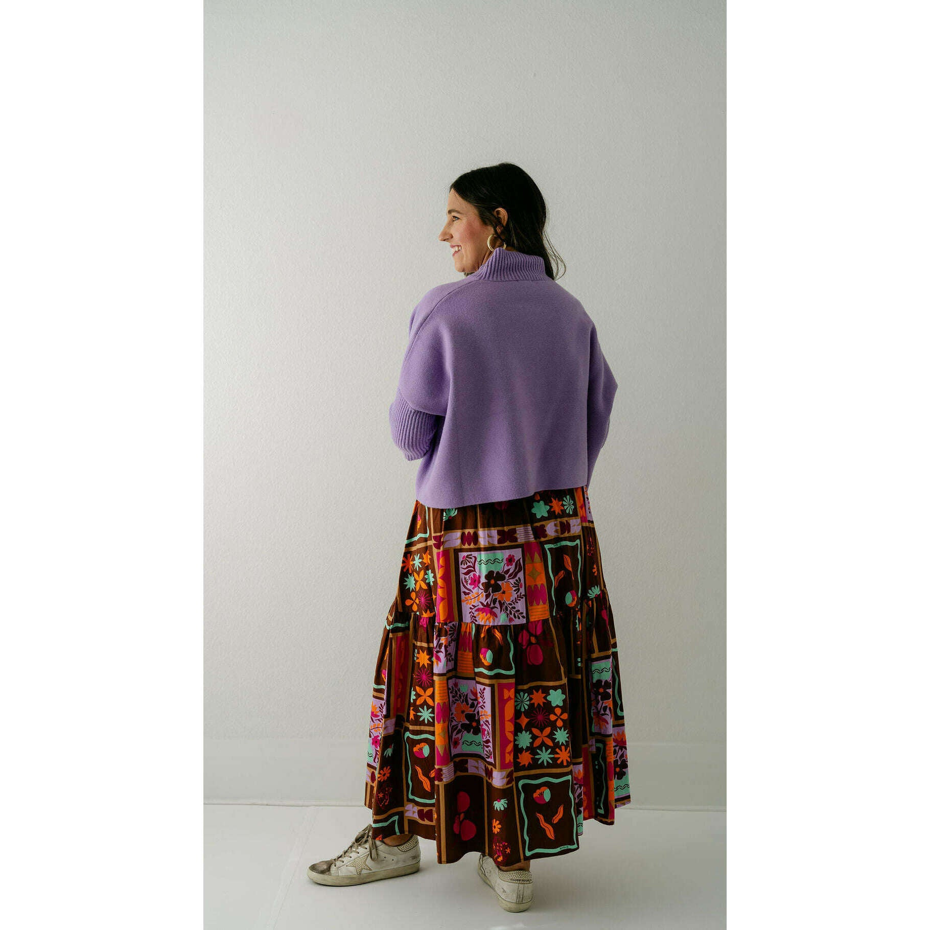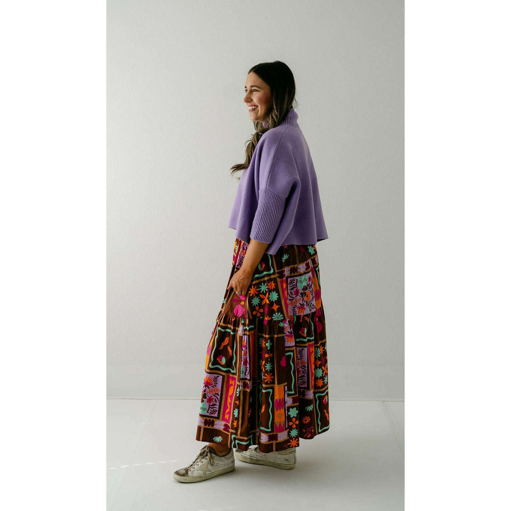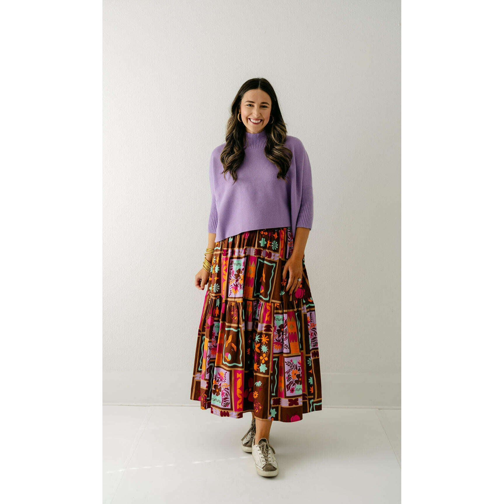 The Karlie Brown Floral Frame Tiered Smocked Maxi Skirt is a delightful wardrobe essential featuring an enchanting botanical print that brings joy and personality to your everyday style. Complete your look by styling it with an Aja sweater!