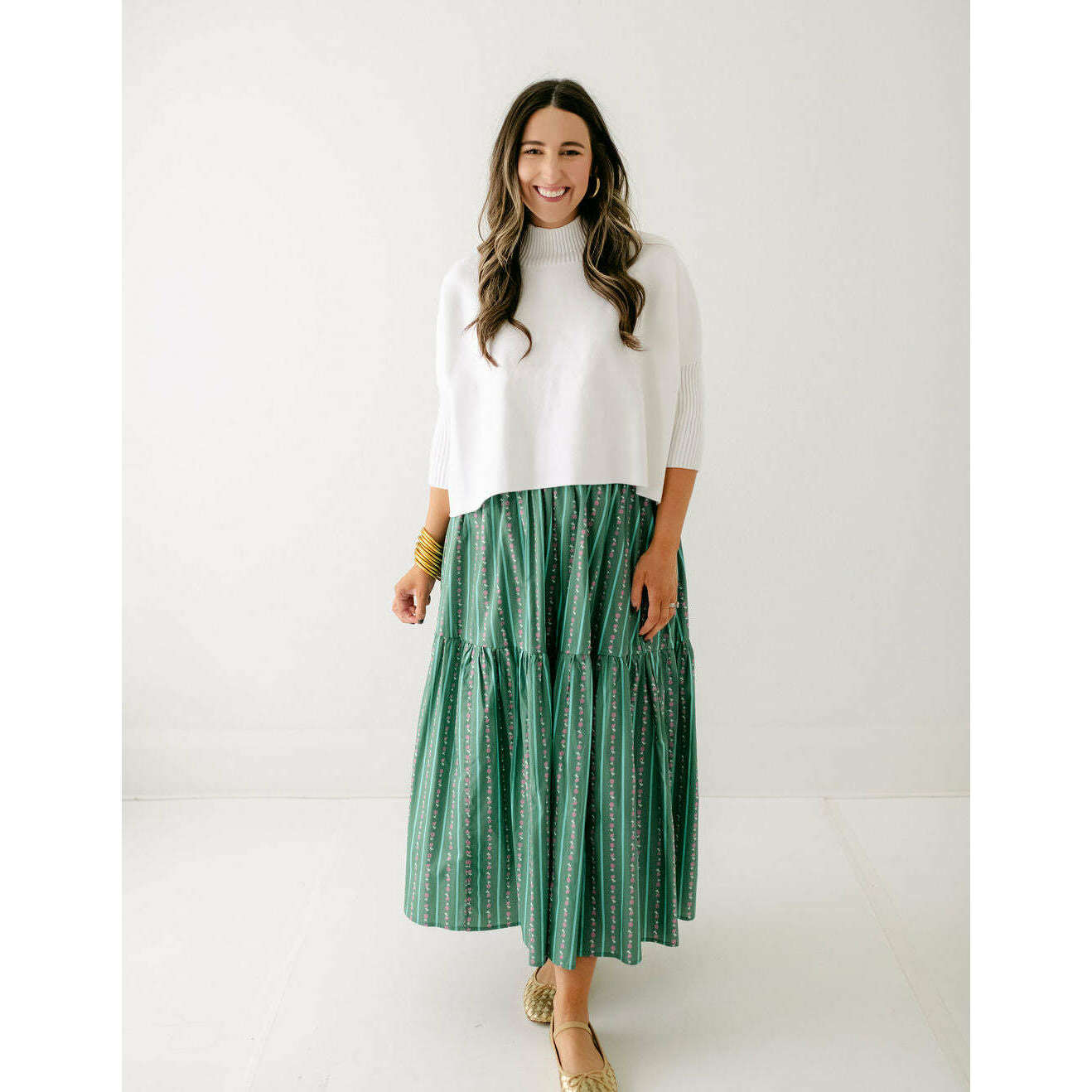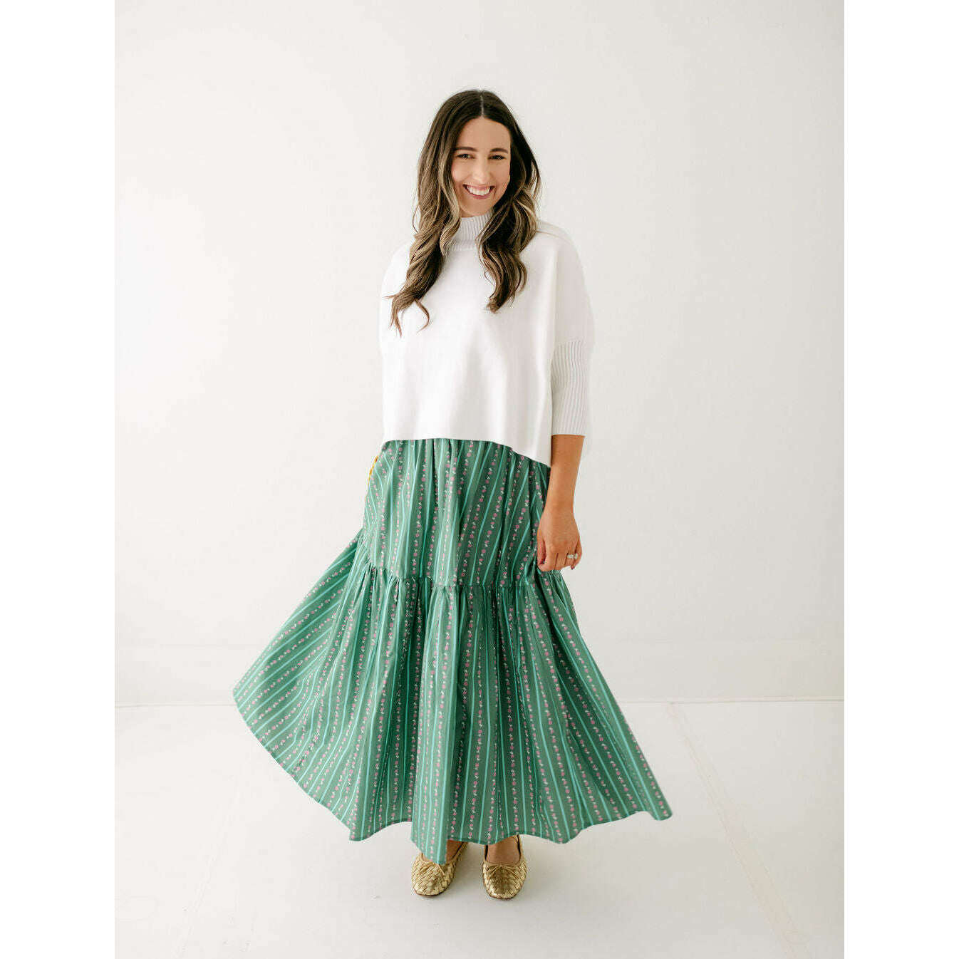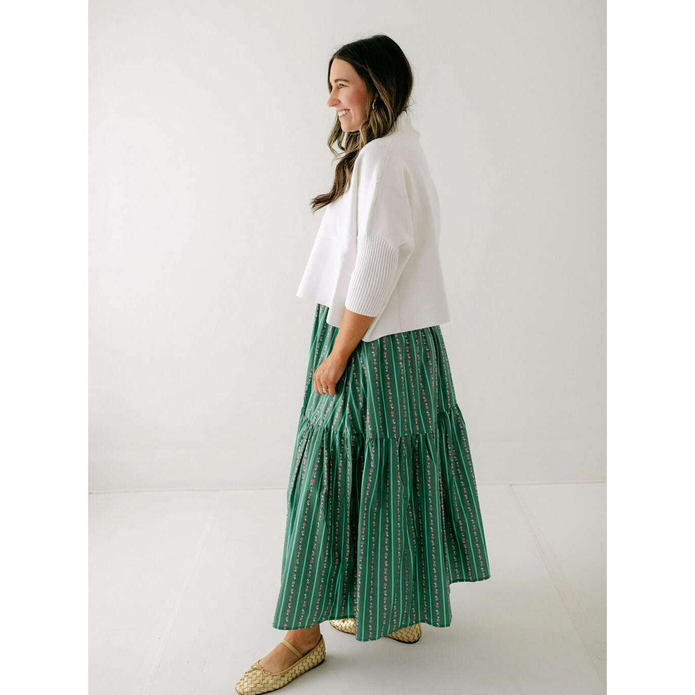 Embrace effortless fall style with this charming Karlie Floral Stripe Tiered Smocked Maxi Skirt. The delightful floral and stripe print brings playful personality to your seasonal wardrobe, while the tiered silhouette and smocked waistband create a flattering, comfortable fit. Perfect for layering over your favorite sweater—pair it with our Kerisma Aja Sweater in white for an instantly polished look. Whether you're heading to brunch or a casual gathering, this versatile maxi skirt delivers the perfect blend of fun and sophistication.