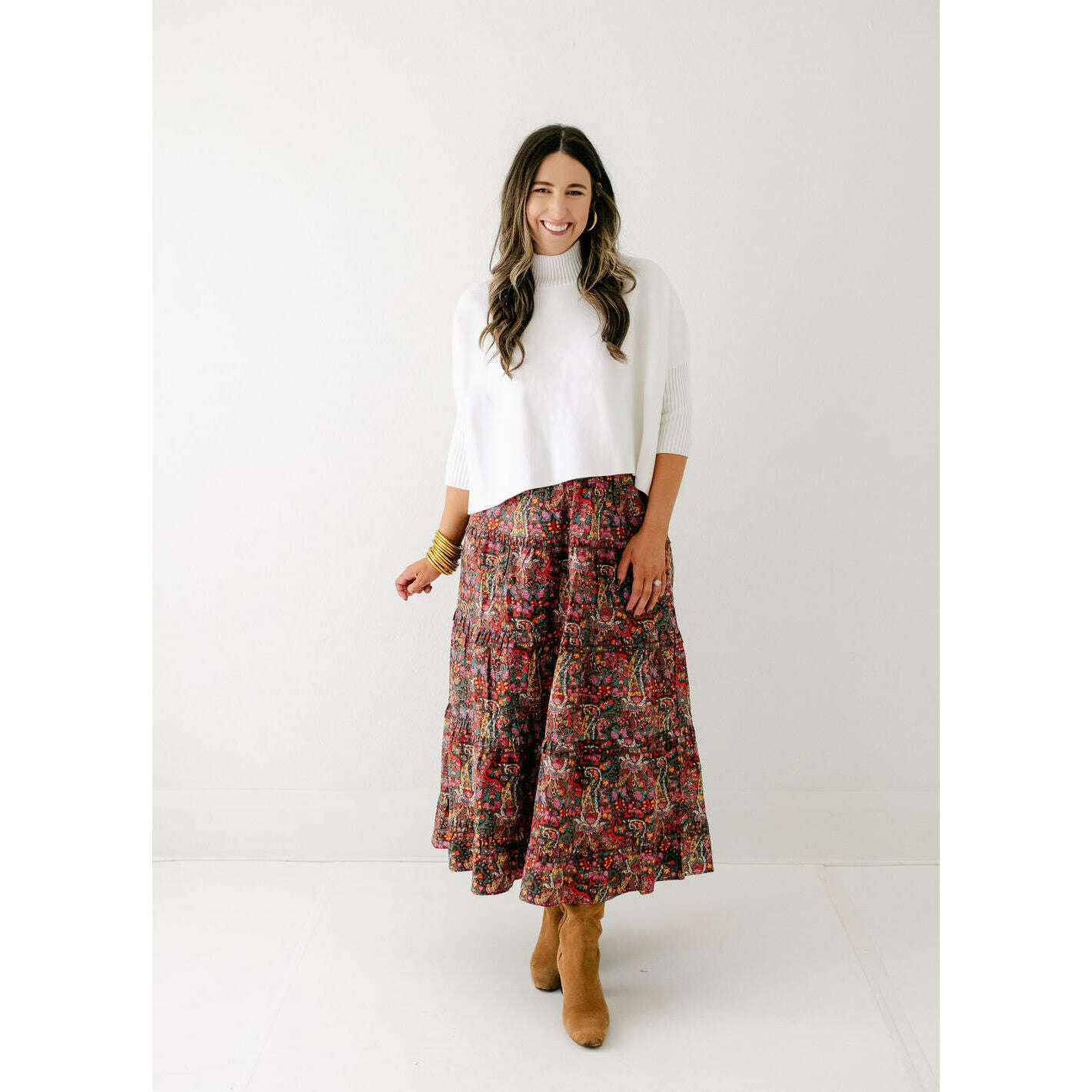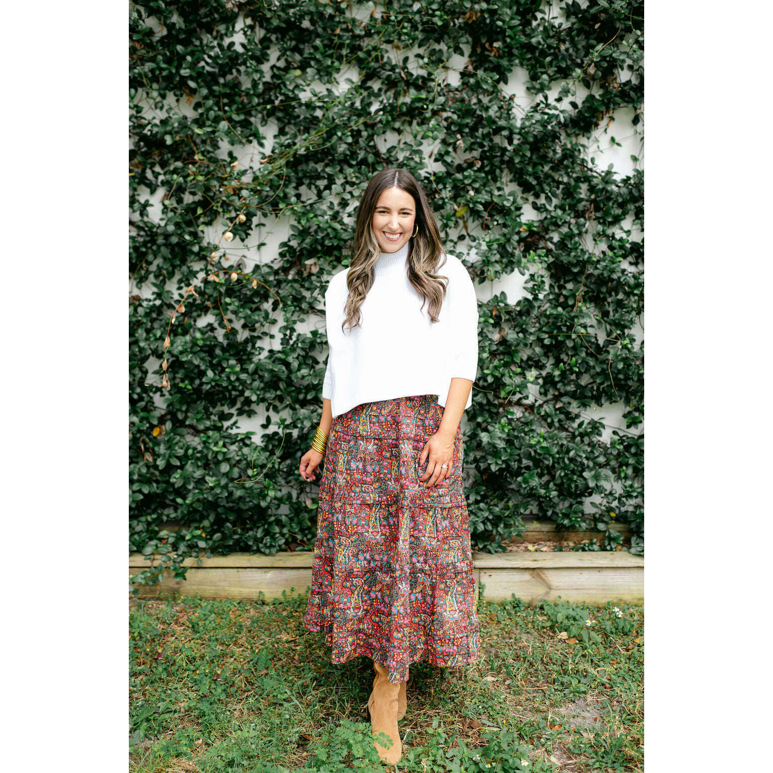 Elevate your fall wardrobe with the Love the Label Genevieve Maxi Skirt in Harlequin Print—a playful statement piece that brings instant personality to any outfit. The bold geometric pattern pairs beautifully with neutral basics like the Kerisma Aja Sweater in white, creating a perfectly balanced look that's both chic and effortlessly fun. Whether you're heading to brunch or a casual weekend gathering, this skirt is your go-to for turning heads with style.