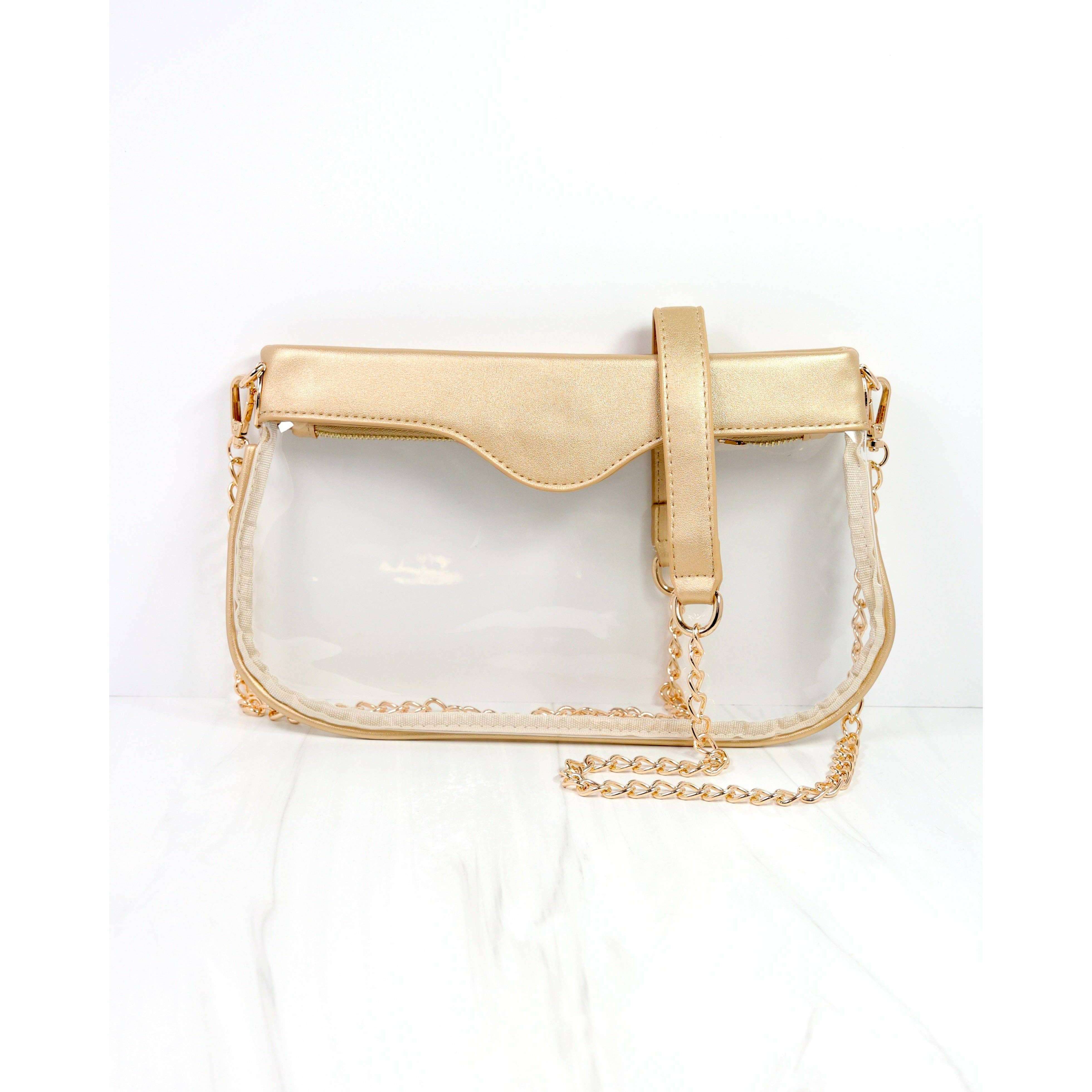 The Madi Clear Crossbody in Gold is the perfect accessory for game day, combining style and practicality. Its transparent design meets stadium requirements, while the chic chain strap adds a fashionable touch. Easily pair it with our purse chains, nylon strap, or Molly Card Holder to customize your look and keep essentials close at hand.