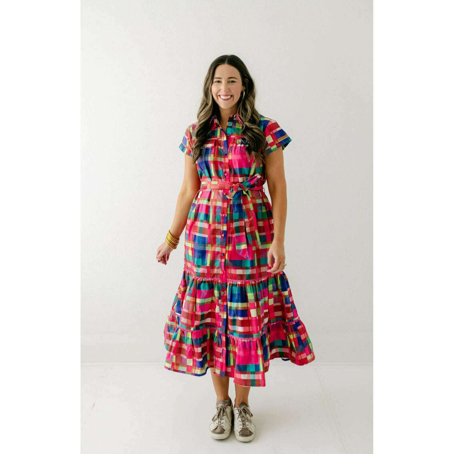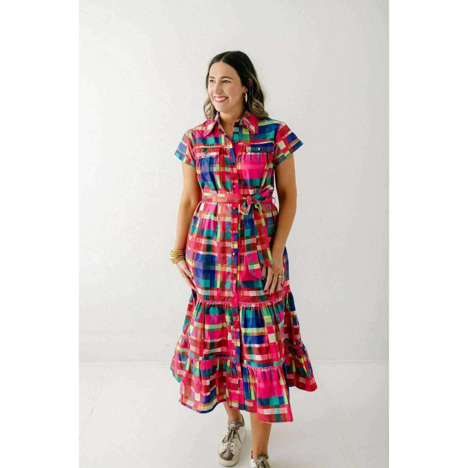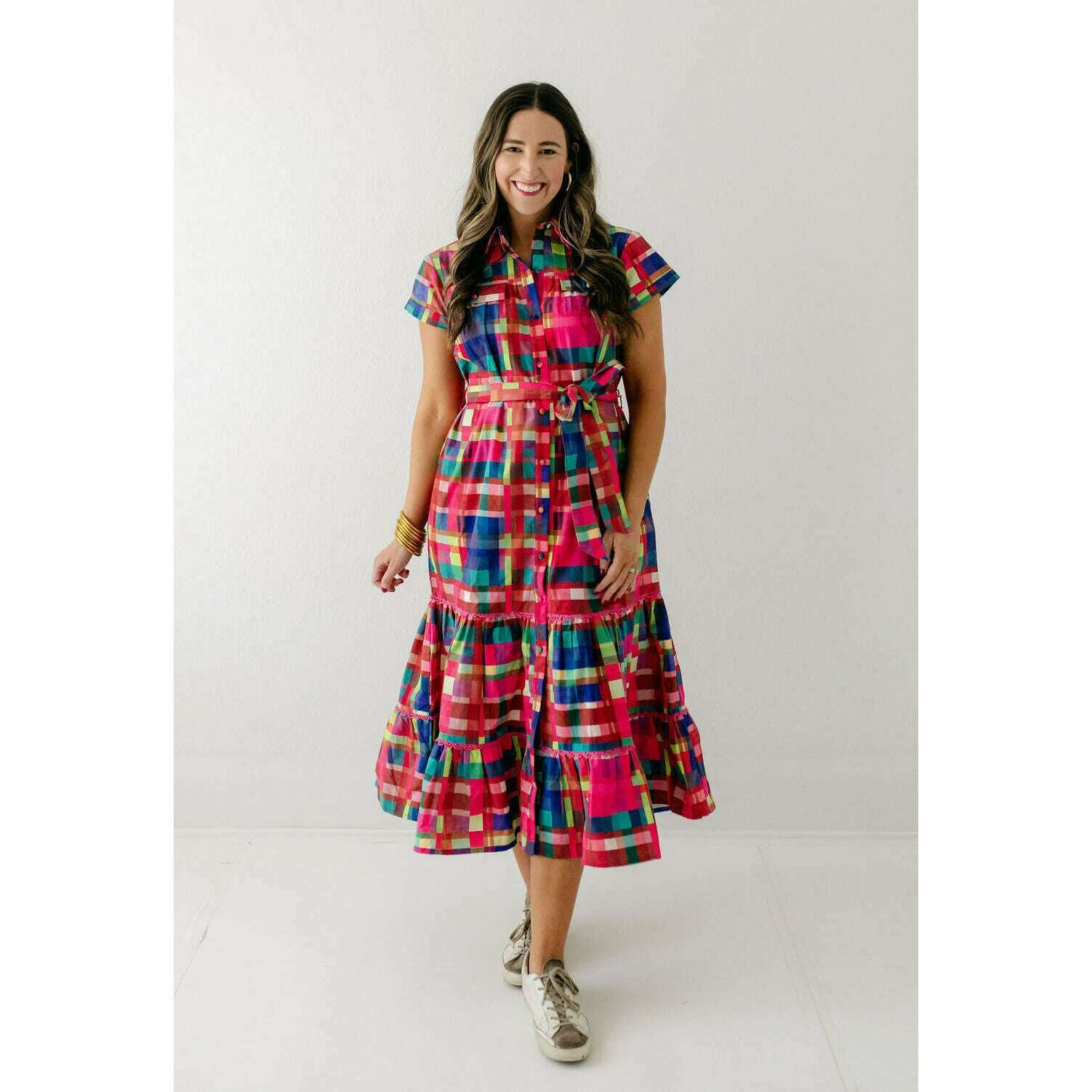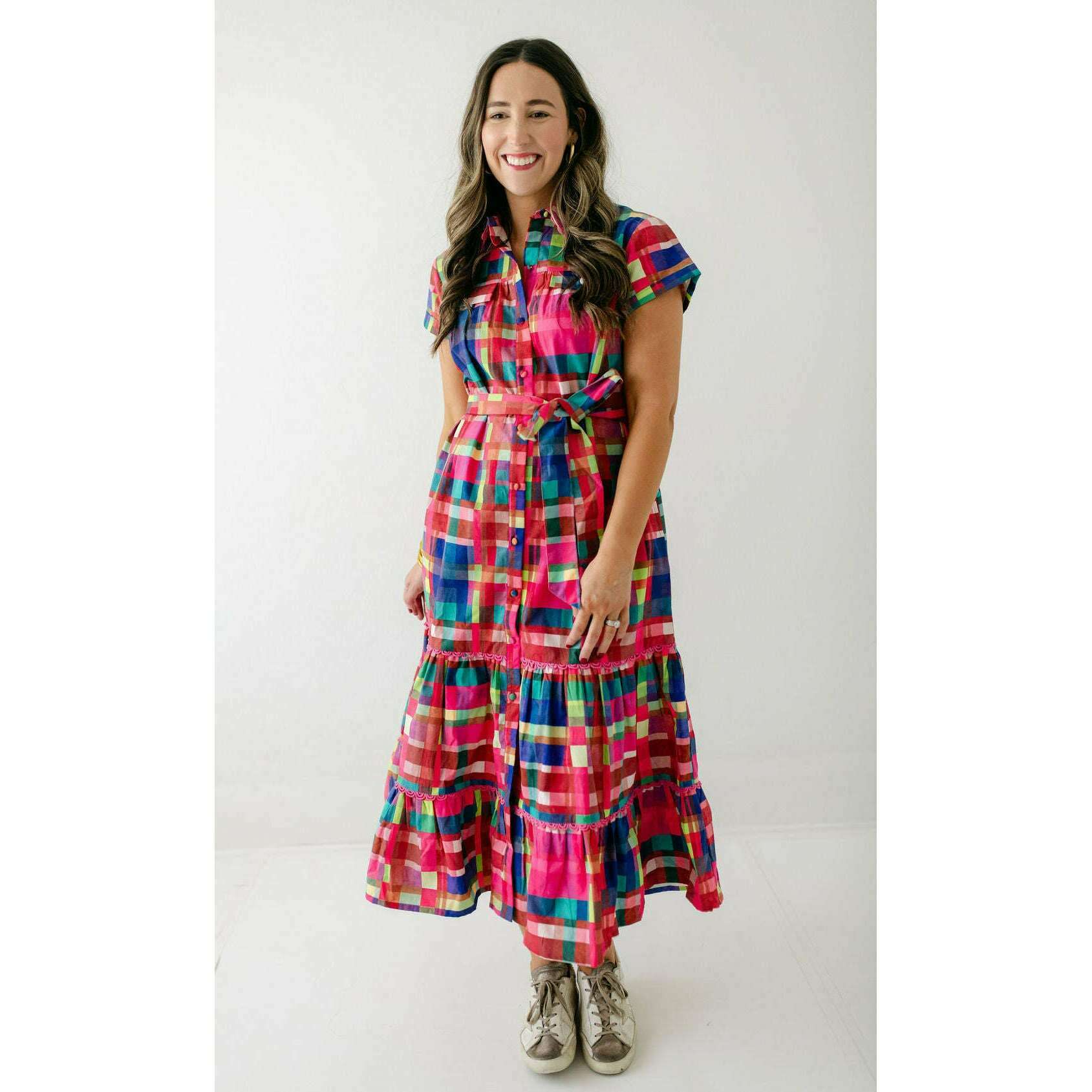 This Alden Adair dress is perfect for any occasion, offering unbeatable style that will leave you feeling confident and fabulous. The Rachel is a short sleeve button down dress with a matching adjustable belt and tiered skirt - in our Circus Plaid print!