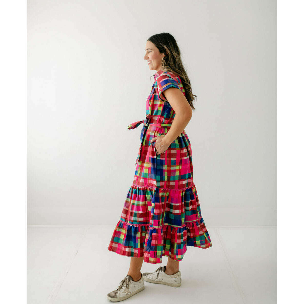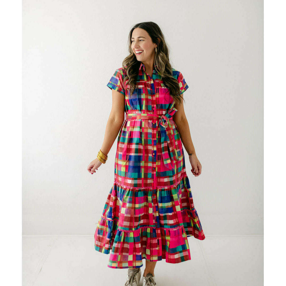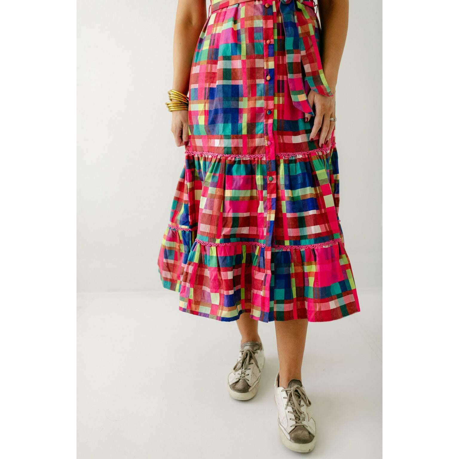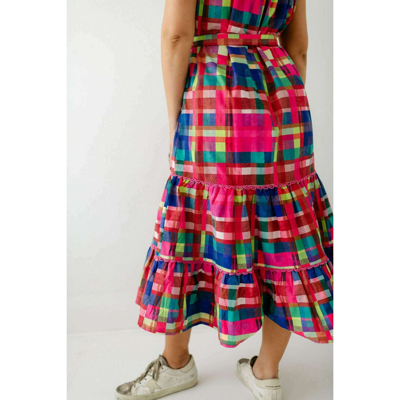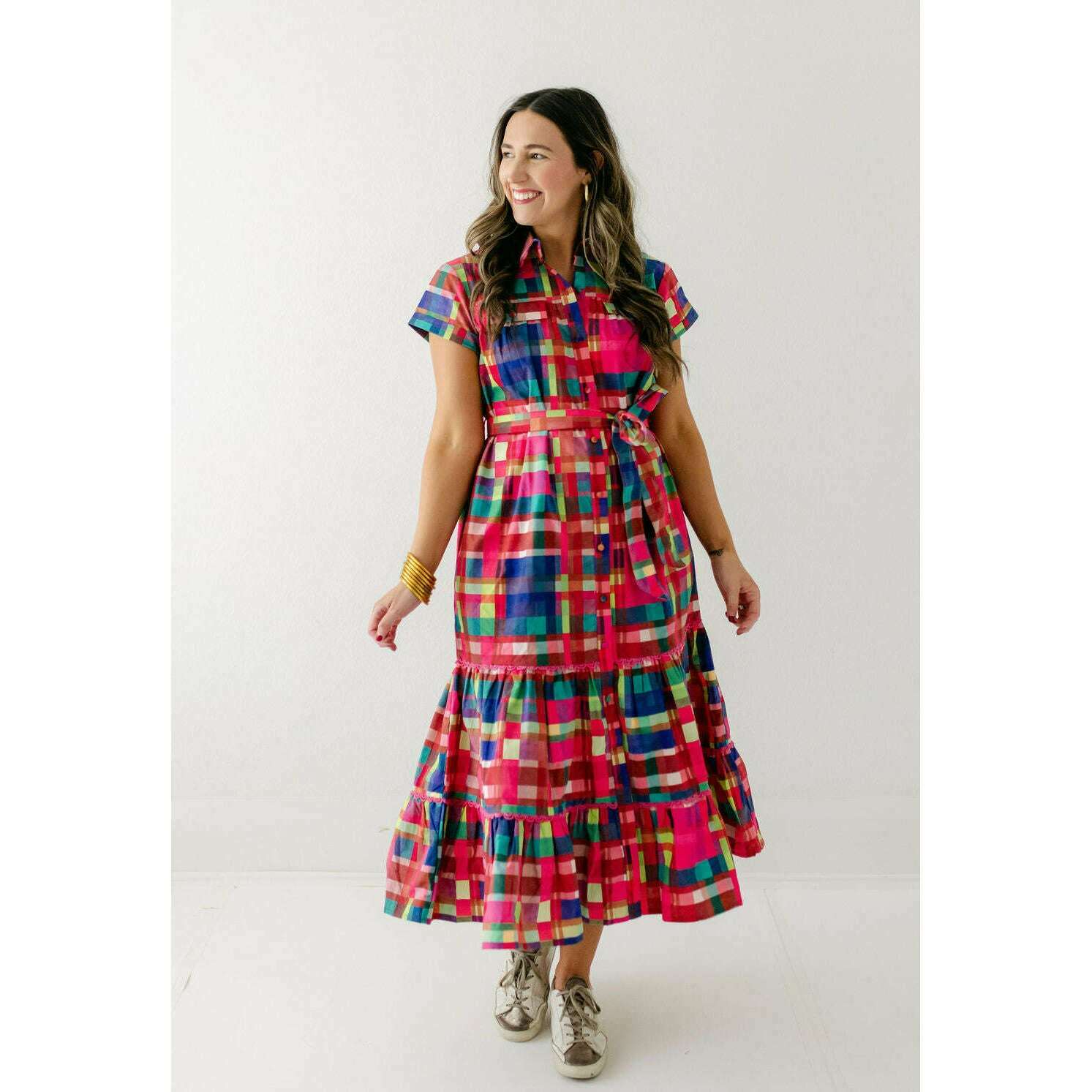 This Alden Adair dress is perfect for any occasion, offering unbeatable style that will leave you feeling confident and fabulous. The Rachel is a short sleeve button down dress with a matching adjustable belt and tiered skirt - in our Circus Plaid print!