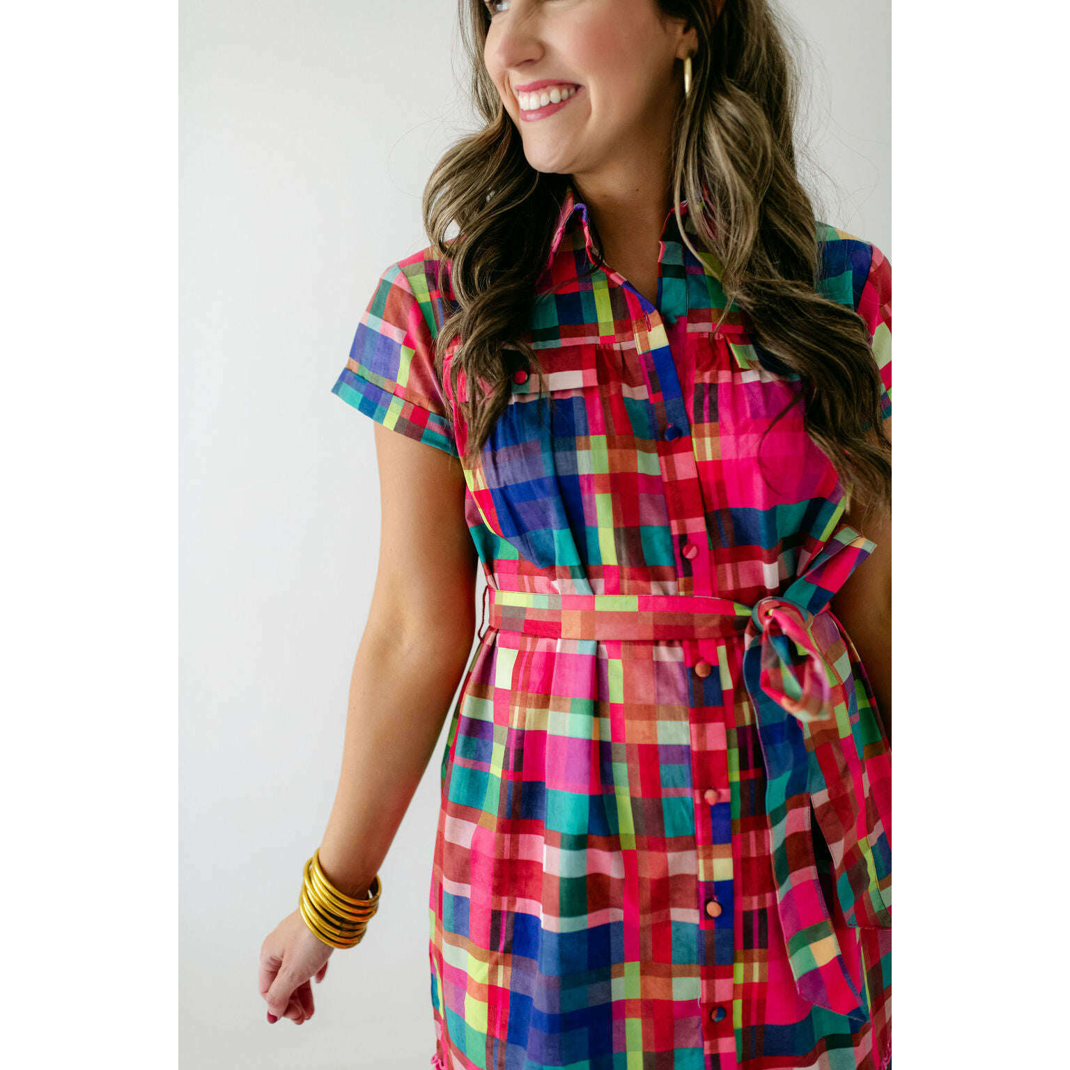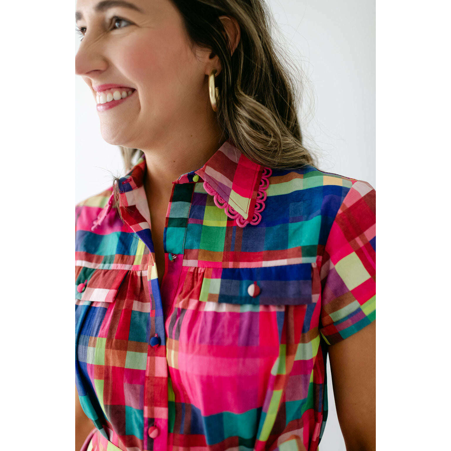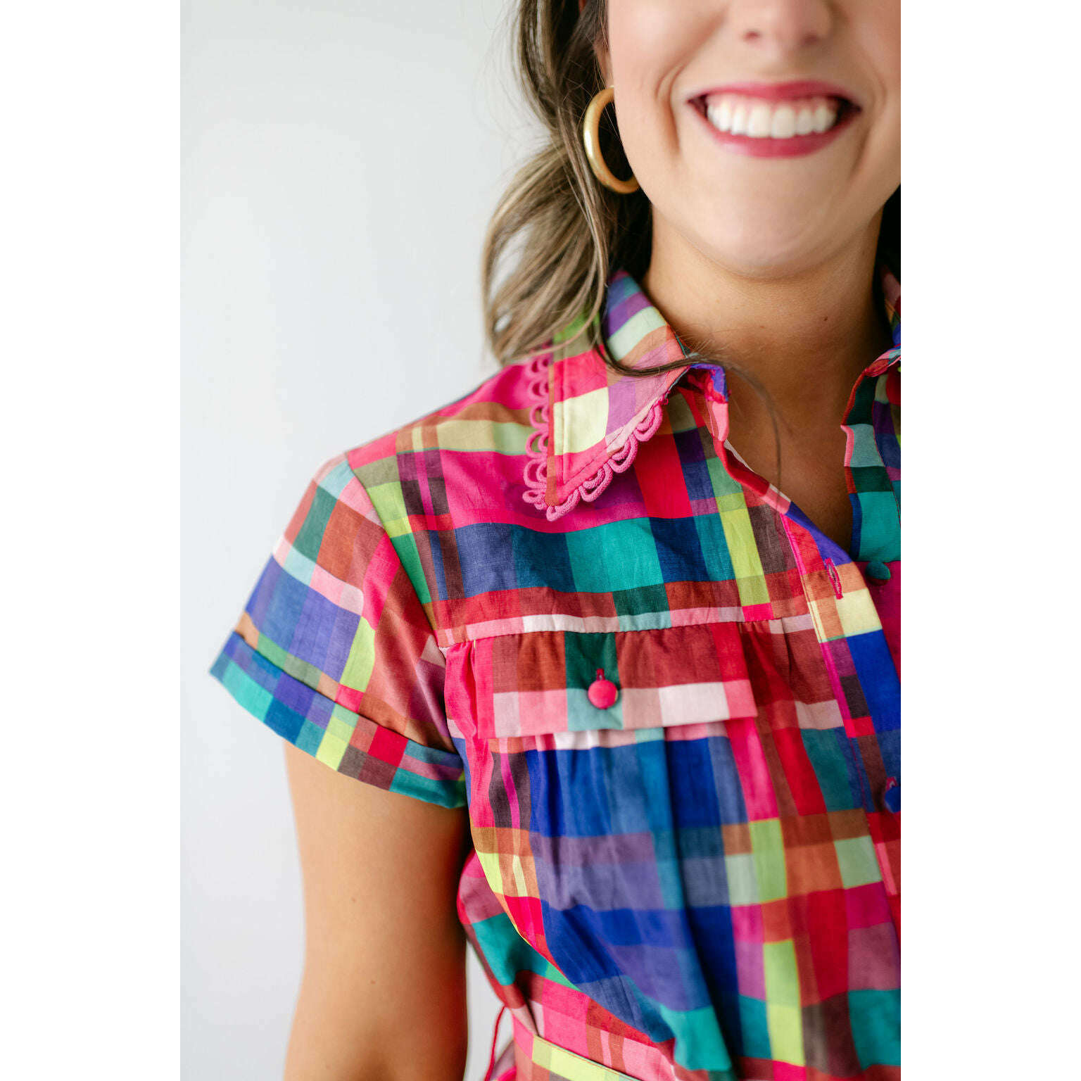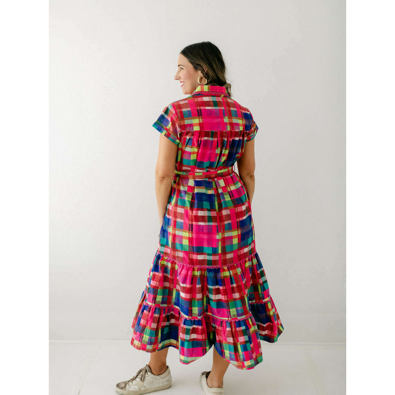 This Alden Adair dress is perfect for any occasion, offering unbeatable style that will leave you feeling confident and fabulous. The Rachel is a short sleeve button down dress with a matching adjustable belt and tiered skirt - in our Circus Plaid print!