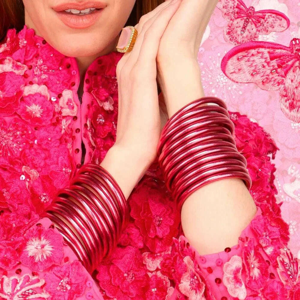 BuDhaGirl Pink All Weather Bangles® (AWB®), are the epitome of luxury in BuDhaGirl's impressive lifestyle collection, boasting a crazy-pretty pink a la Schiaparelli!  Our remarkable bangles redefine elegance with their weightless, soundless, waterproof, and TSA-proof design. Crafted to perfection, each set comprises six bangles, symbolizing intentions for the day. Wear them anywhere, as their soundless and waterproof nature ensures seamless integration into any setting.