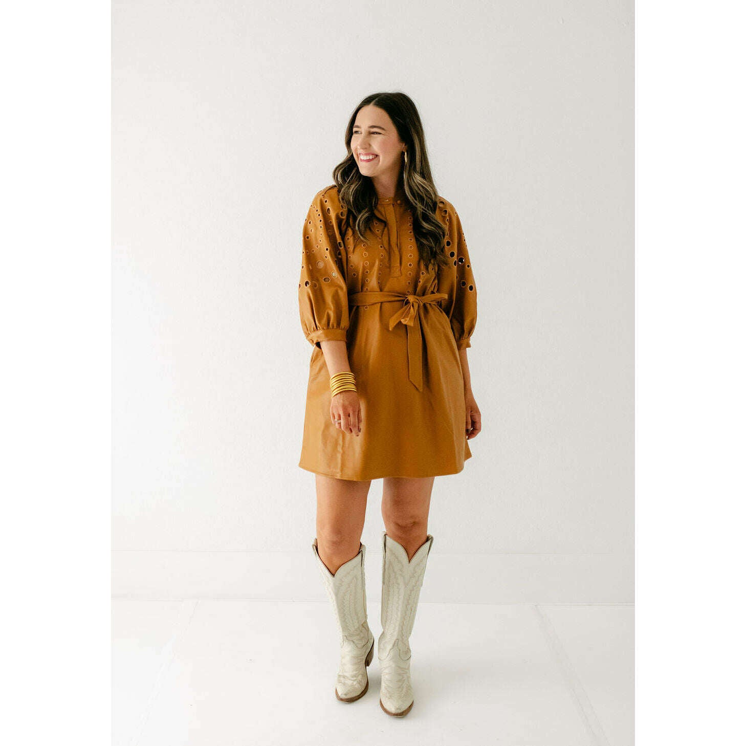Ciebon Embroidered Faux Leather Shirt Dress in Tan