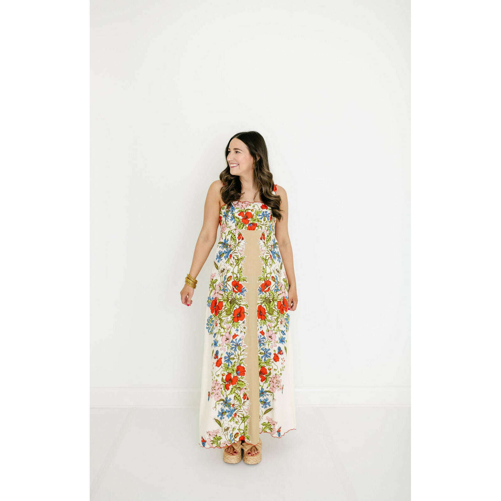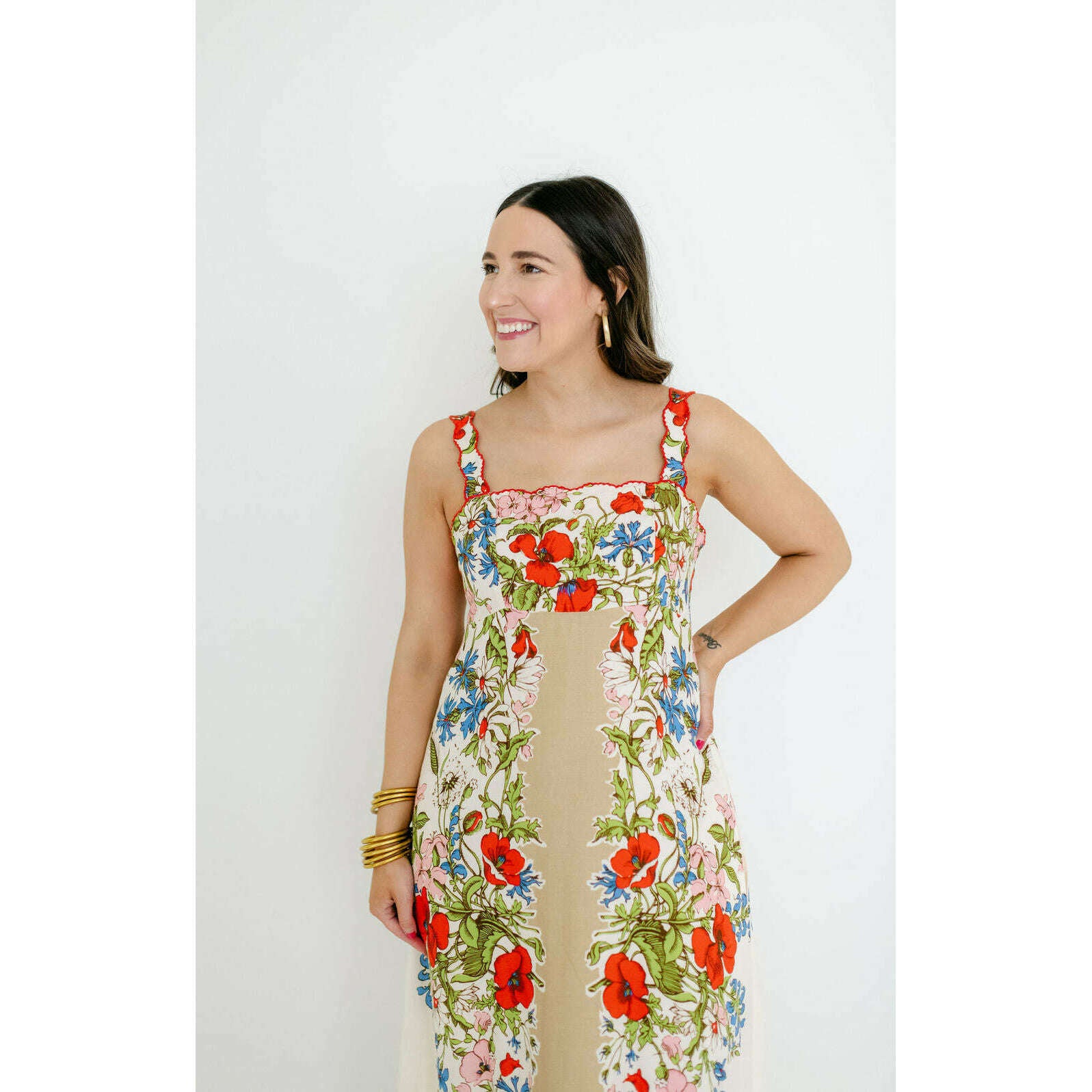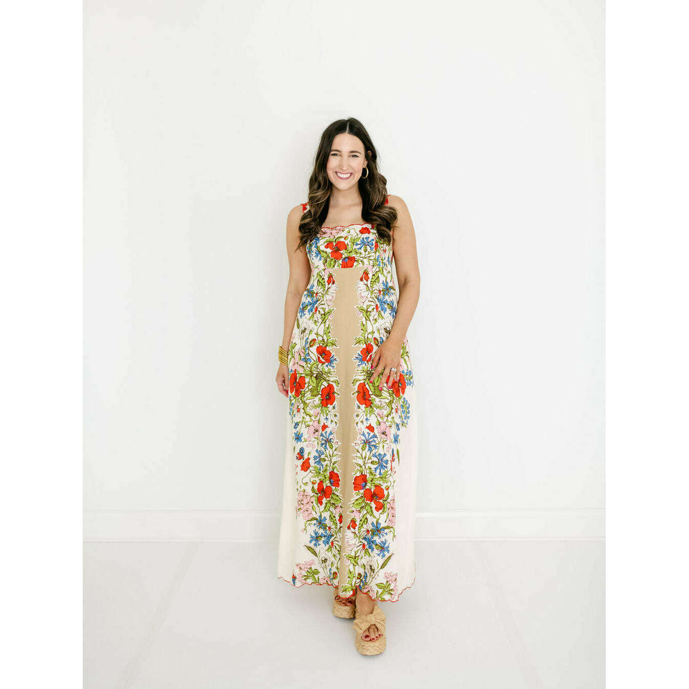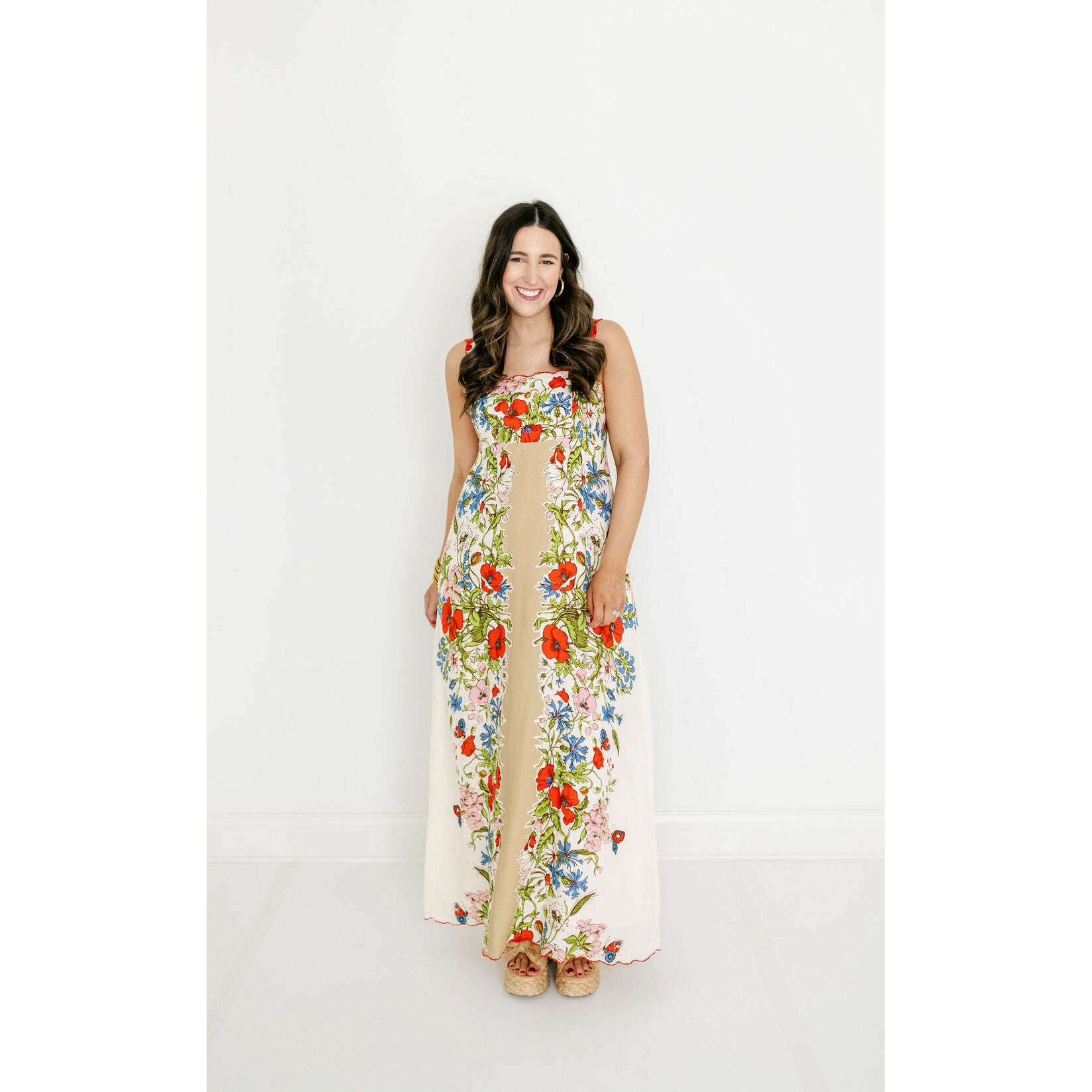 With her fitted empire bodice and flattering paneled skirt, Annalisa is a favorite silhouette all year long. She looks especially chic in this stunning Butterfly Garden print, elevated with delicate embroidery trim. Adjustable straps and a smocked back offer a comfortable fit for the perfect midi dress.