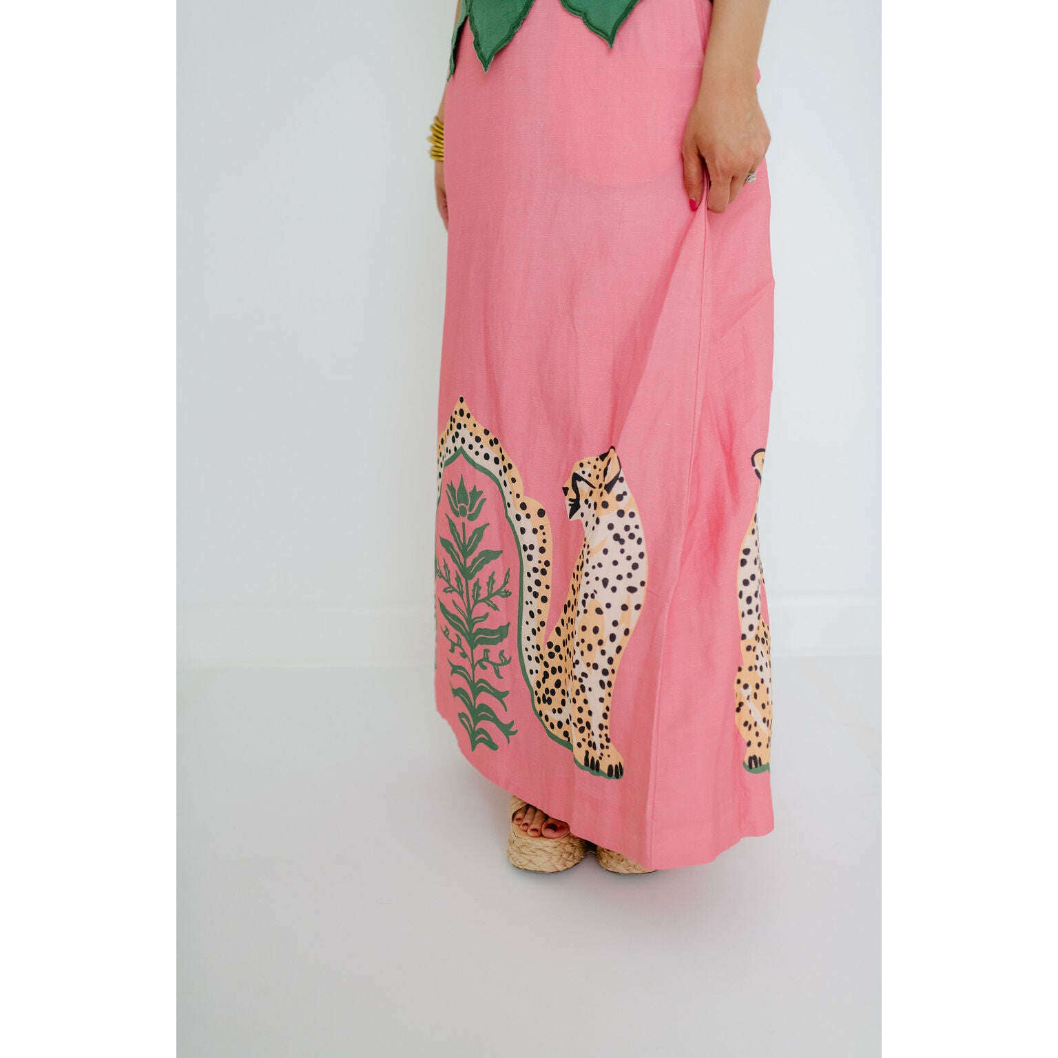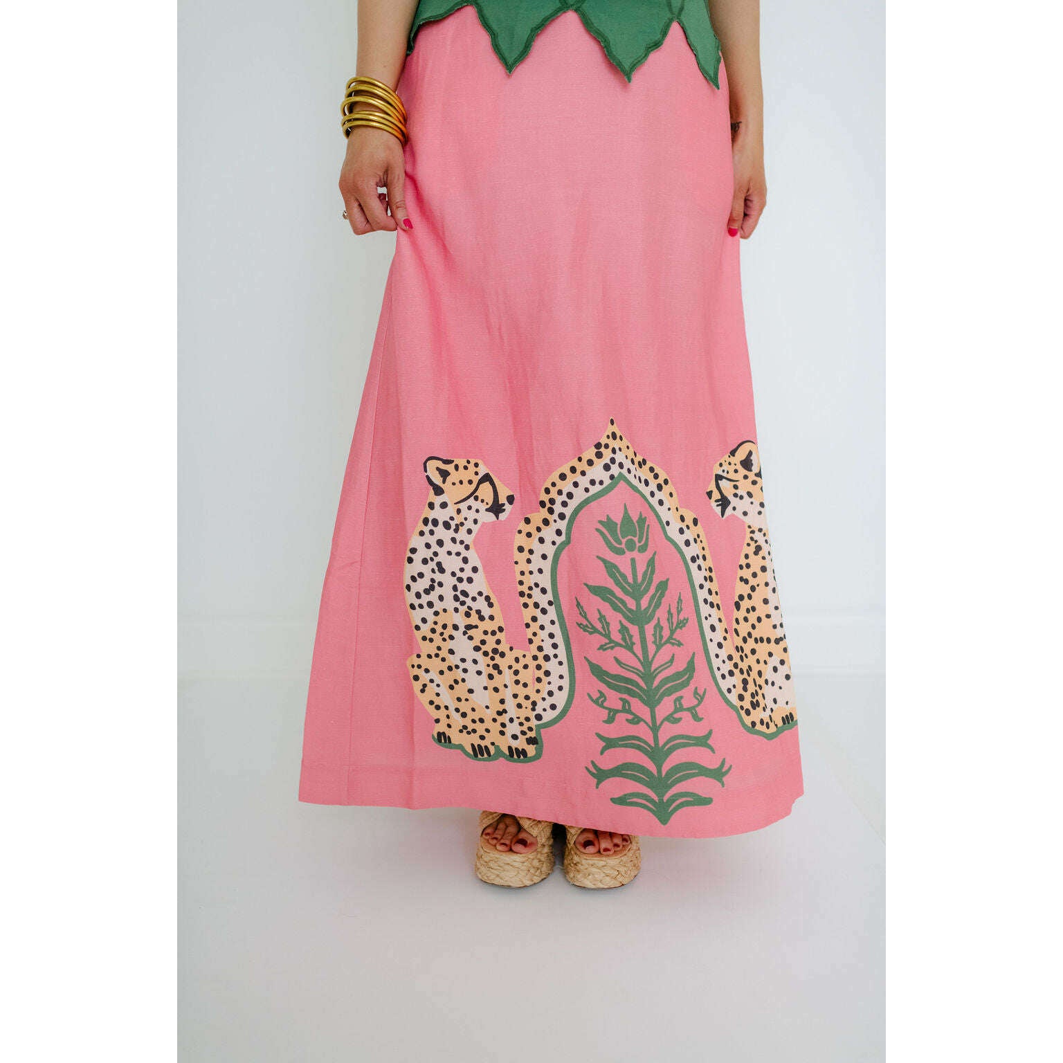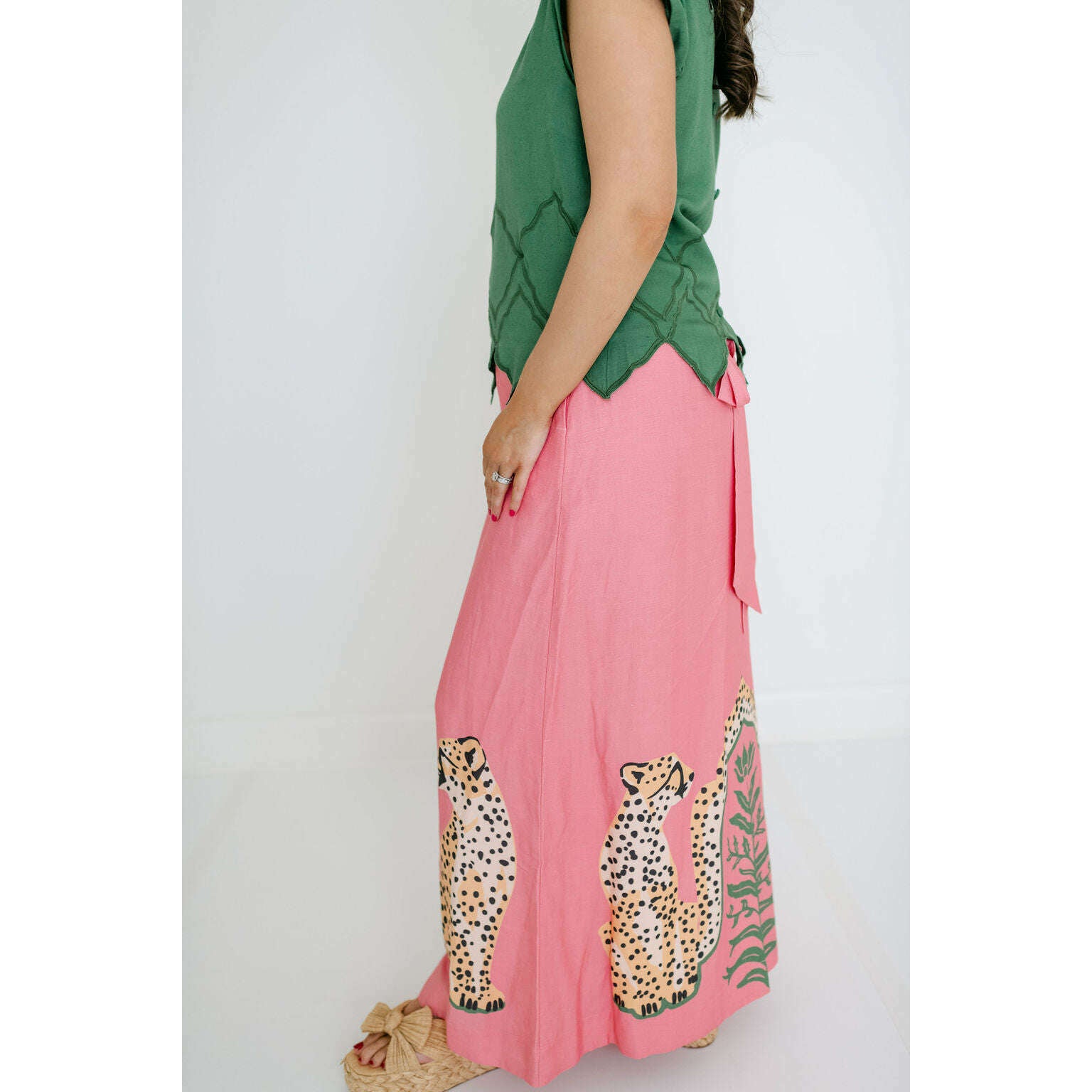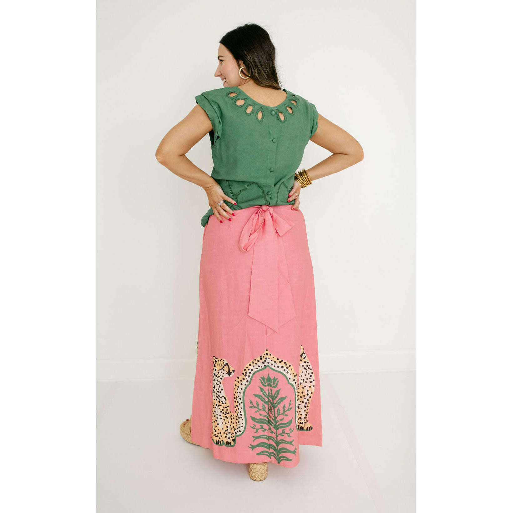 The Emily McCarthy Audrey Skirt in Cabana Cat is a statement in fluid playfulness. Designed with a high-waisted silhouette, it features a pre-tied, tacked bow at the waist and a clean side zip closure for a clean finish. The Cabana Cat motif introduces a sense of whimsical majesty, showcasing symmetrical regal cheetahs framing lush greenery for a look that feels both artful and elevated.