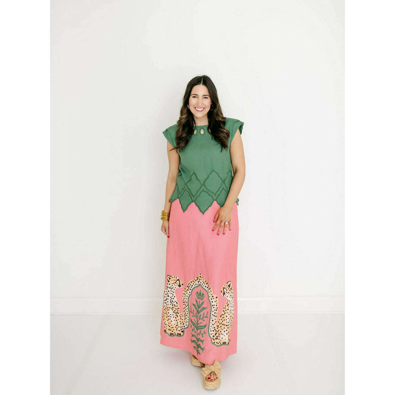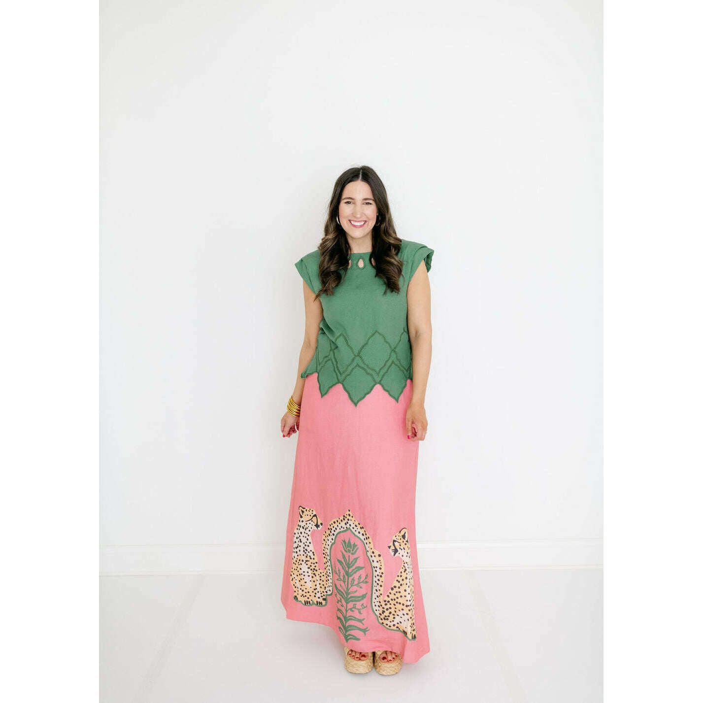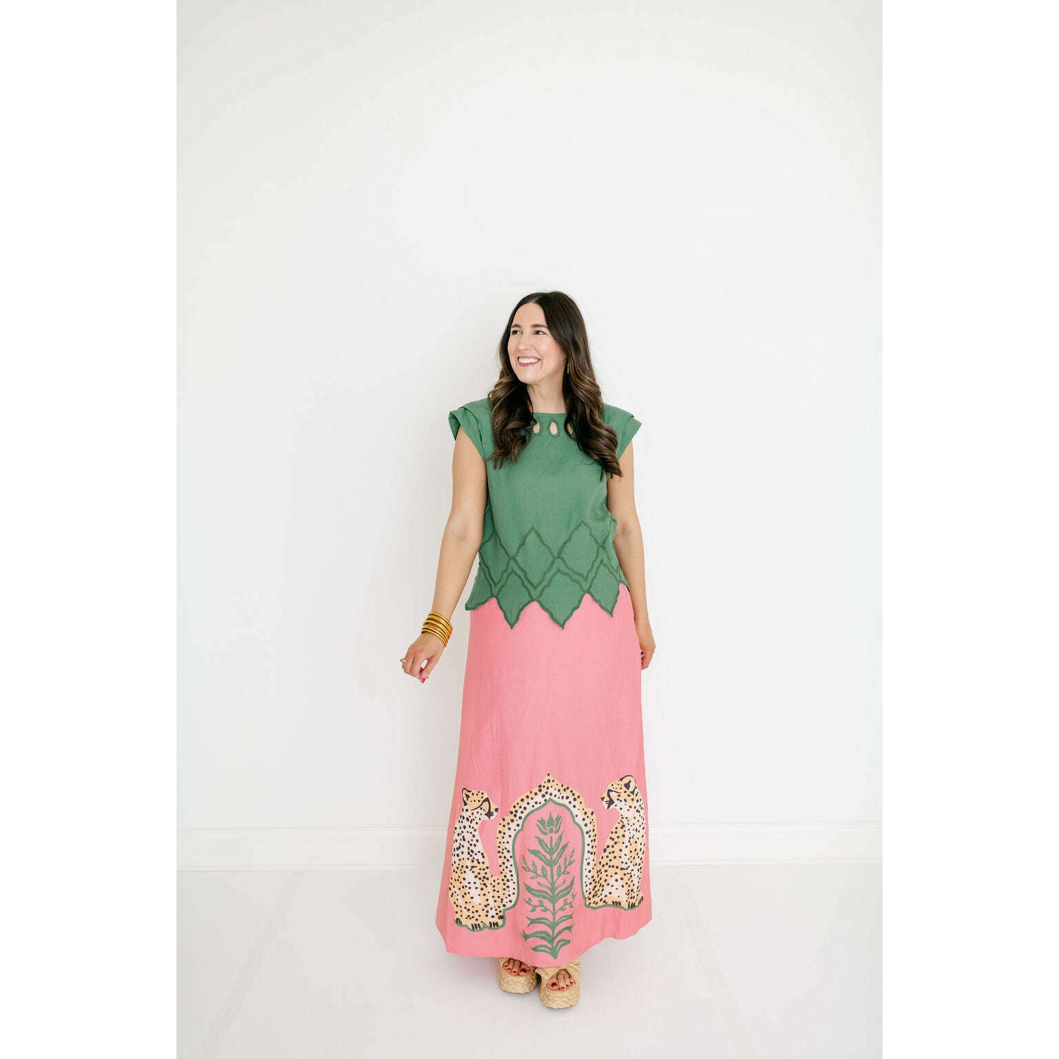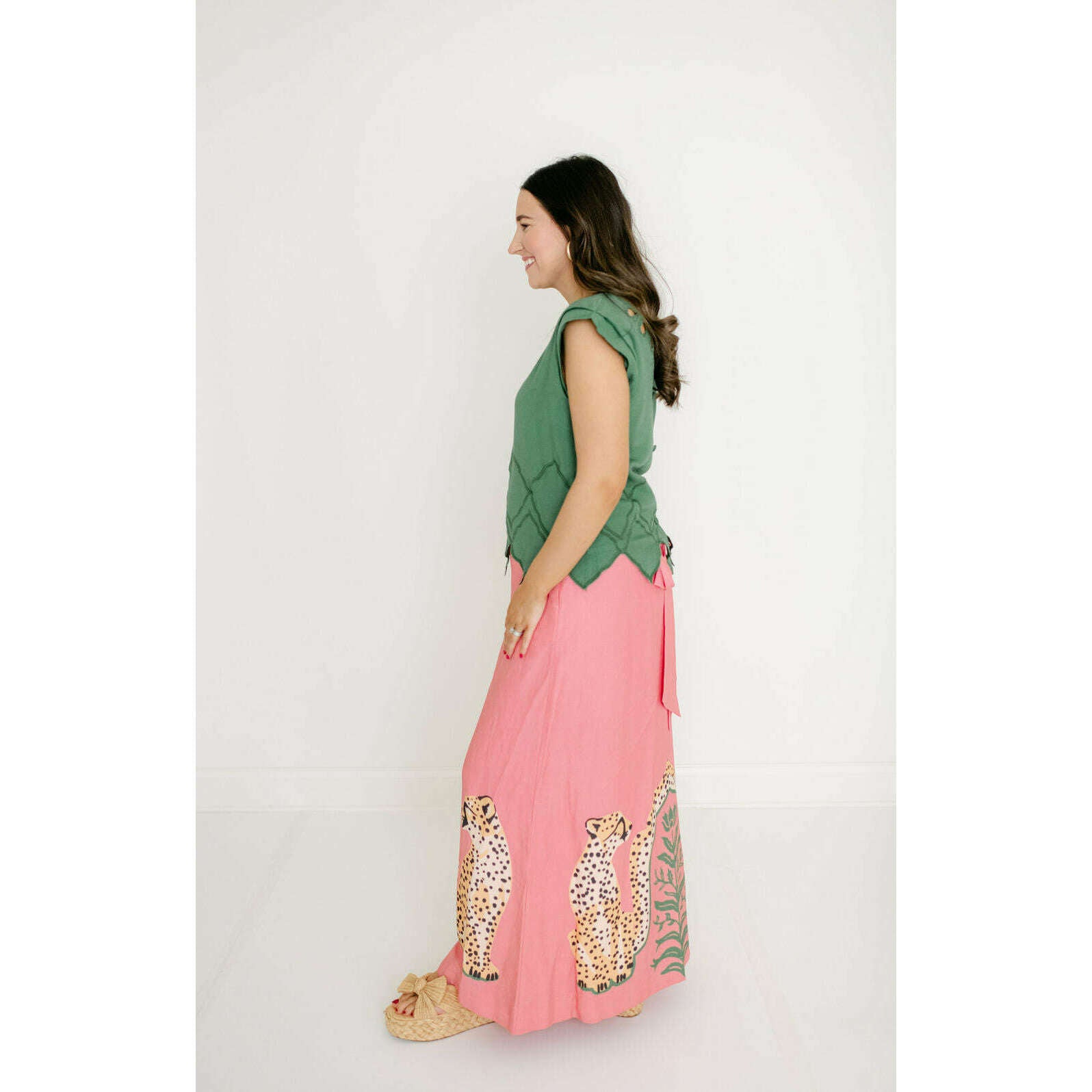 The Emily McCarthy Audrey Skirt in Cabana Cat is a statement in fluid playfulness. Designed with a high-waisted silhouette, it features a pre-tied, tacked bow at the waist and a clean side zip closure for a clean finish. The Cabana Cat motif introduces a sense of whimsical majesty, showcasing symmetrical regal cheetahs framing lush greenery for a look that feels both artful and elevated.