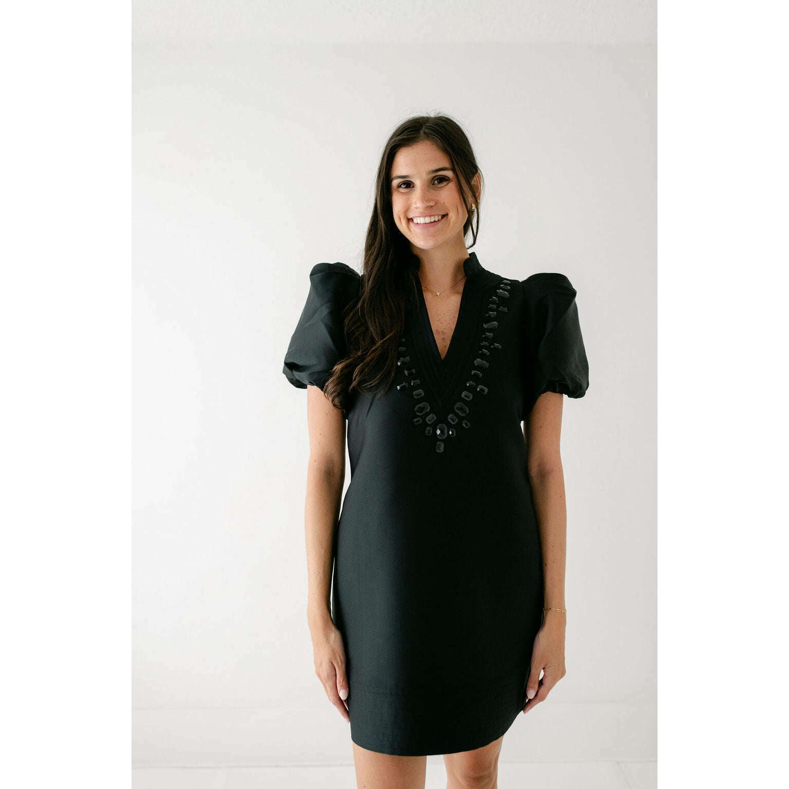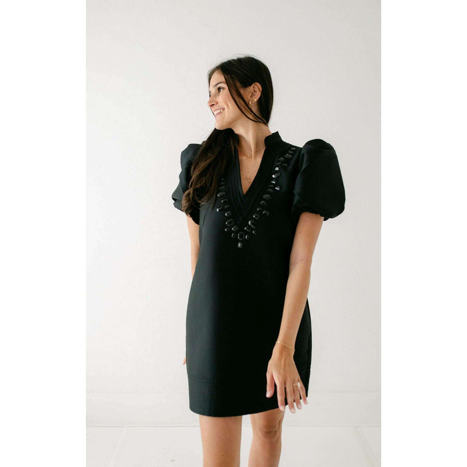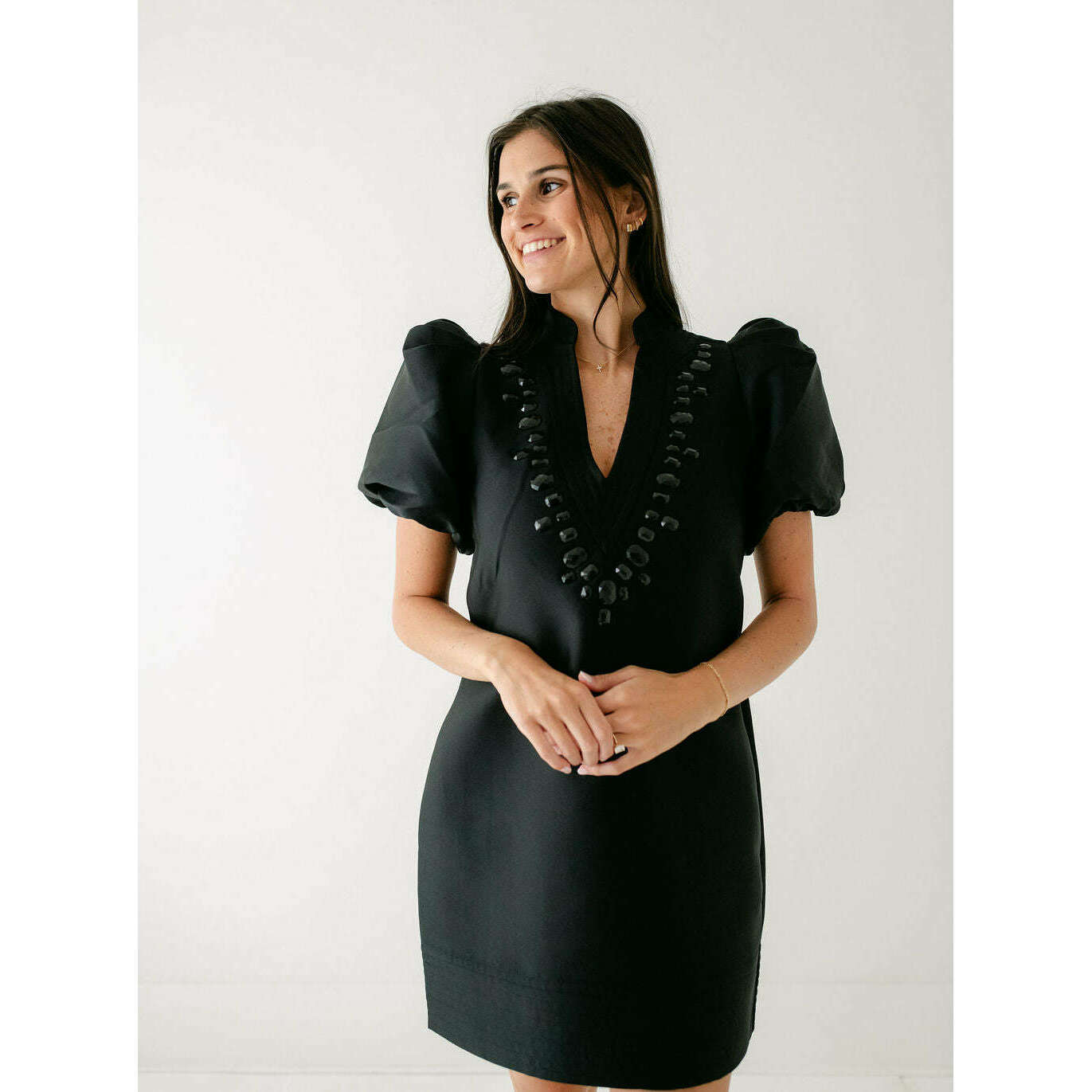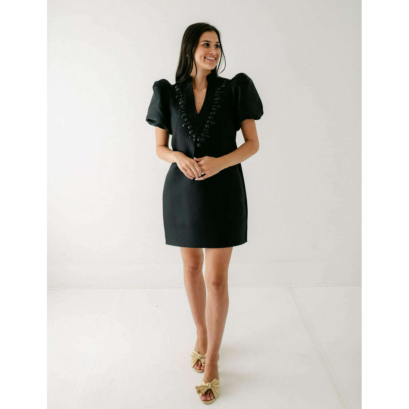 The Emily McCarthy Hampton Mini in Midnight is a refined yet playful dress featuring puff sleeves, side pockets, and a mandarin-style collar. Its neckline is framed with monochrome stones for a subtle statement, adding just the right touch of party-forward detail. Finished with a bold red lining for an unexpected pop of color, this mini is equal parts elevated and fun.