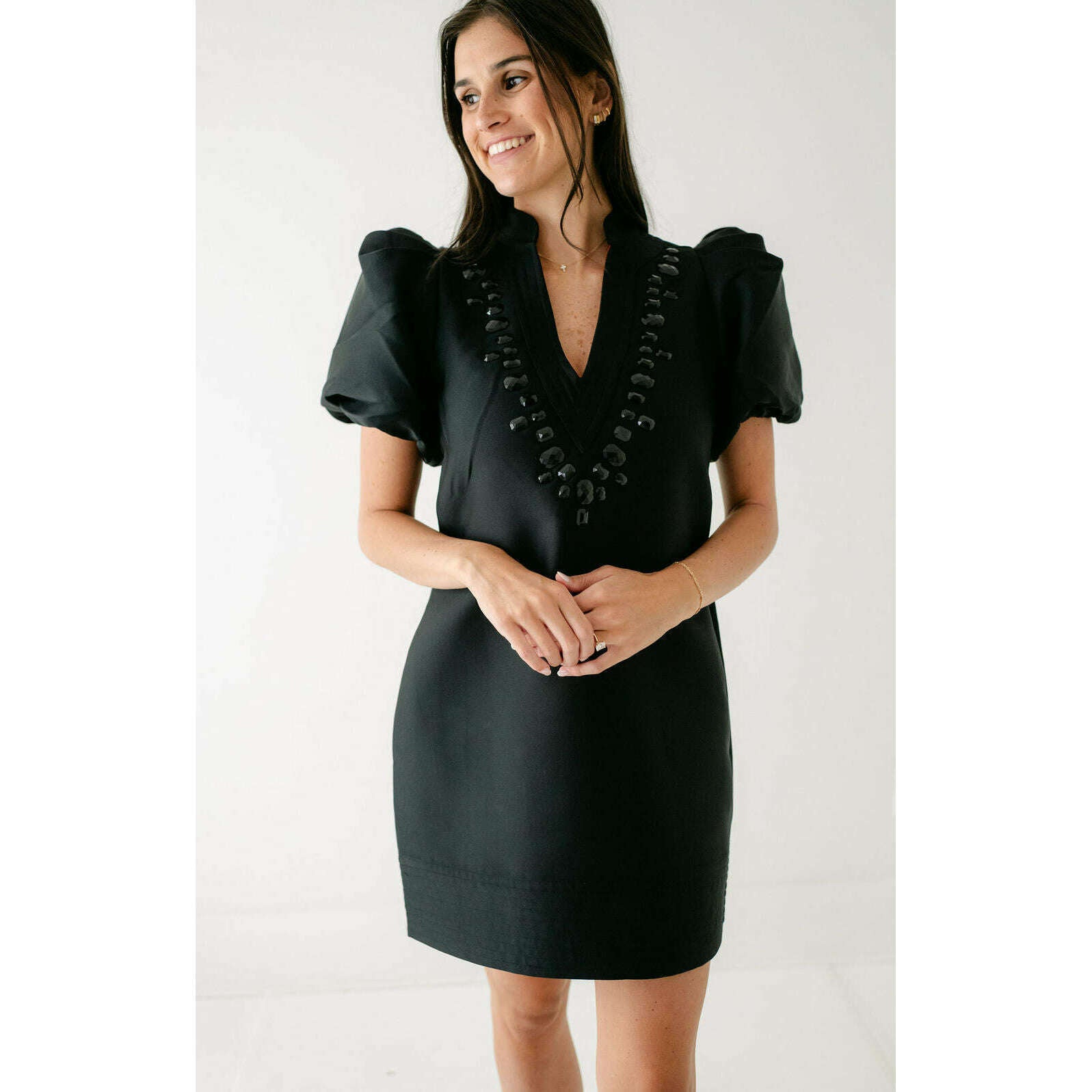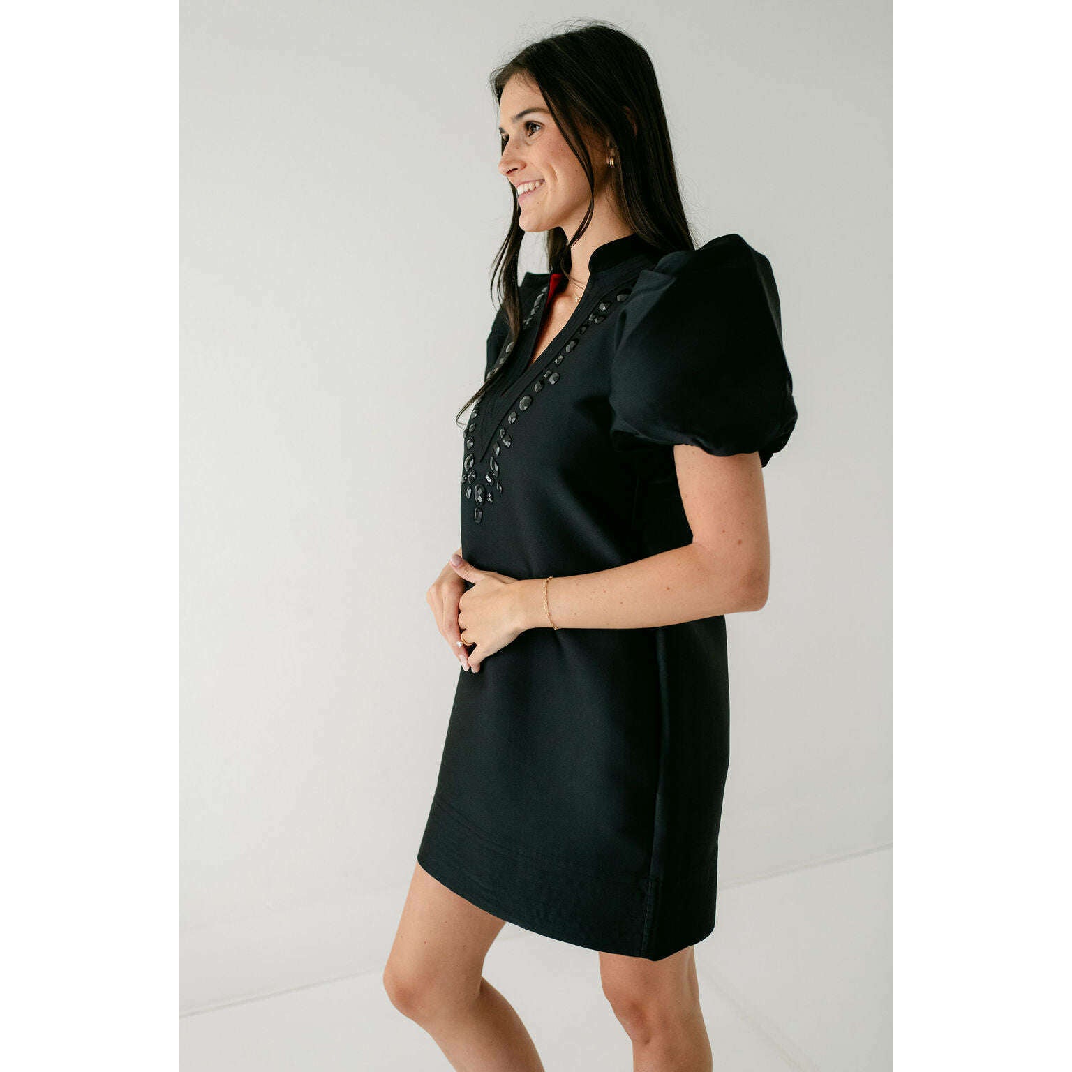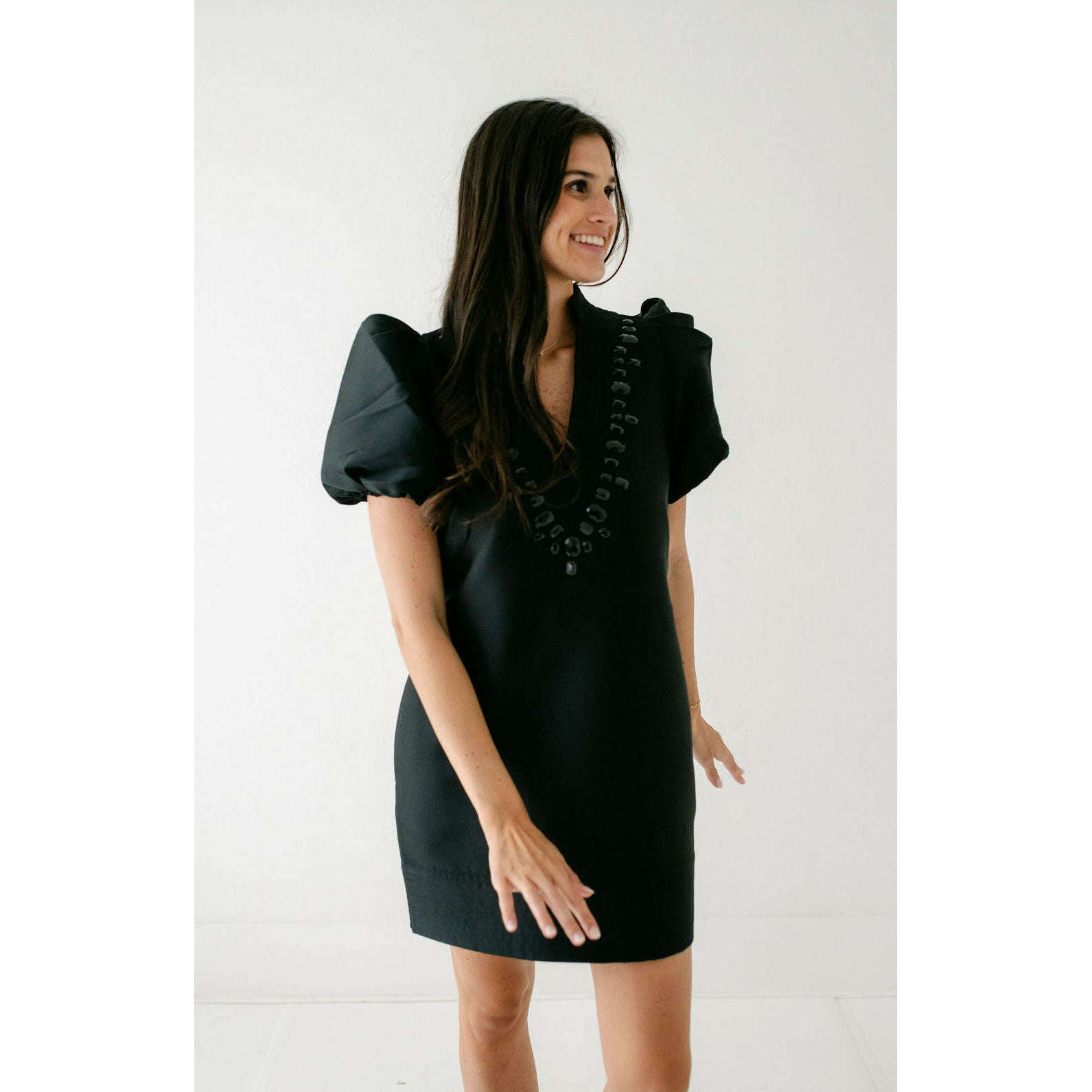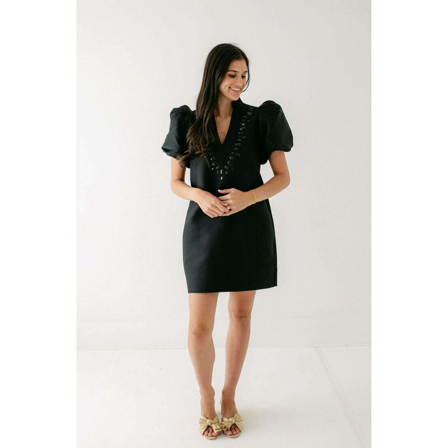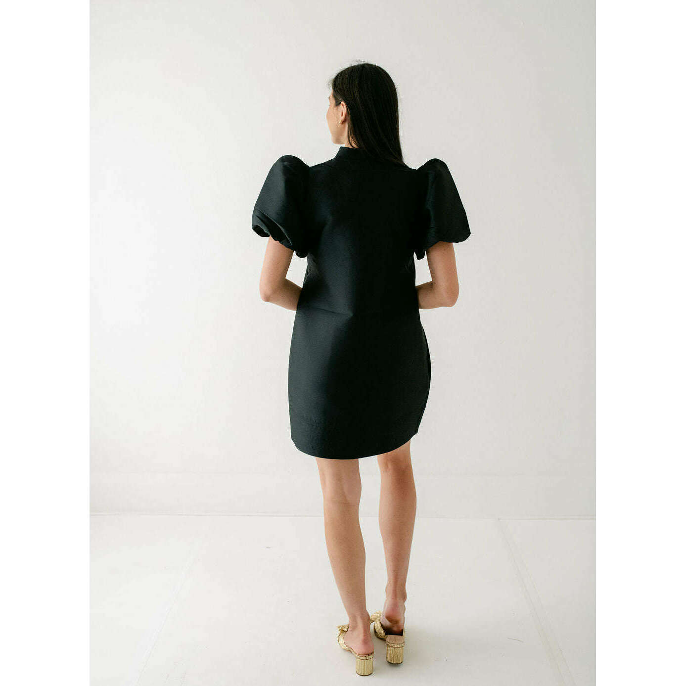 The Emily McCarthy Hampton Mini in Midnight is a refined yet playful dress featuring puff sleeves, side pockets, and a mandarin-style collar. Its neckline is framed with monochrome stones for a subtle statement, adding just the right touch of party-forward detail. Finished with a bold red lining for an unexpected pop of color, this mini is equal parts elevated and fun.