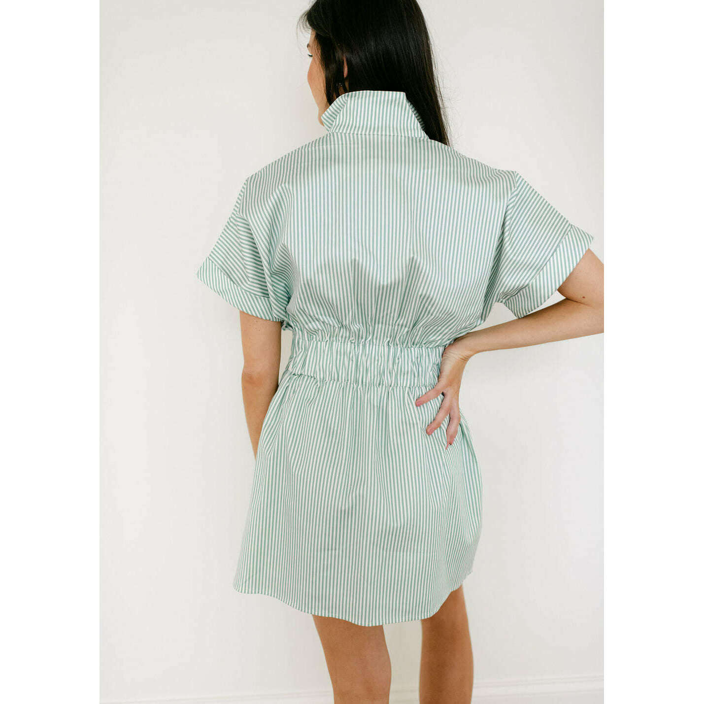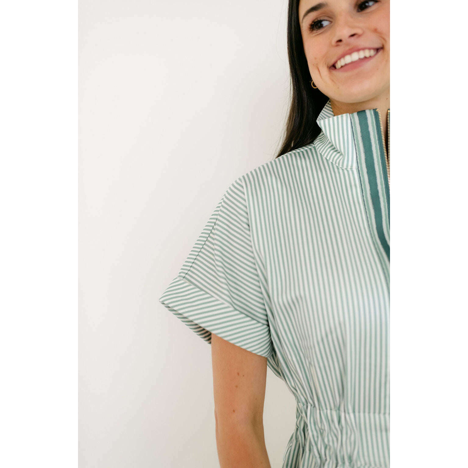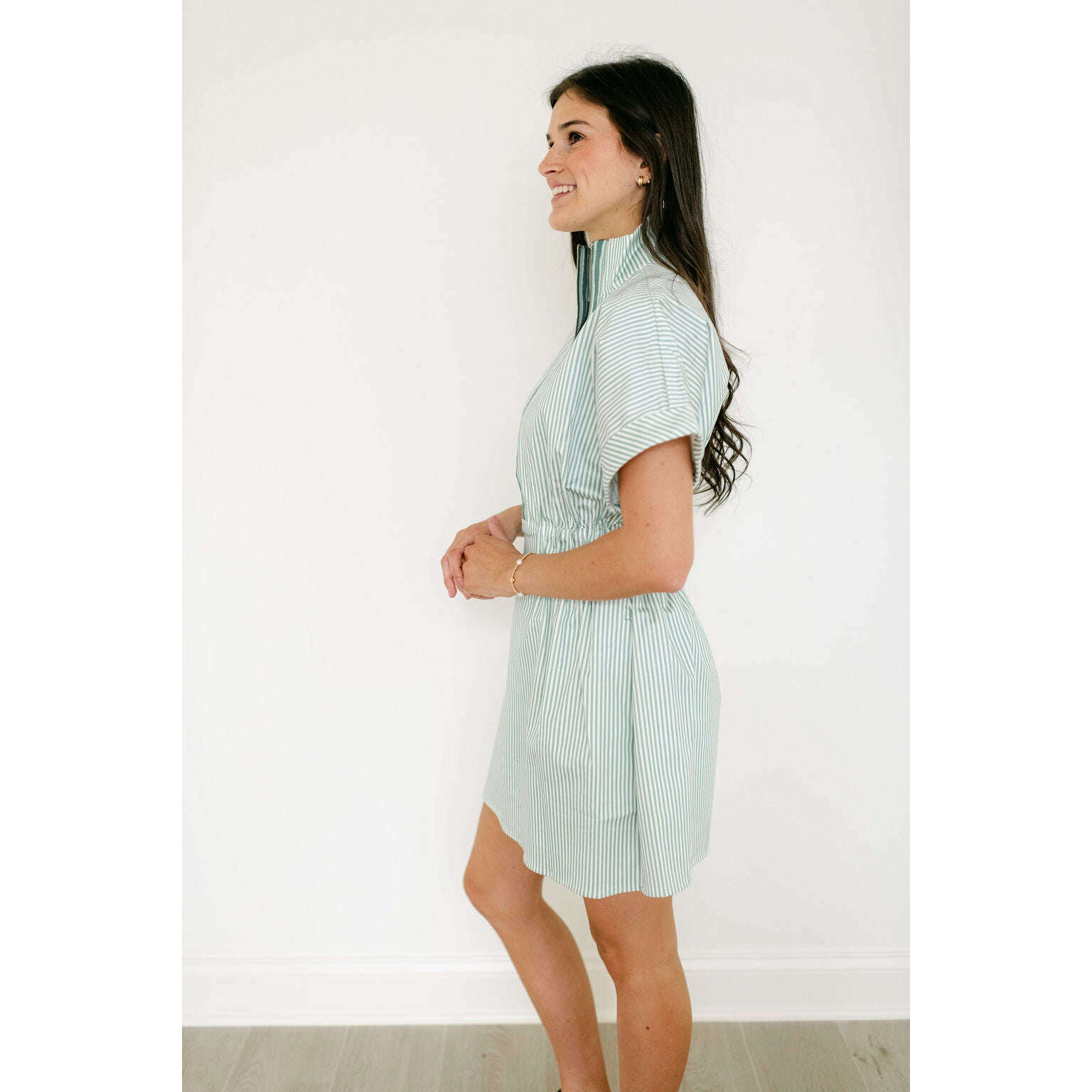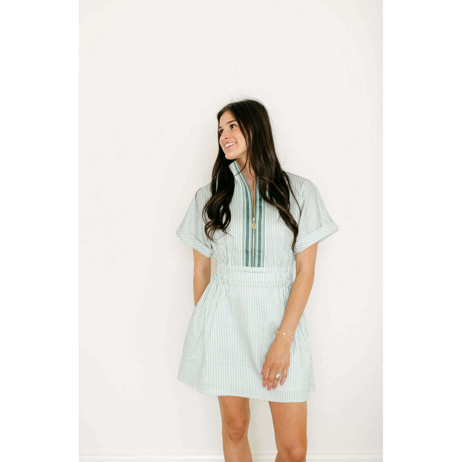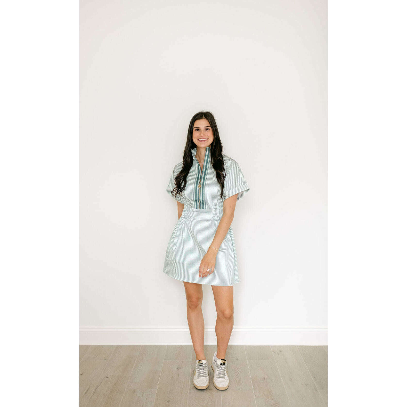 The Emily McCarthy Pullover Dress in Feldspar Stripe blends classic ease with a sporty, modern feel. Designed with a zip-front neckline finished with our gold logo pull, this style features short dolman sleeves, a cinched elastic waistband, and functional side pockets for everyday wear. Effortlessly versatile, it transitions seamlessly with a simple change of shoes or accessories—making it a polished, practical staple for spring and beyond.