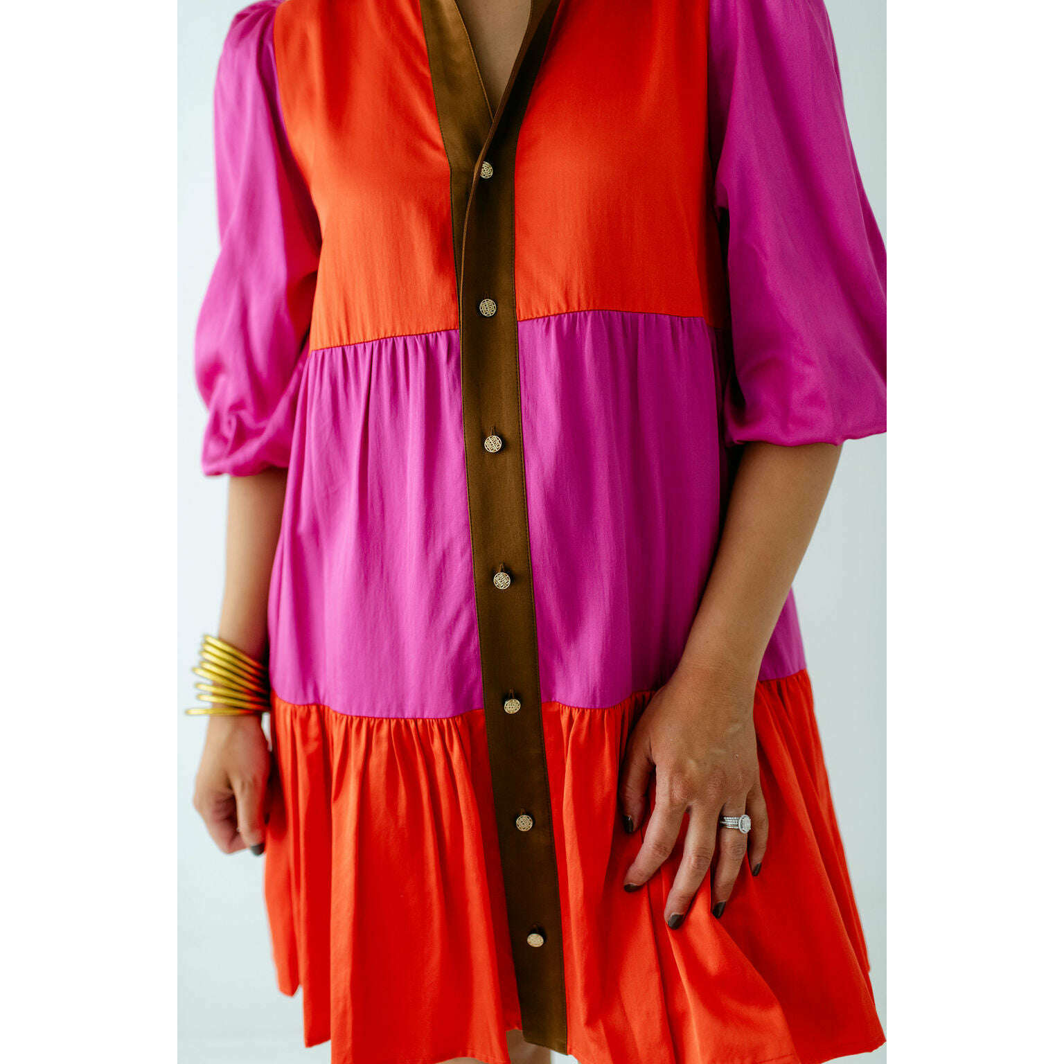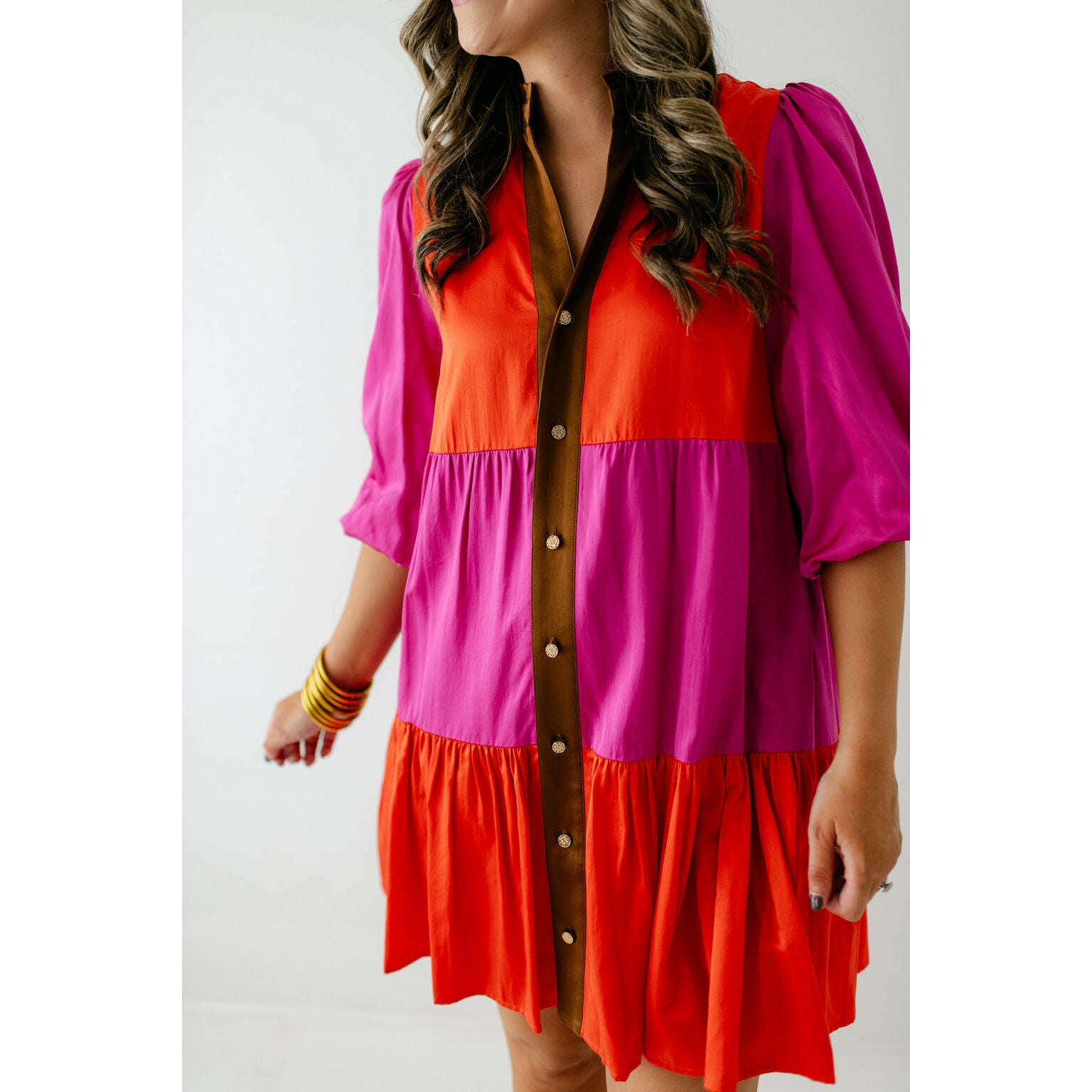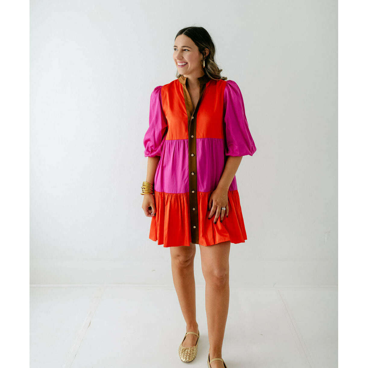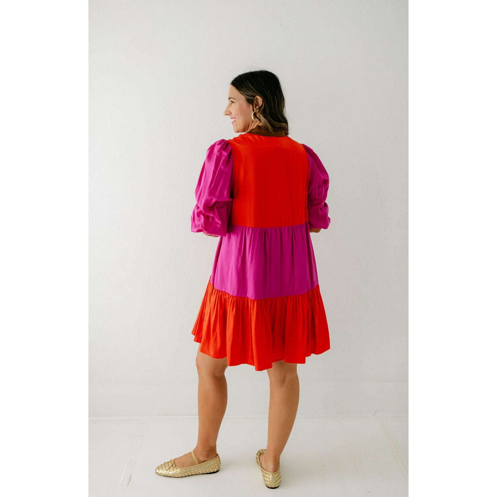 The Emily McCarthy Sadie Dress in Venetian Color Block blends effortless ease with vibrant style. Designed with a mandarin-style collar, front button closure, and a drop-waist hem, this loose-fitting silhouette offers a relaxed yet polished look. Side pockets add practical appeal, while the bold color-block design in striking Venetian-inspired hues brings a playful, modern edge.
