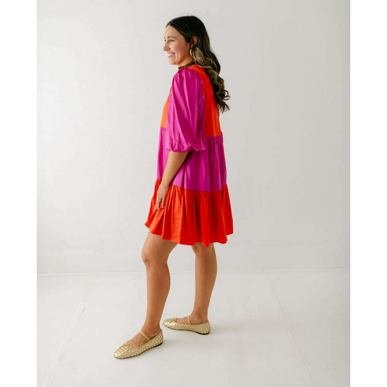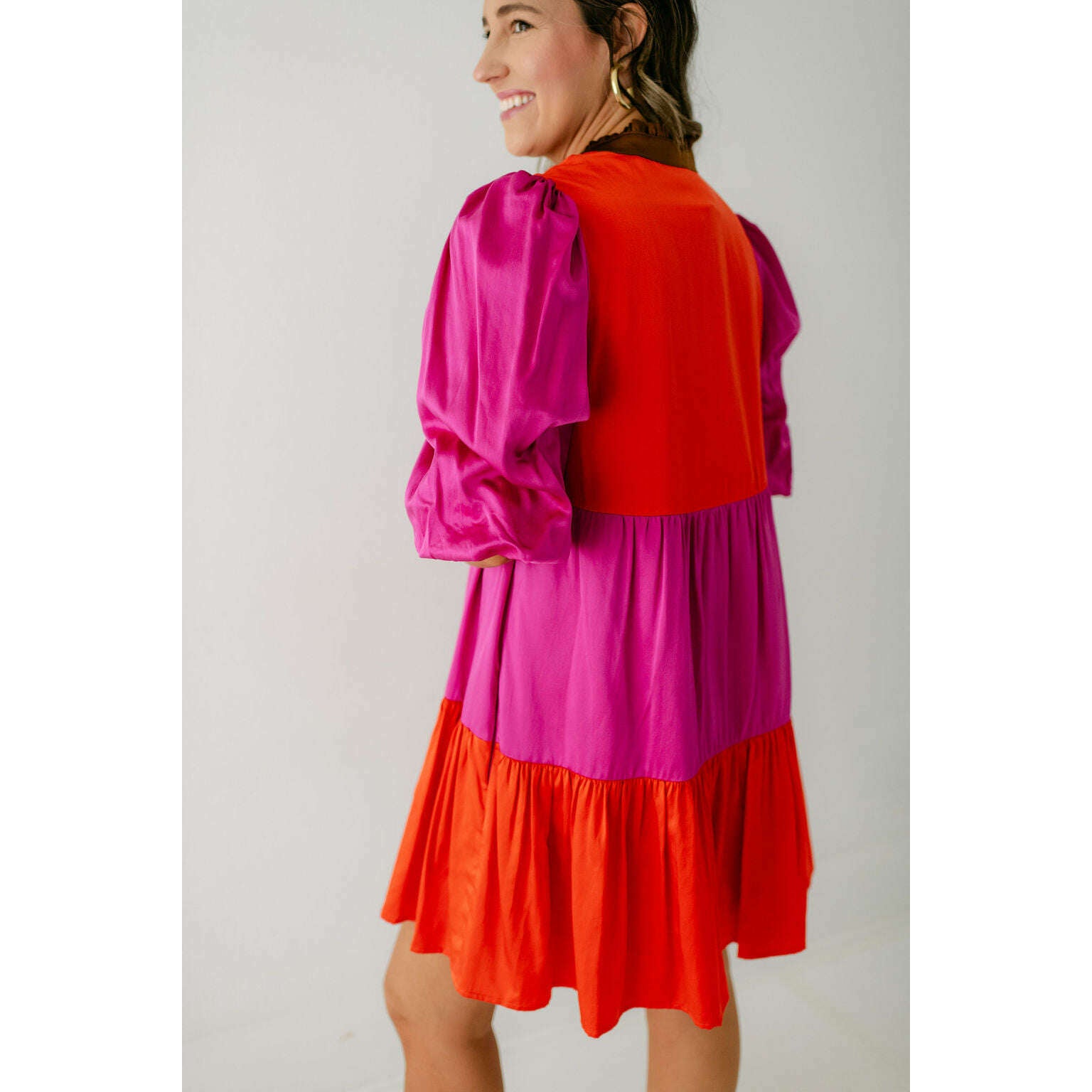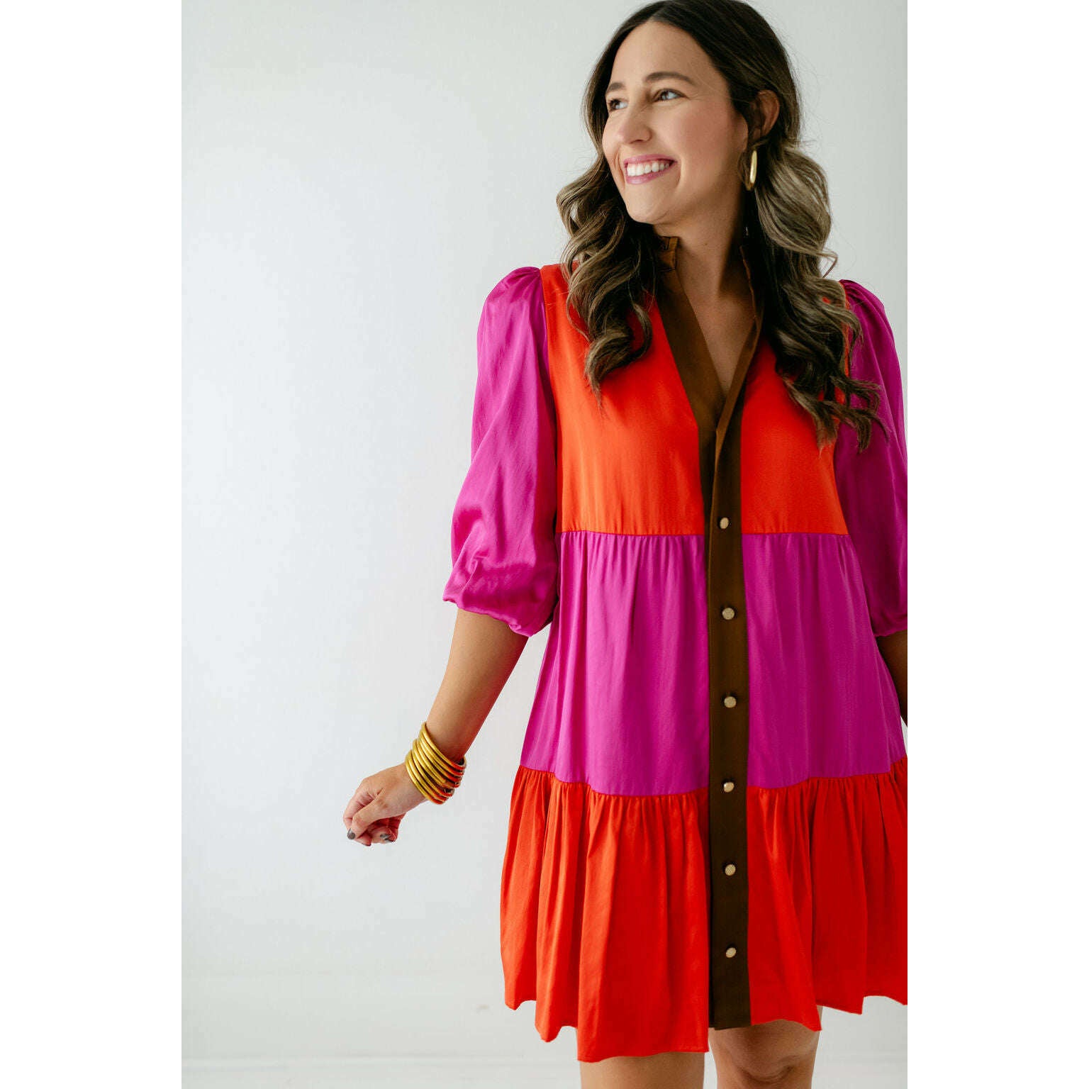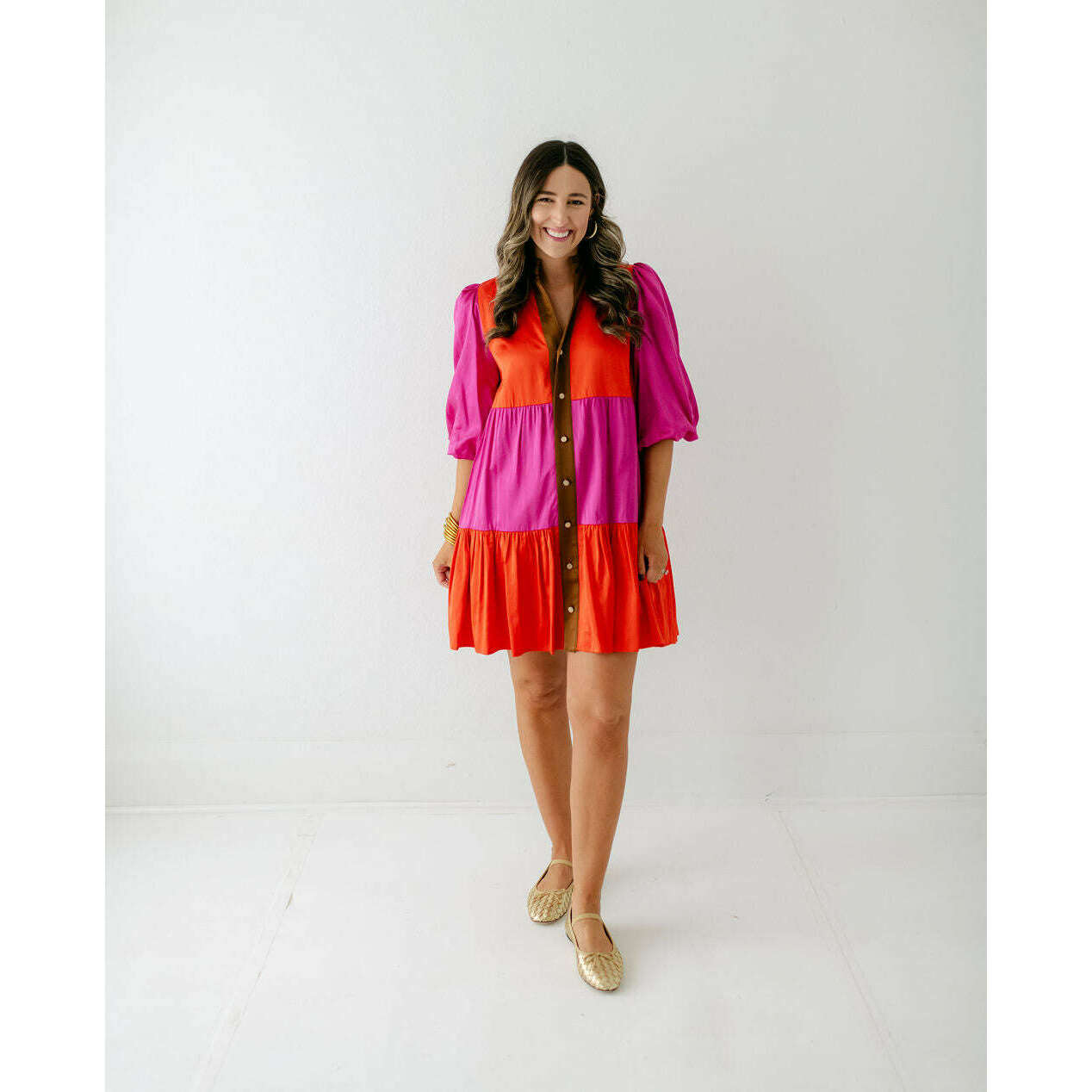 The Emily McCarthy Sadie Dress in Venetian Color Block blends effortless ease with vibrant style. Designed with a mandarin-style collar, front button closure, and a drop-waist hem, this loose-fitting silhouette offers a relaxed yet polished look. Side pockets add practical appeal, while the bold color-block design in striking Venetian-inspired hues brings a playful, modern edge.