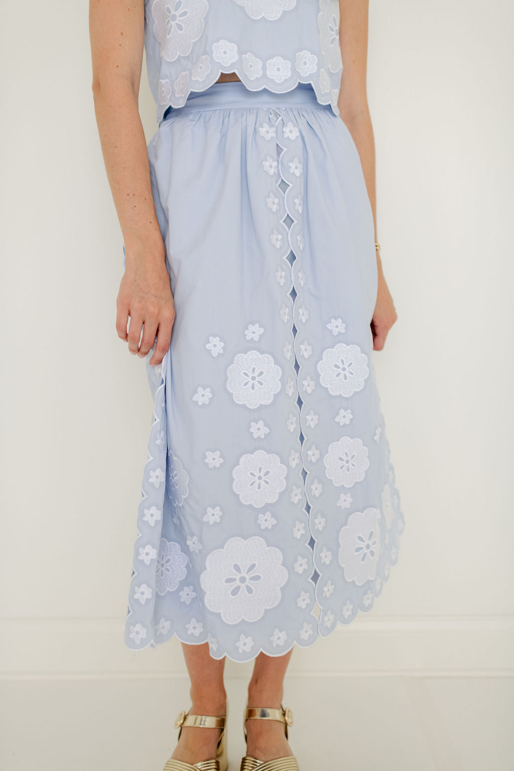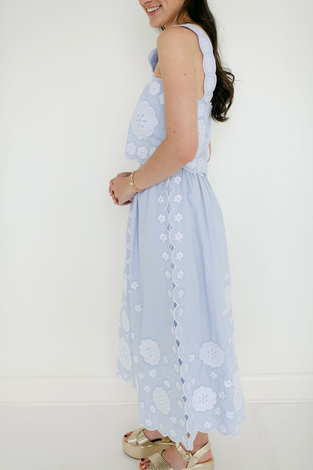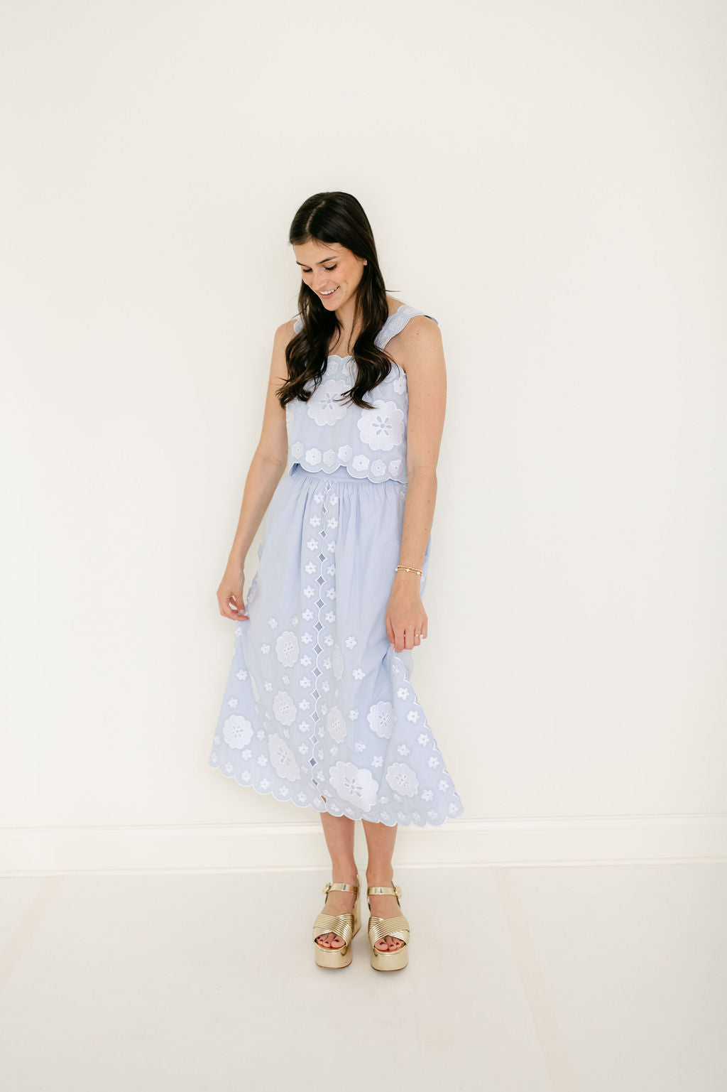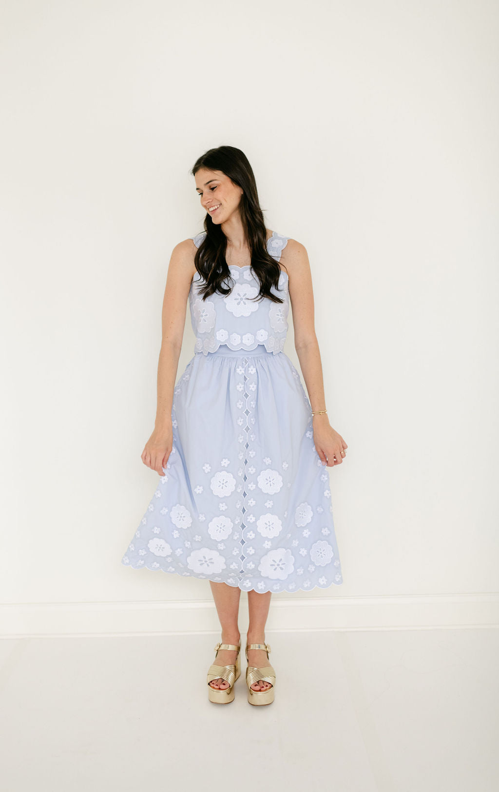 This dreamy periwinkle top features delicate embroidered detailing & soft scallop trim for a romantic, feminine touch. Designed with adjustable straps & an easy, flattering fit, it’s both graceful & versatile—perfect for pairing with the matching Ember Midi Skirt for garden parties, brunch dates, or any spring celebration.