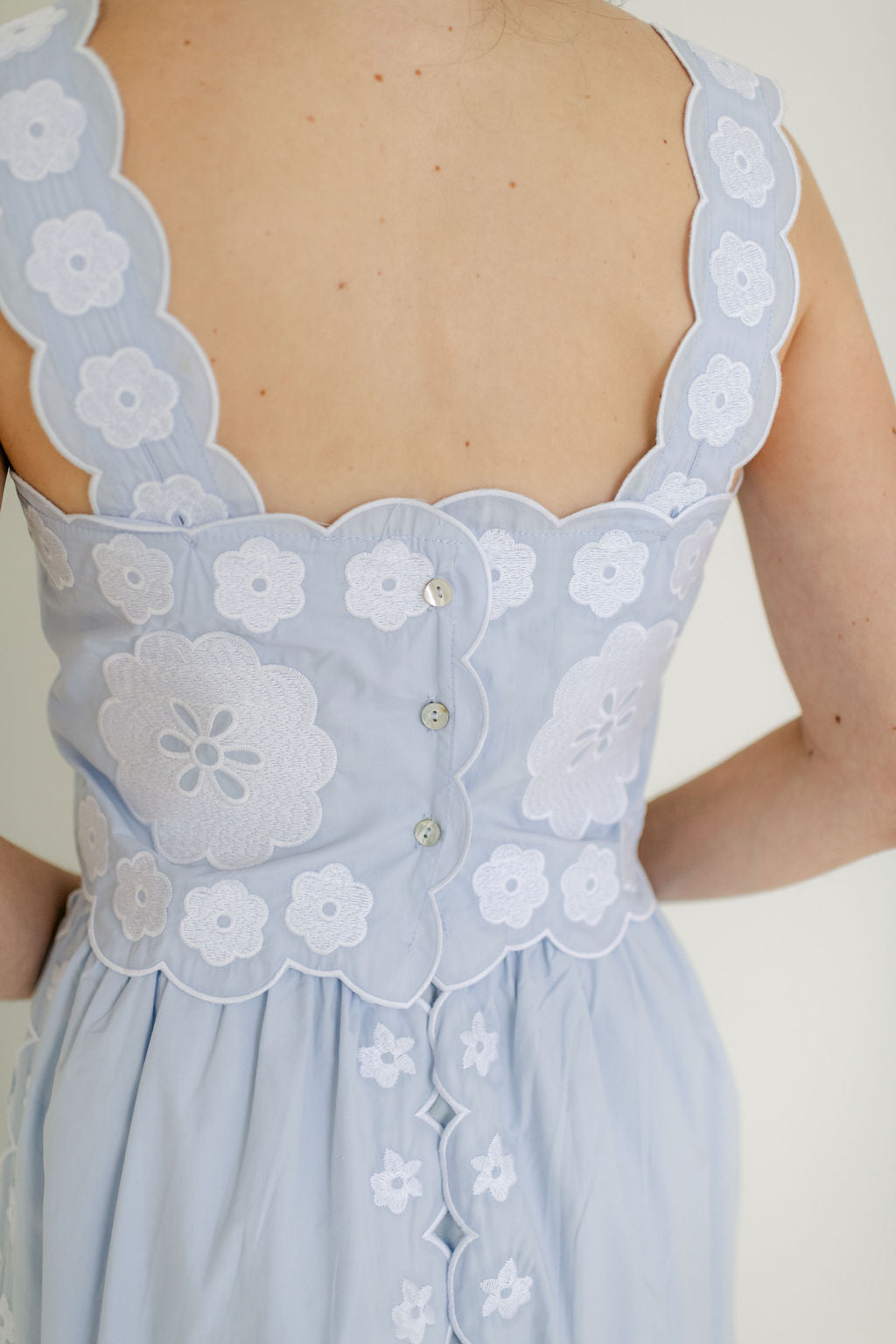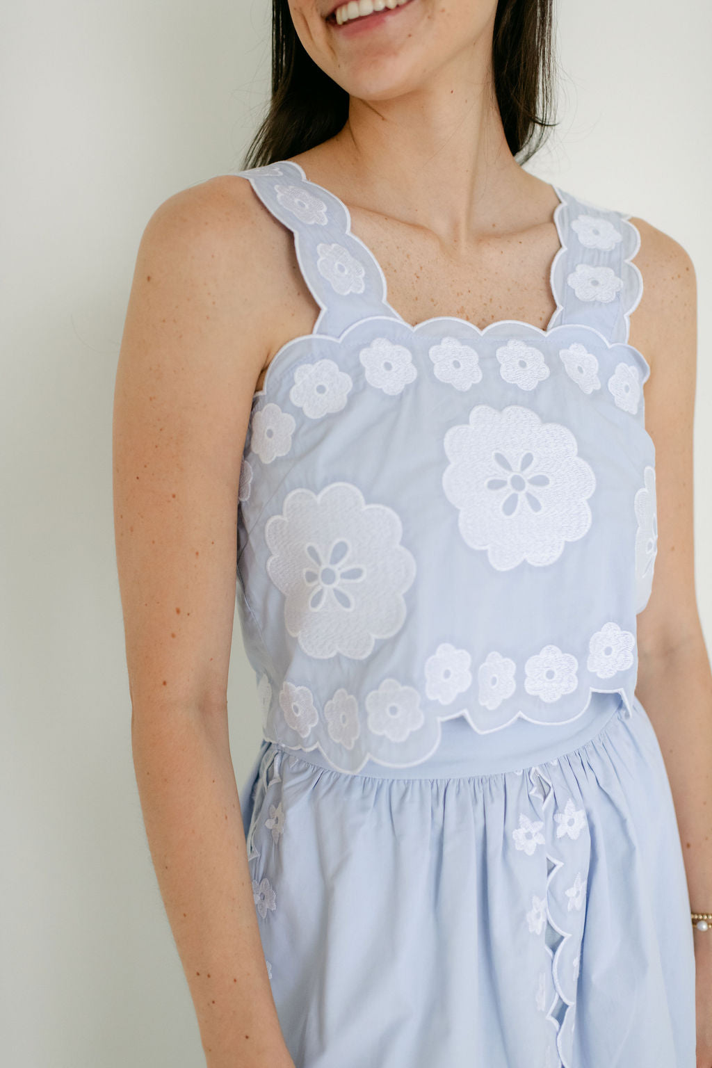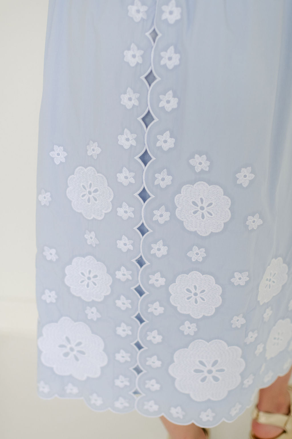 This dreamy periwinkle top features delicate embroidered detailing & soft scallop trim for a romantic, feminine touch. Designed with adjustable straps & an easy, flattering fit, it’s both graceful & versatile—perfect for pairing with the matching Ember Midi Skirt for garden parties, brunch dates, or any spring celebration.