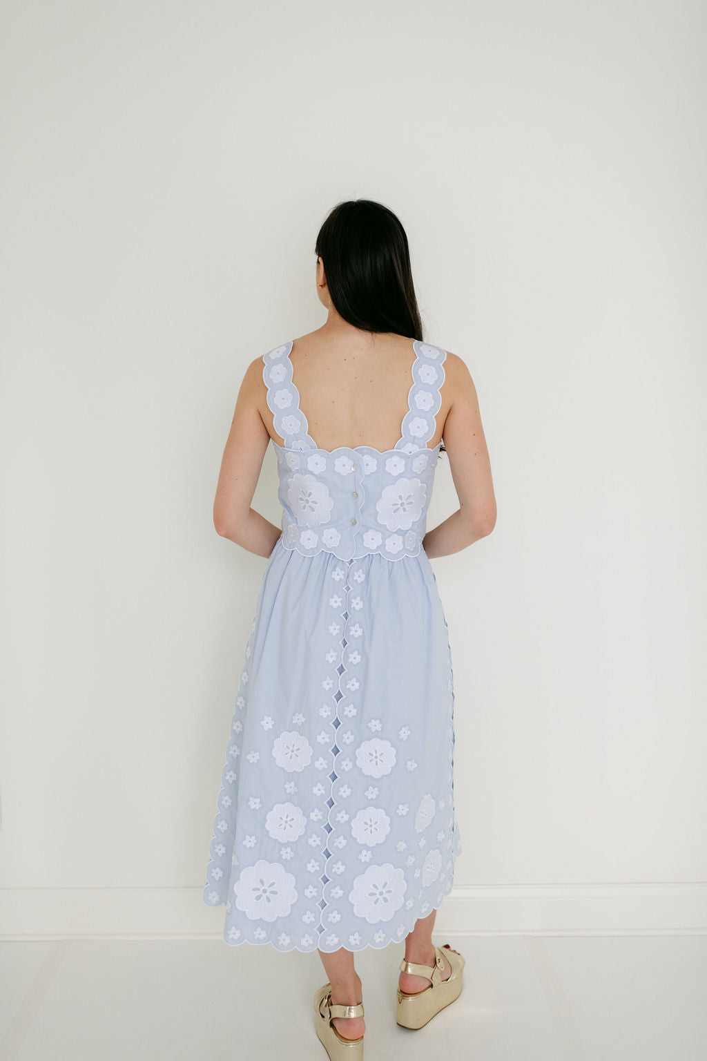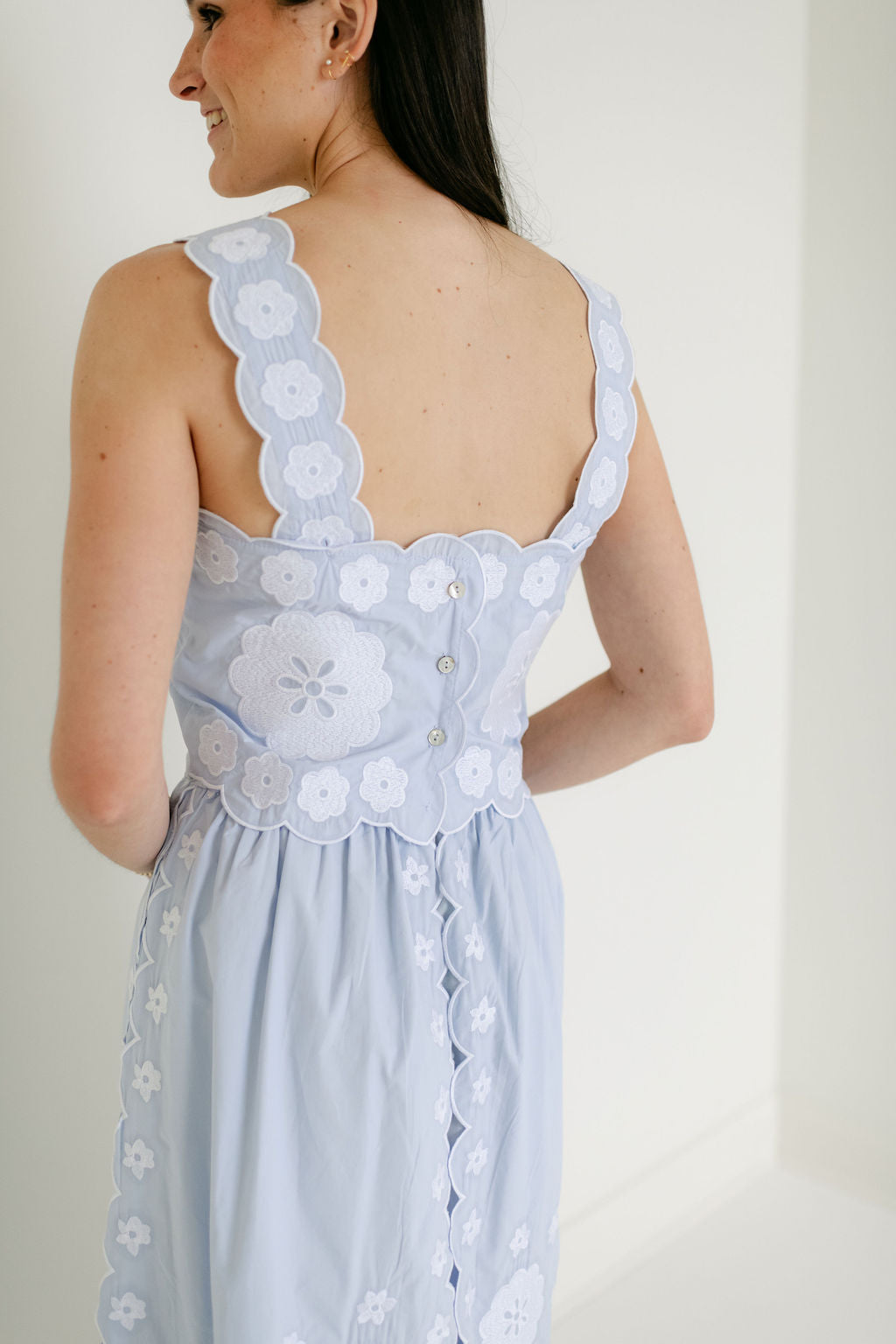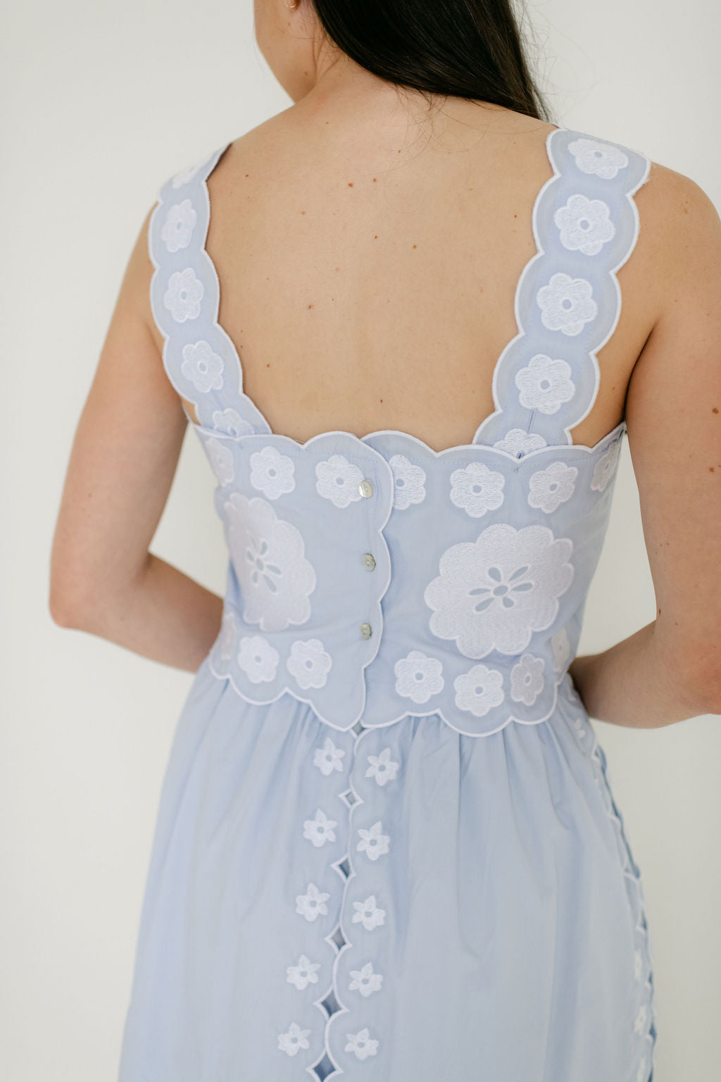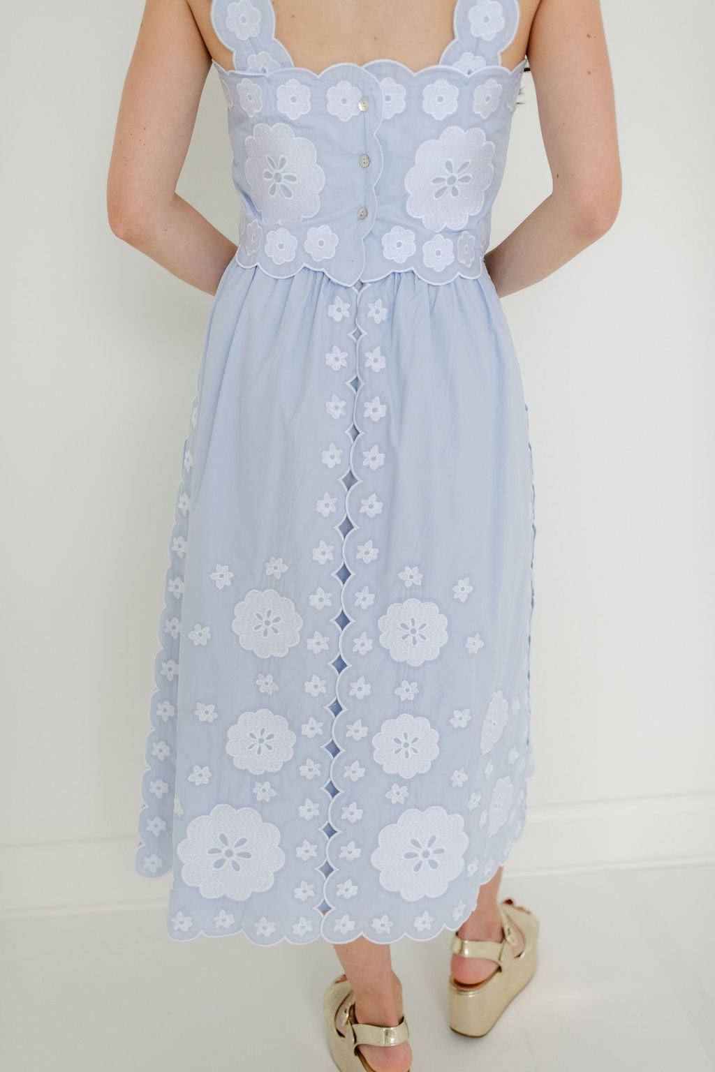 This dreamy periwinkle top features delicate embroidered detailing & soft scallop trim for a romantic, feminine touch. Designed with adjustable straps & an easy, flattering fit, it’s both graceful & versatile—perfect for pairing with the matching Ember Midi Skirt for garden parties, brunch dates, or any spring celebration.