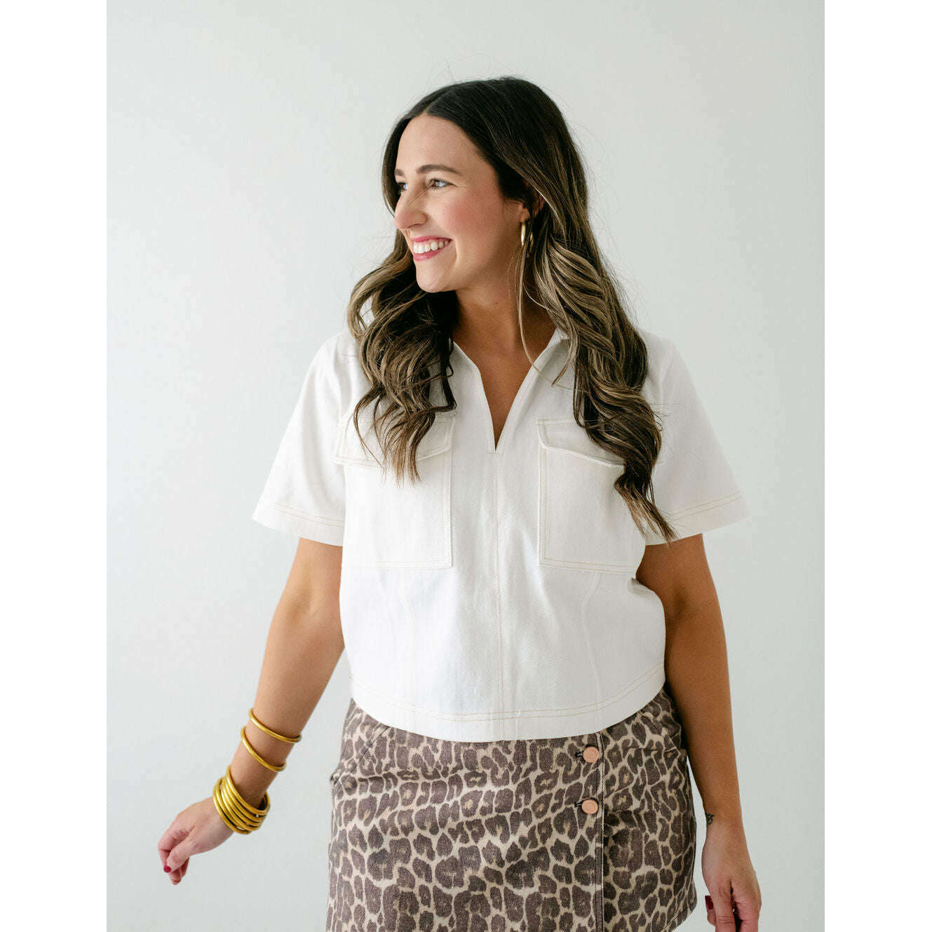 The Karlie Denim Pocket Stitch Top is a must-have for a stylish, casual look. Its charming pocket details and neat stitching add a playful yet polished touch to your outfit. Pair it with our Karlie Denim Leopard skirt to complete a trendy ensemble that’s perfect for any occasion. Embrace effortless style with this versatile top today.