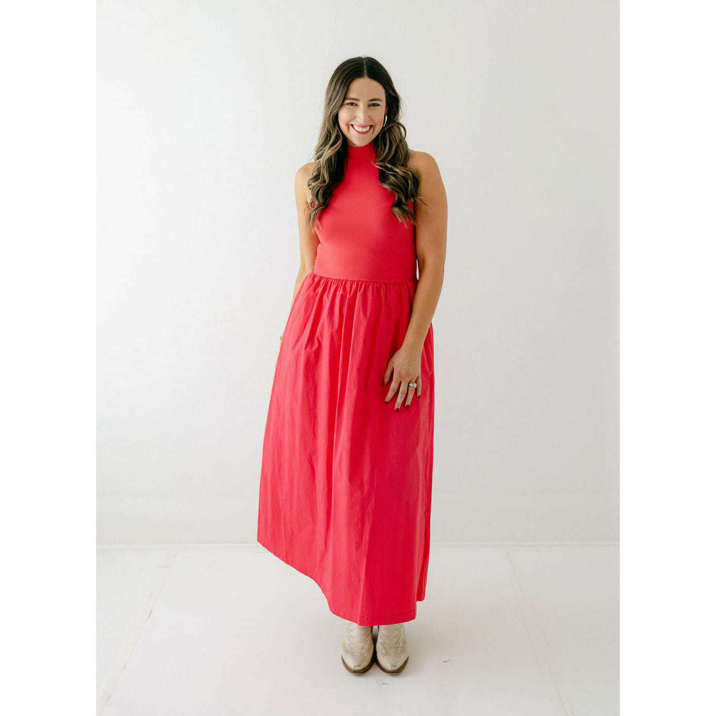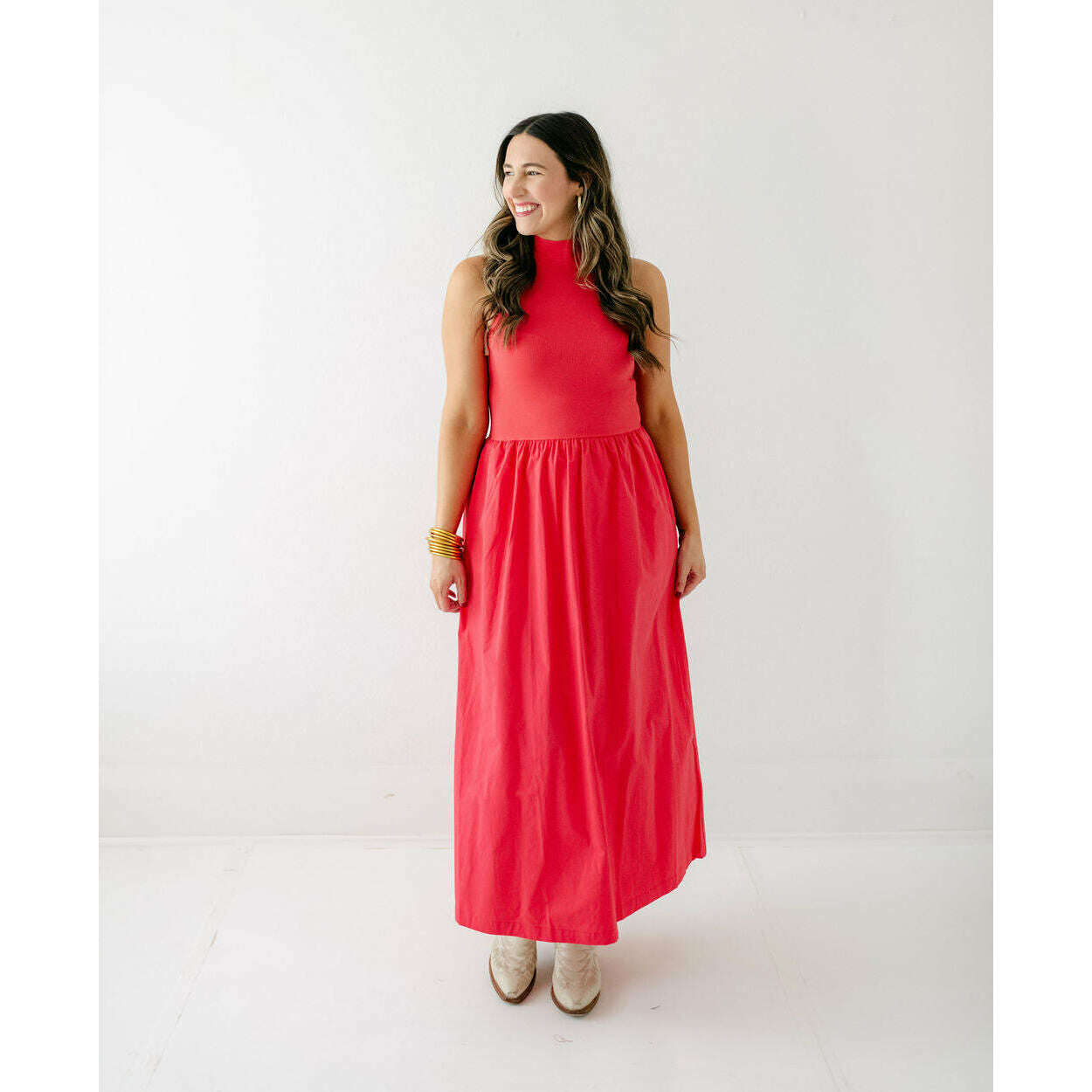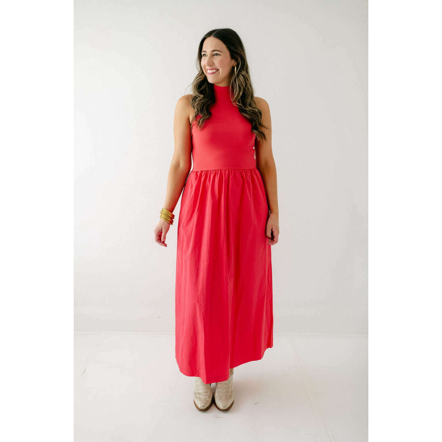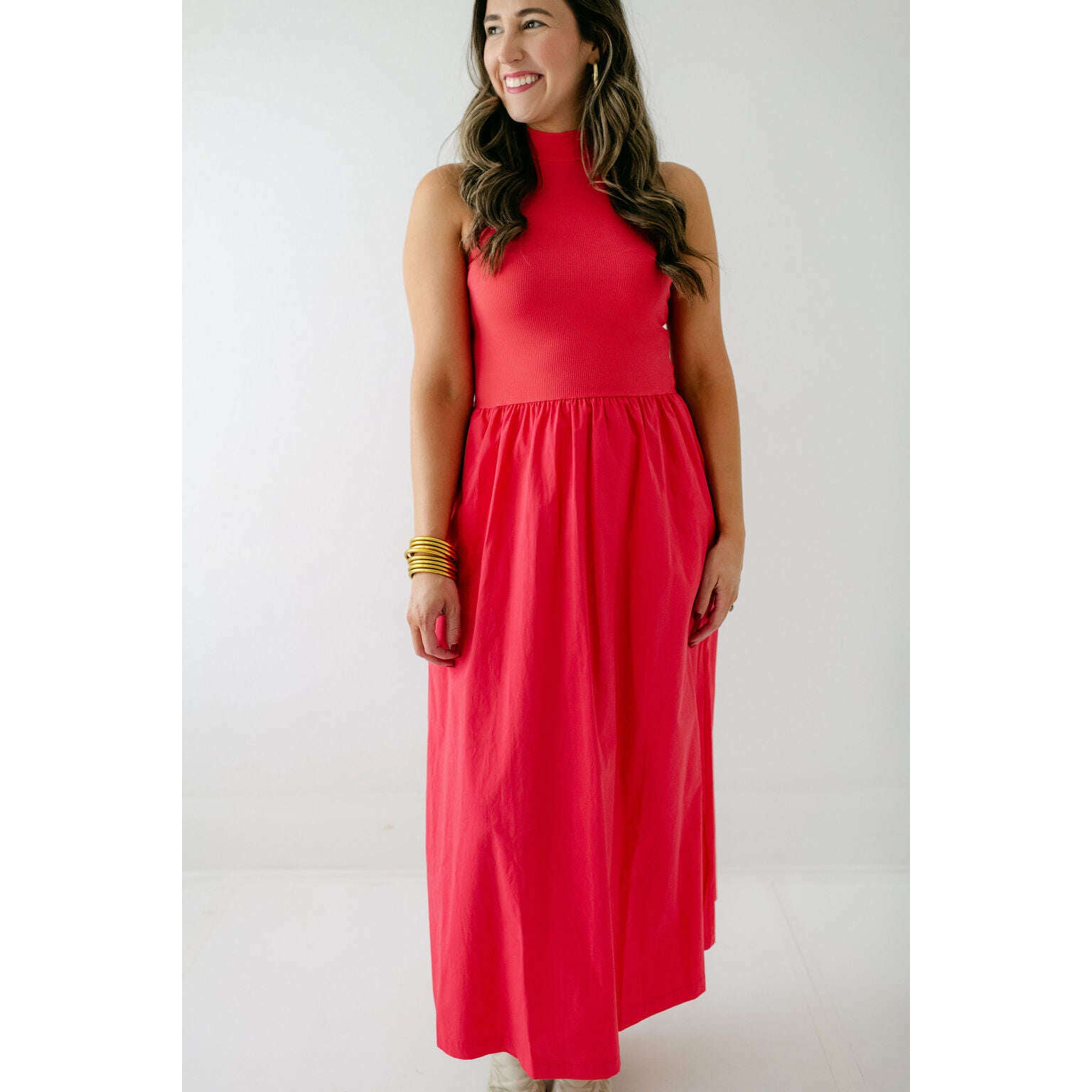 Karlie Solid Mock Neck Maxi Dress in Red