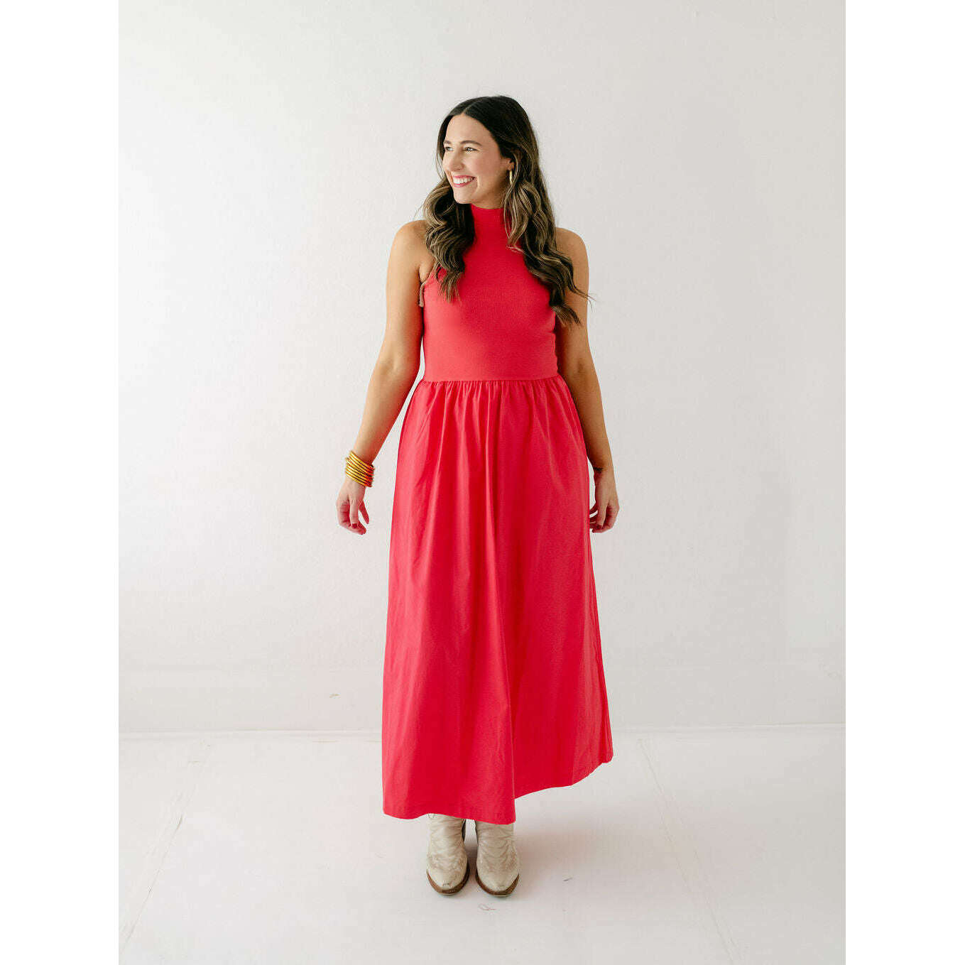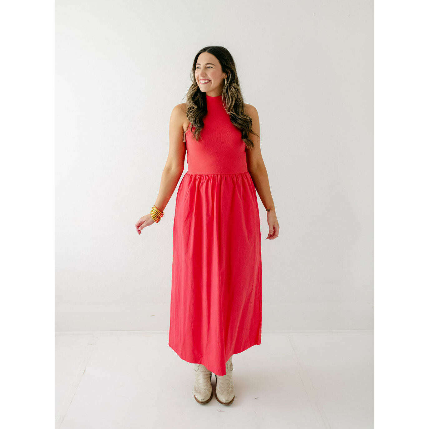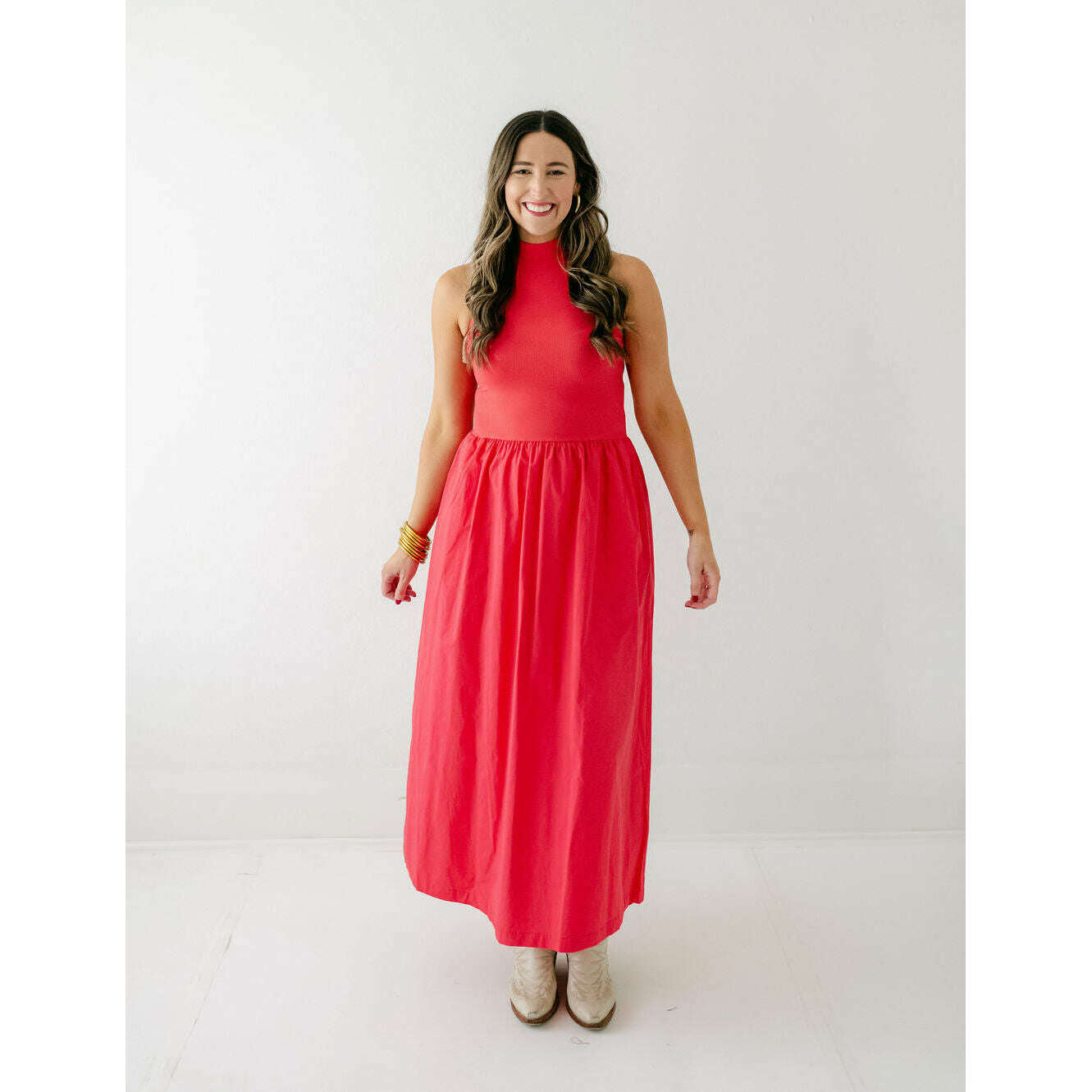 Karlie Solid Mock Neck Maxi Dress in Red