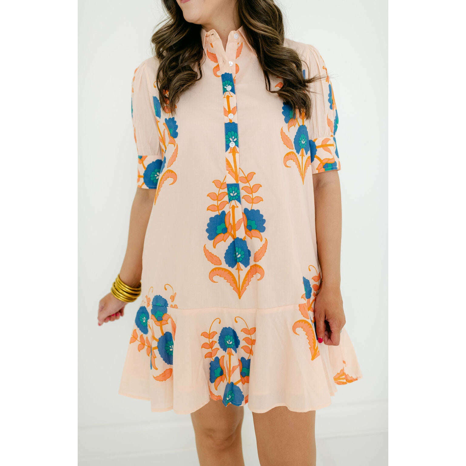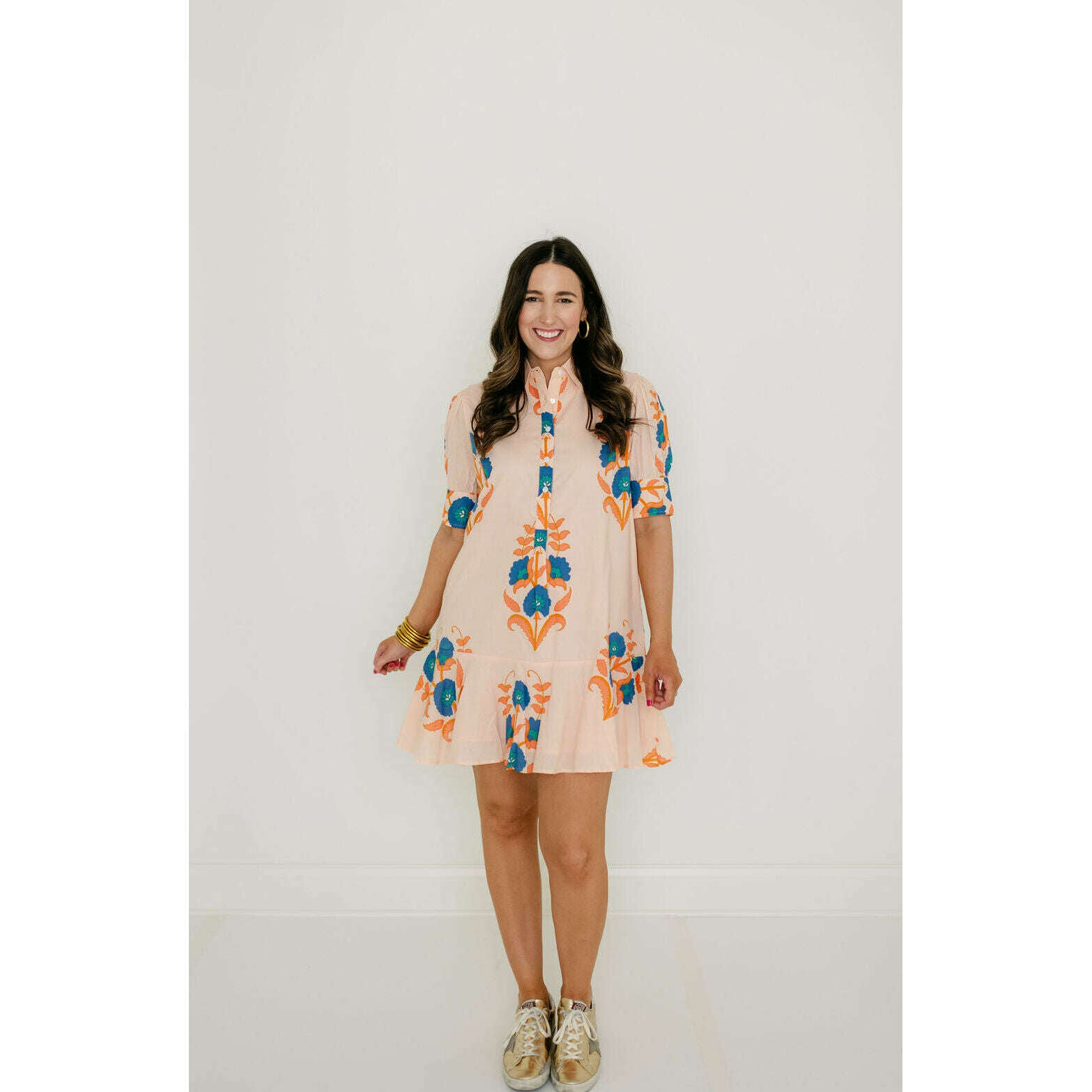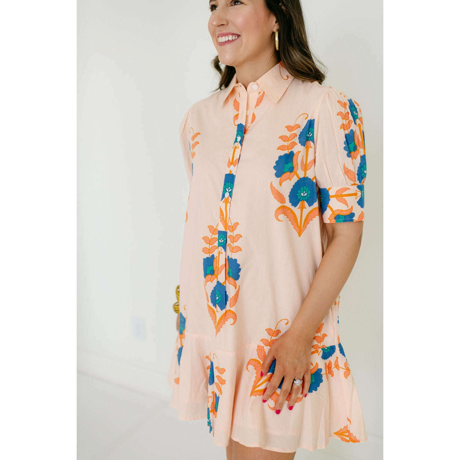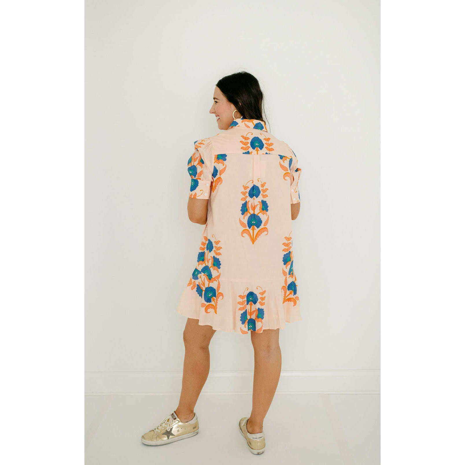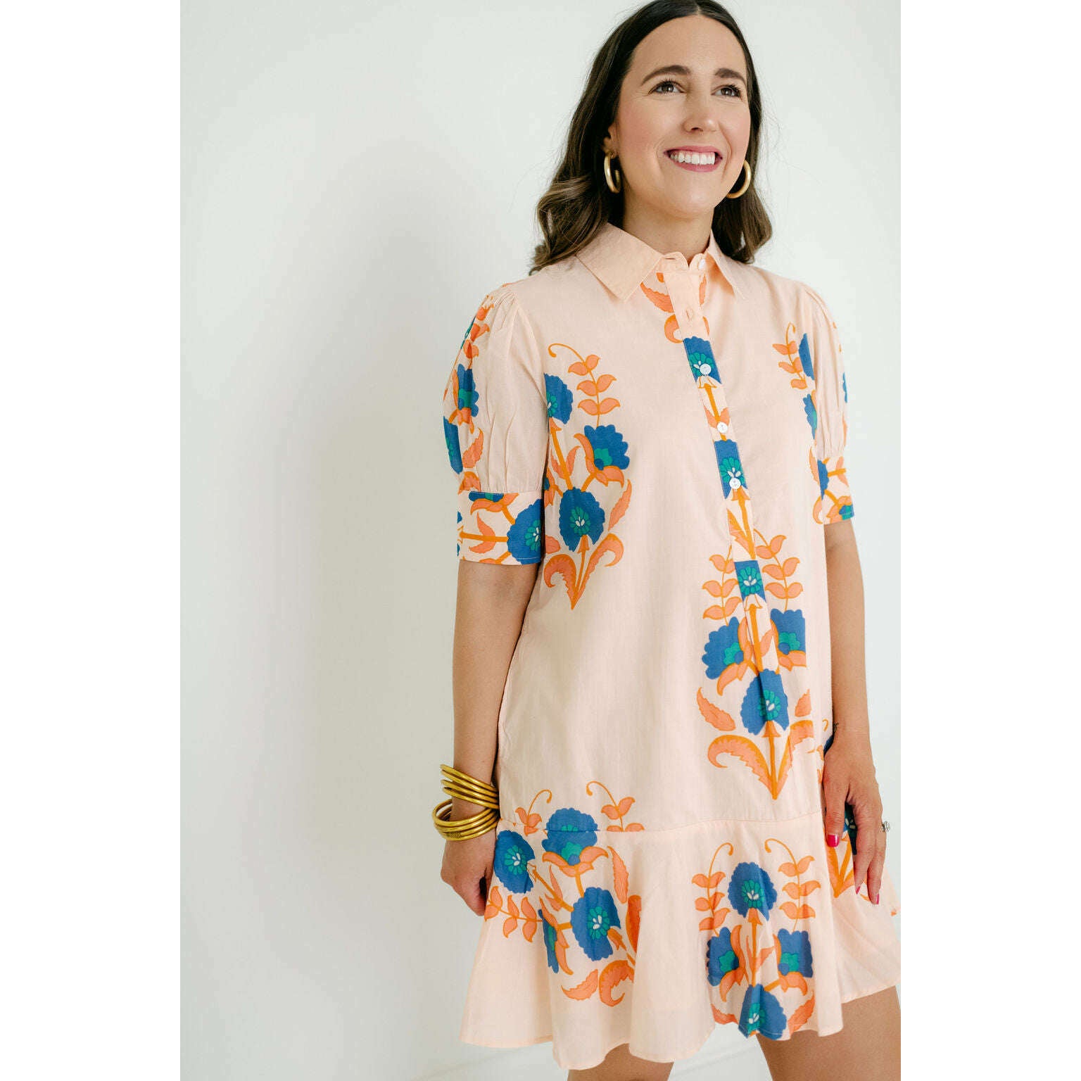The Liv Dress is a playful mini dress with a tailored bodice and a relaxed drop-waist silhouette. It features short puff sleeves with cuff detailing, a classic shirt collar, and a partial button placket down the front. The skirt is finished with a flounced hem for a feminine, swingy shape.