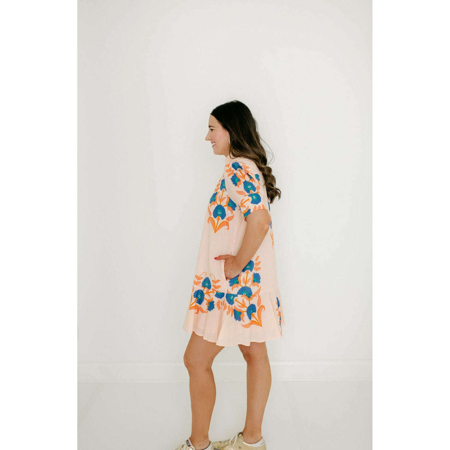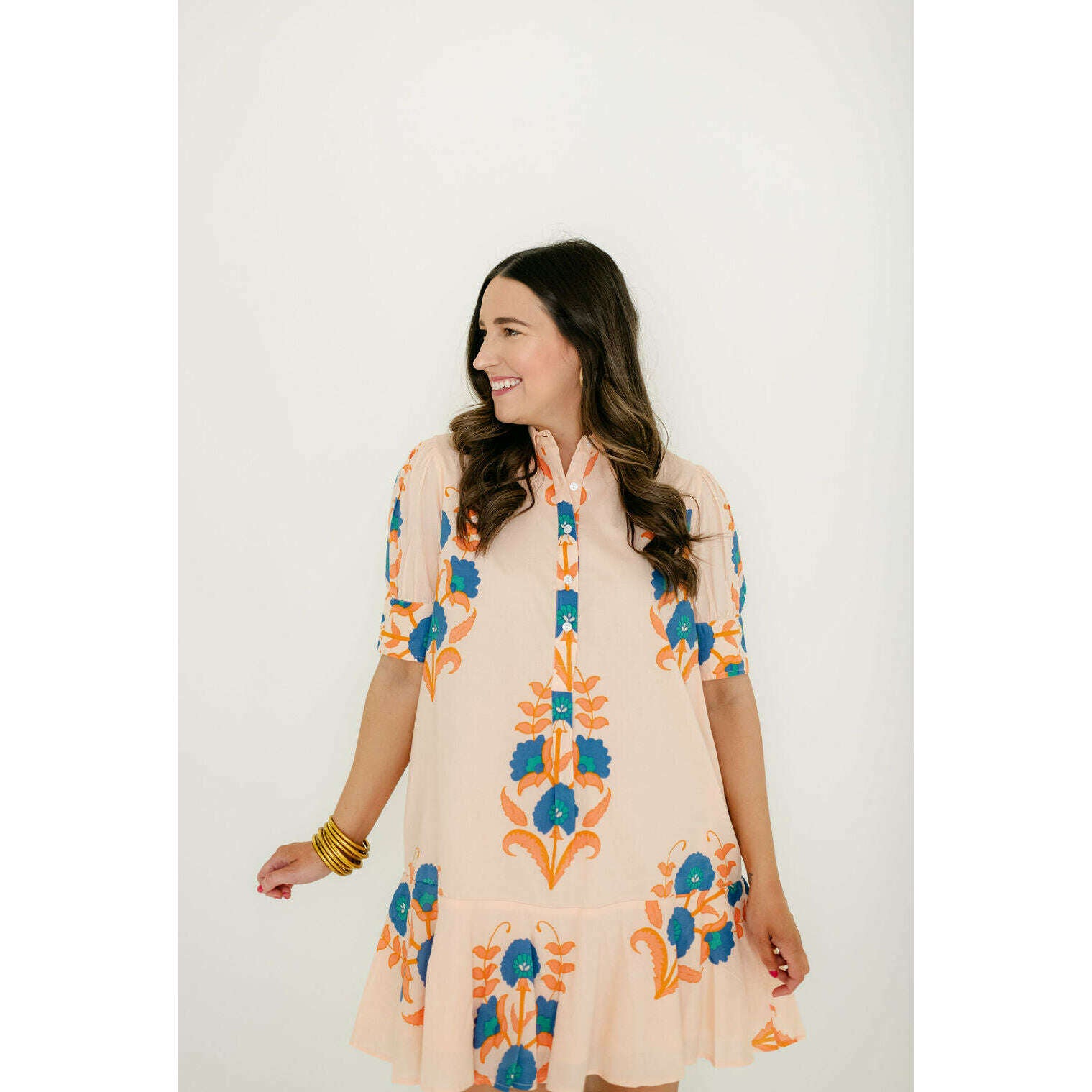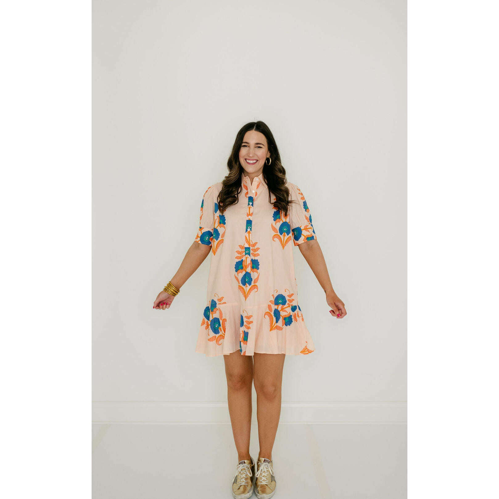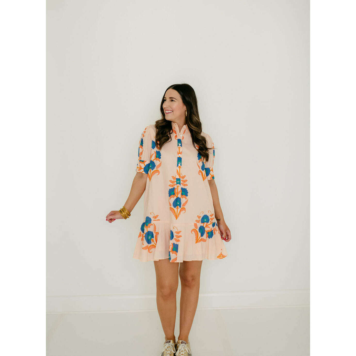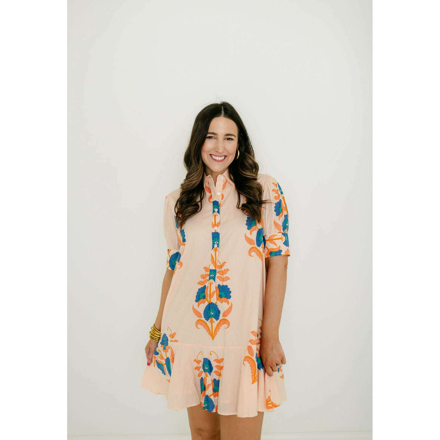 The Liv Dress is a playful mini dress with a tailored bodice and a relaxed drop-waist silhouette. It features short puff sleeves with cuff detailing, a classic shirt collar, and a partial button placket down the front. The skirt is finished with a flounced hem for a feminine, swingy shape.