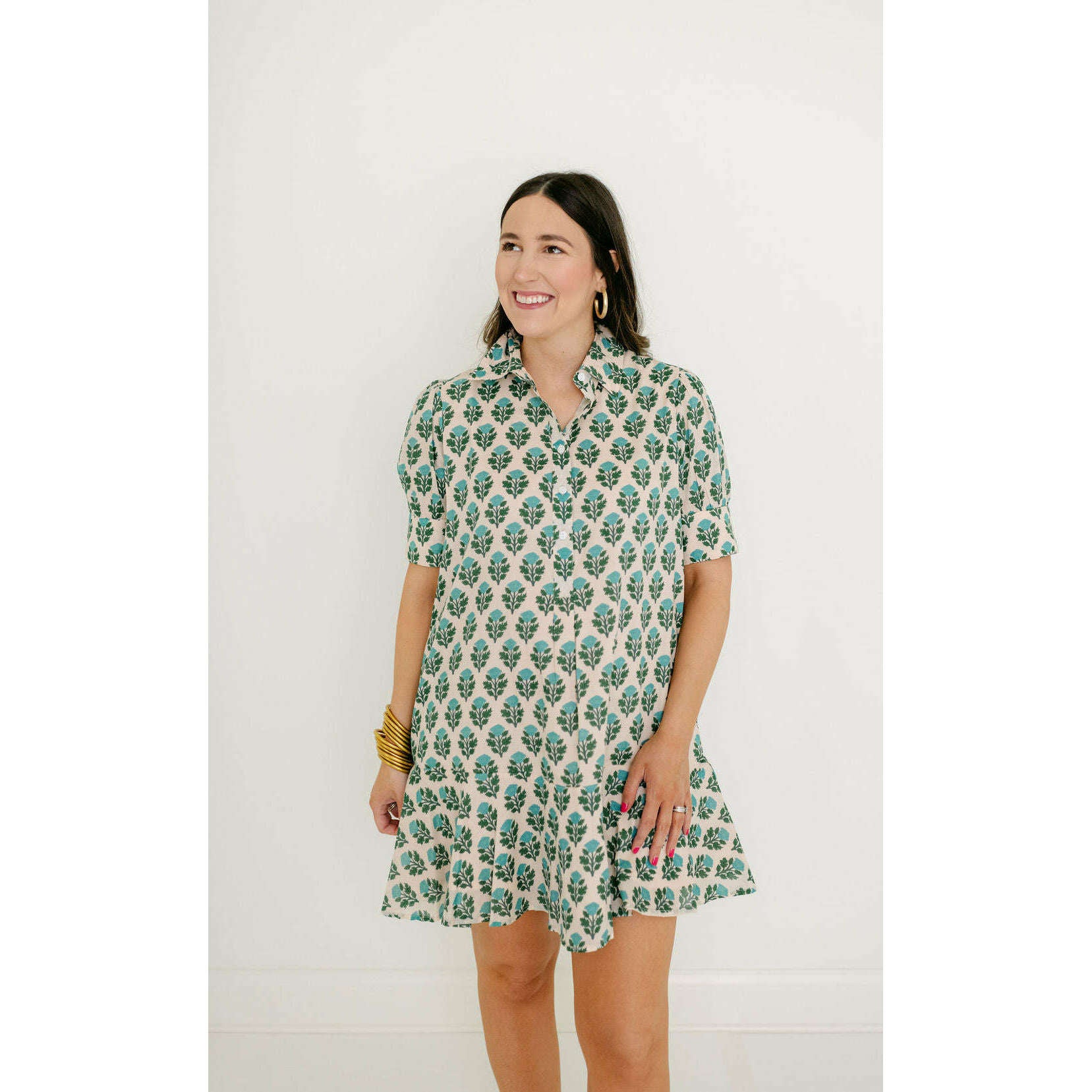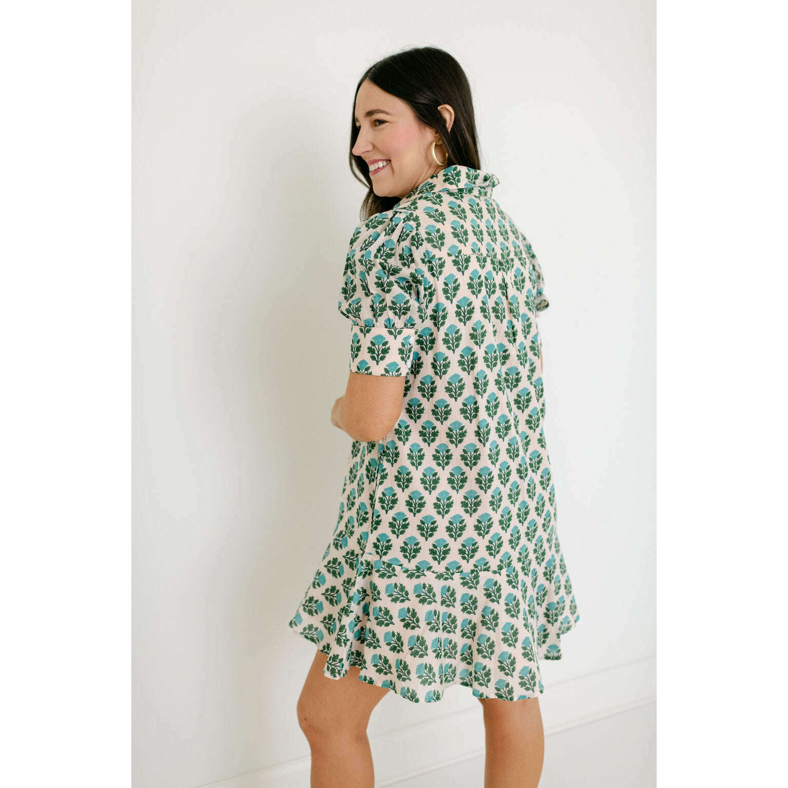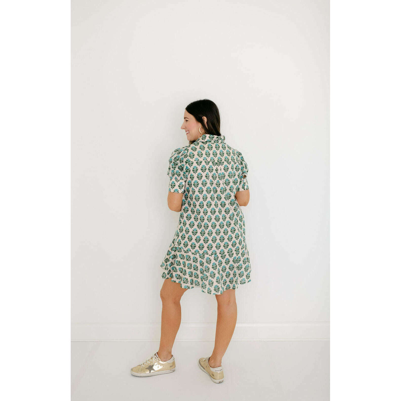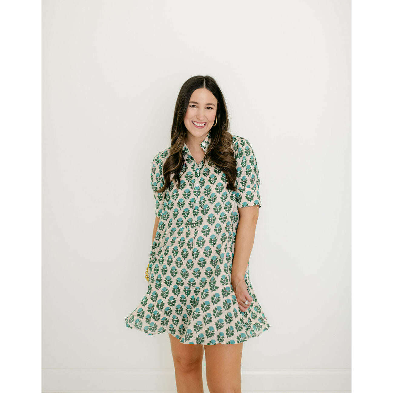 The Livro Liv Dress is a playful mini dress with a tailored bodice and a relaxed drop-waist silhouette. It features short puff sleeves with cuff detailing, a classic shirt collar, and a partial button placket down the front. The skirt is finished with a flounced hem for a feminine, swingy shape.