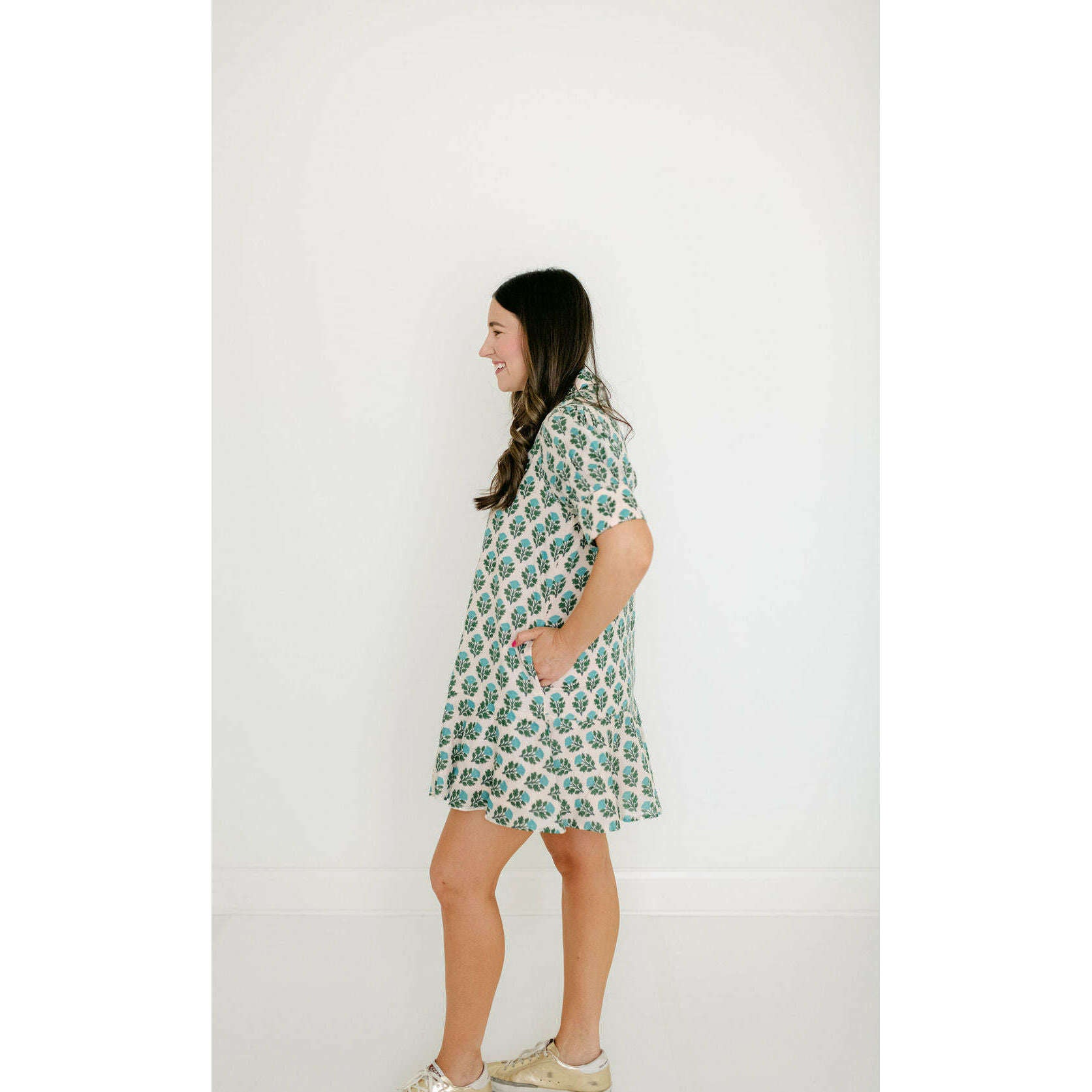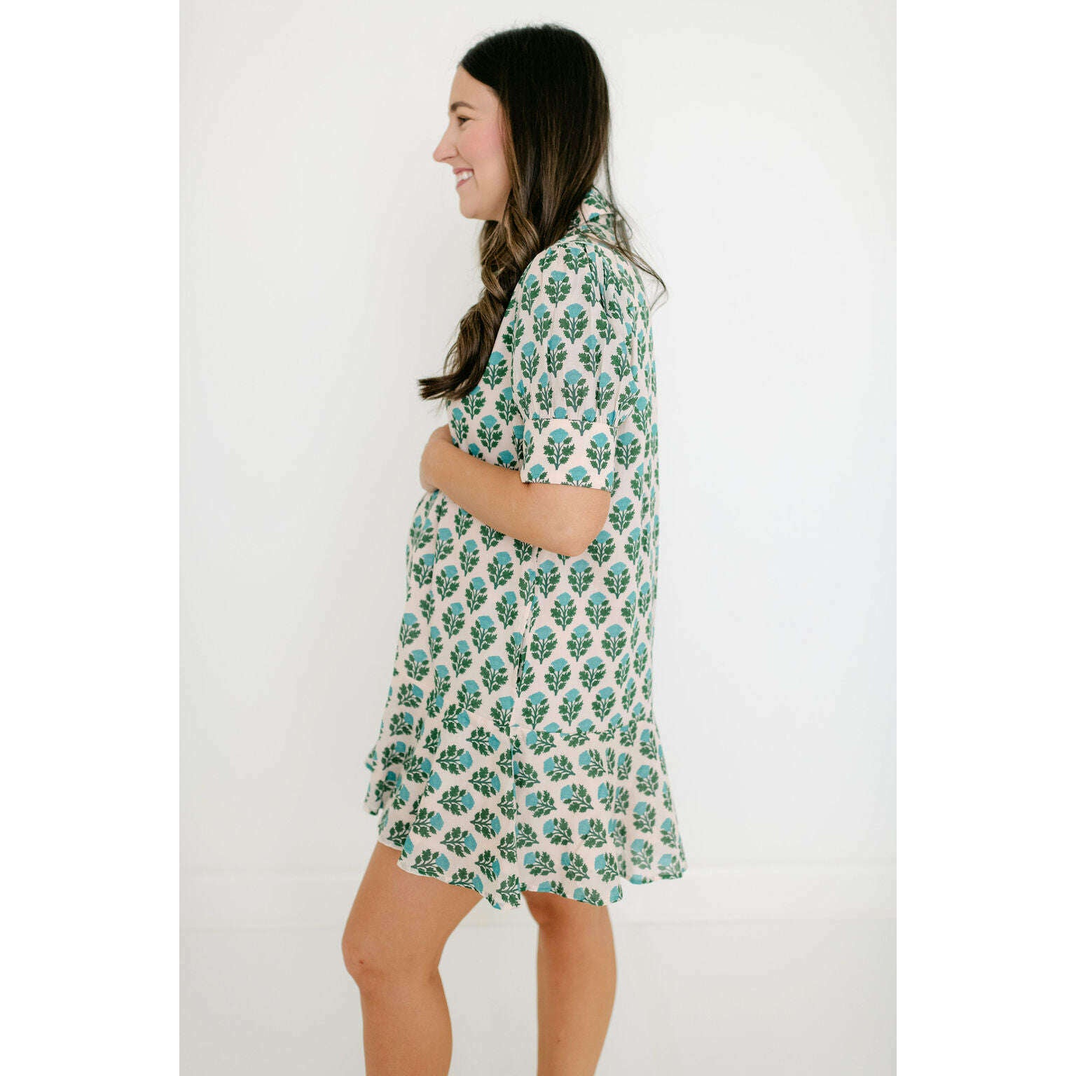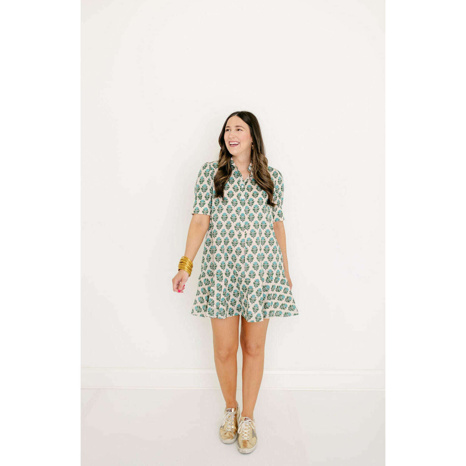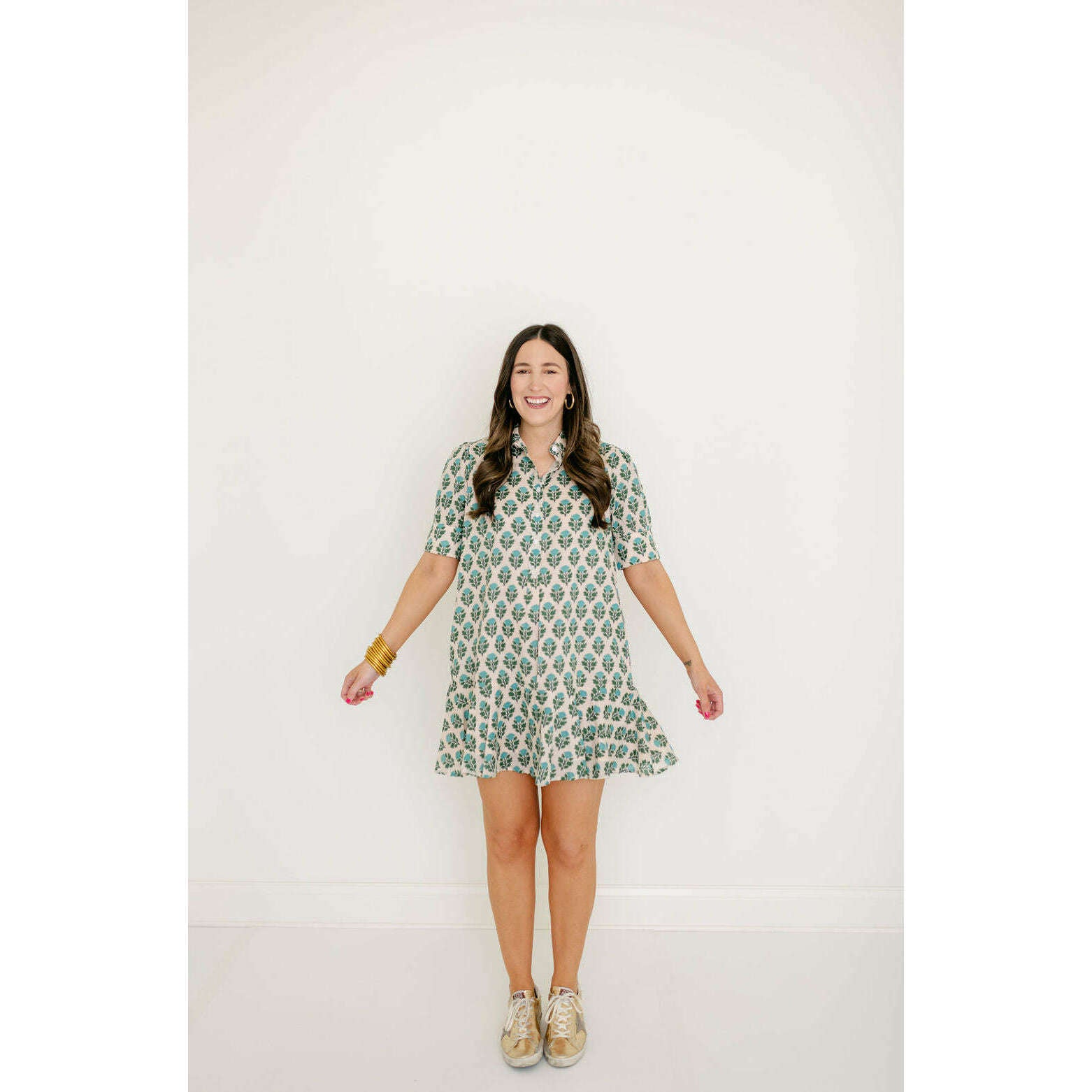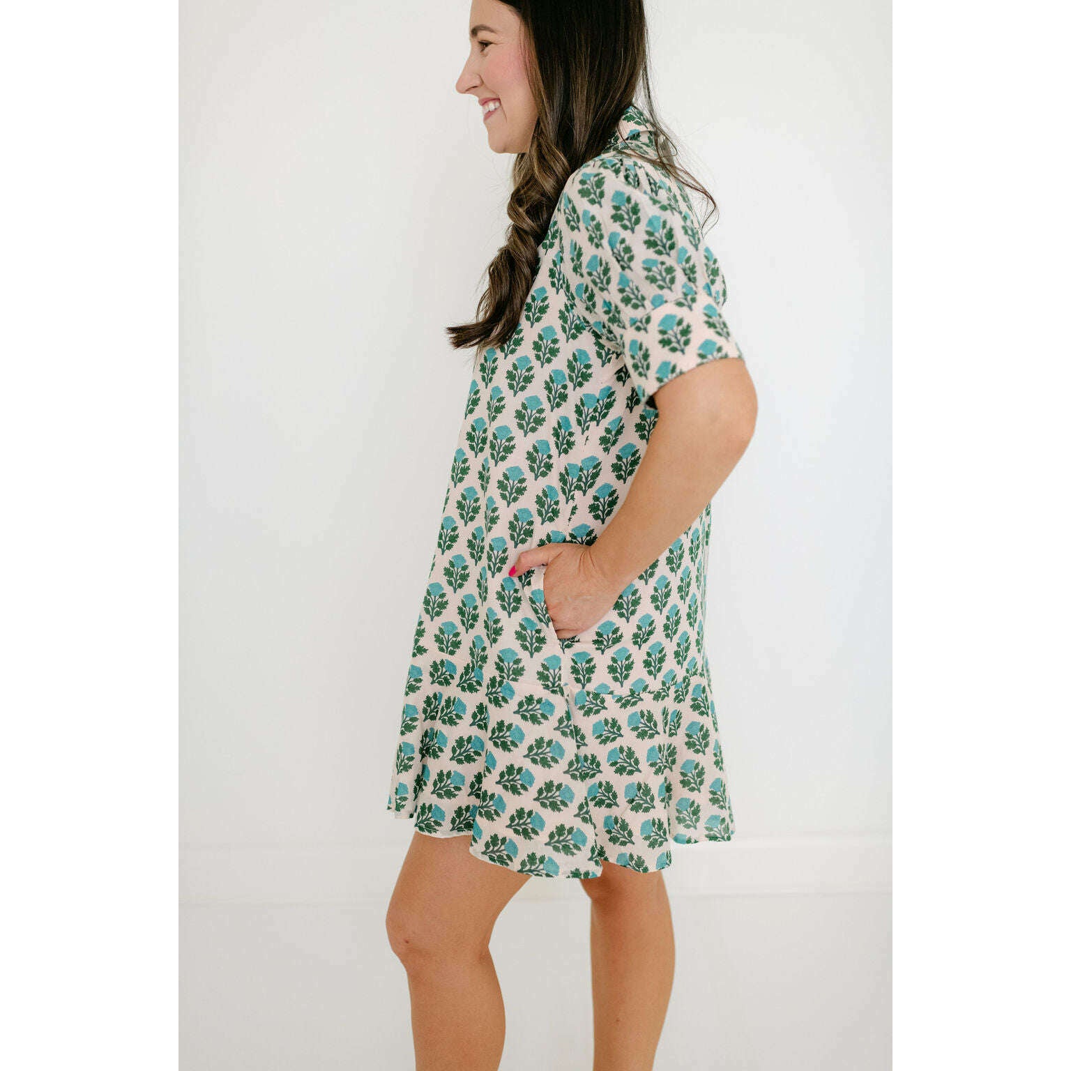 The Livro Liv Dress is a playful mini dress with a tailored bodice and a relaxed drop-waist silhouette. It features short puff sleeves with cuff detailing, a classic shirt collar, and a partial button placket down the front. The skirt is finished with a flounced hem for a feminine, swingy shape.