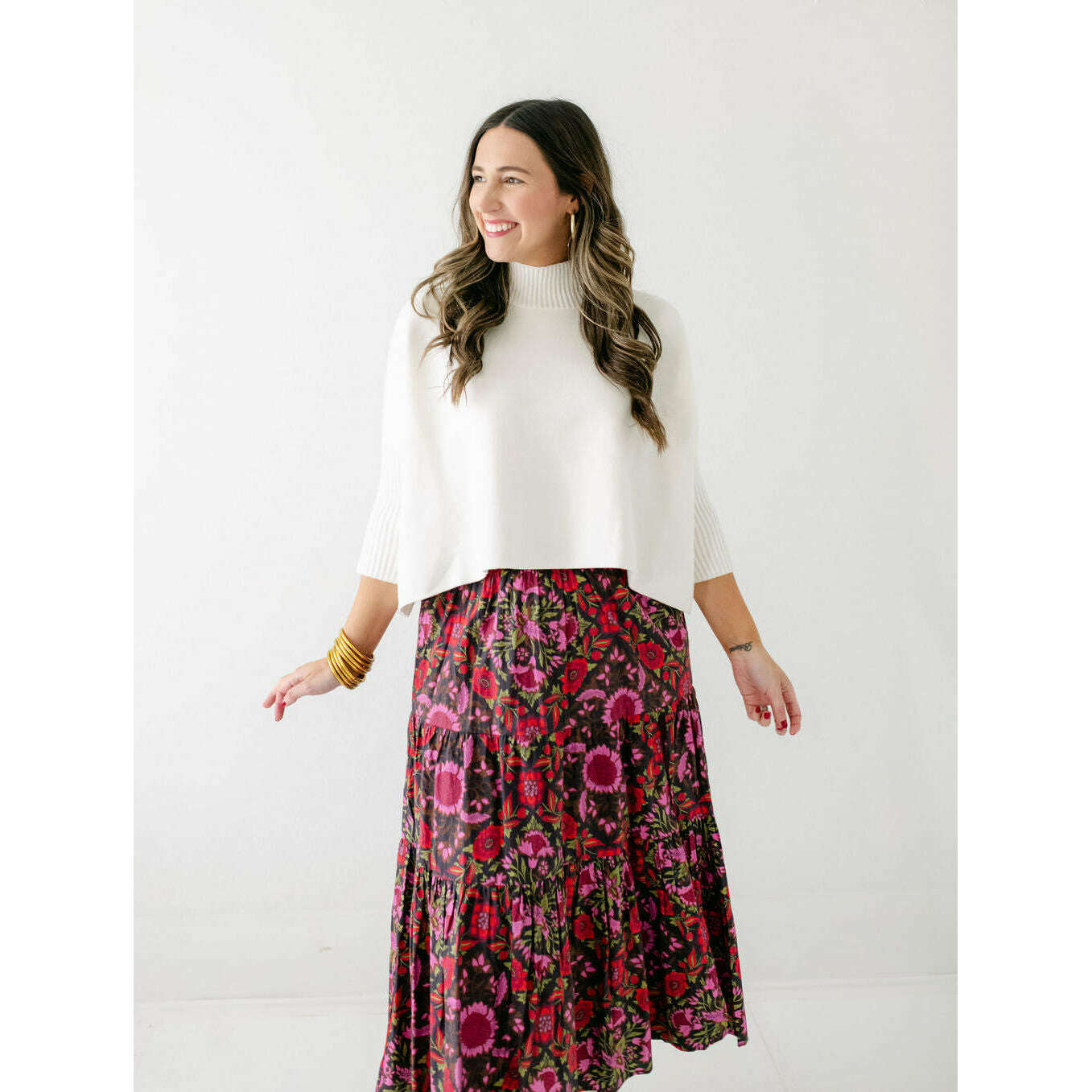 The Love the Label Isabelle Skirt in Tabitha Floral Print brings a playful charm with its vibrant floral pattern and a stylish side slit that adds just the right touch of movement. Perfect for any season, it pairs effortlessly with a cozy white Aja sweater to create a fresh, polished look that stands out. Elevate your wardrobe with this skirt that combines comfort and flair in one irresistible piece.