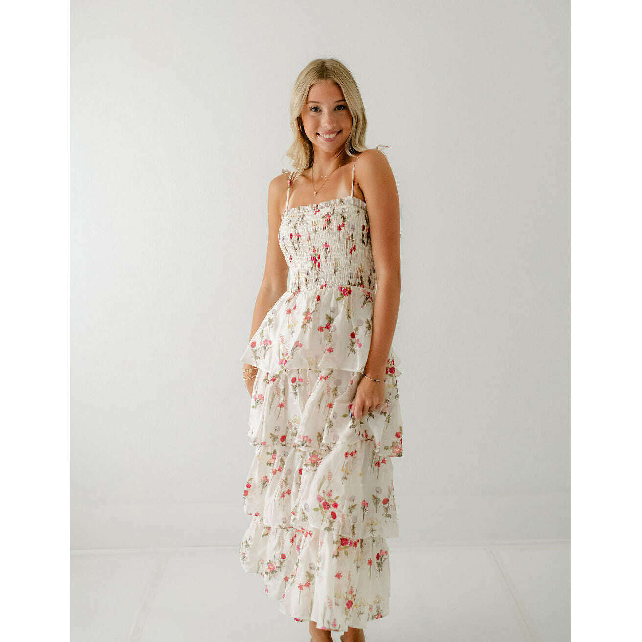 Embrace effortless elegance with the Lucy Paris Olive Tiered Dress. Featuring a smocked bodice for a flattering fit and adjustable tie straps, this floral long dress combines comfort with feminine charm. Its flowing tiers create graceful movement, making it perfect for both casual outings and special occasions. Elevate your wardrobe with this versatile, stylish piece that celebrates timeless floral beauty.