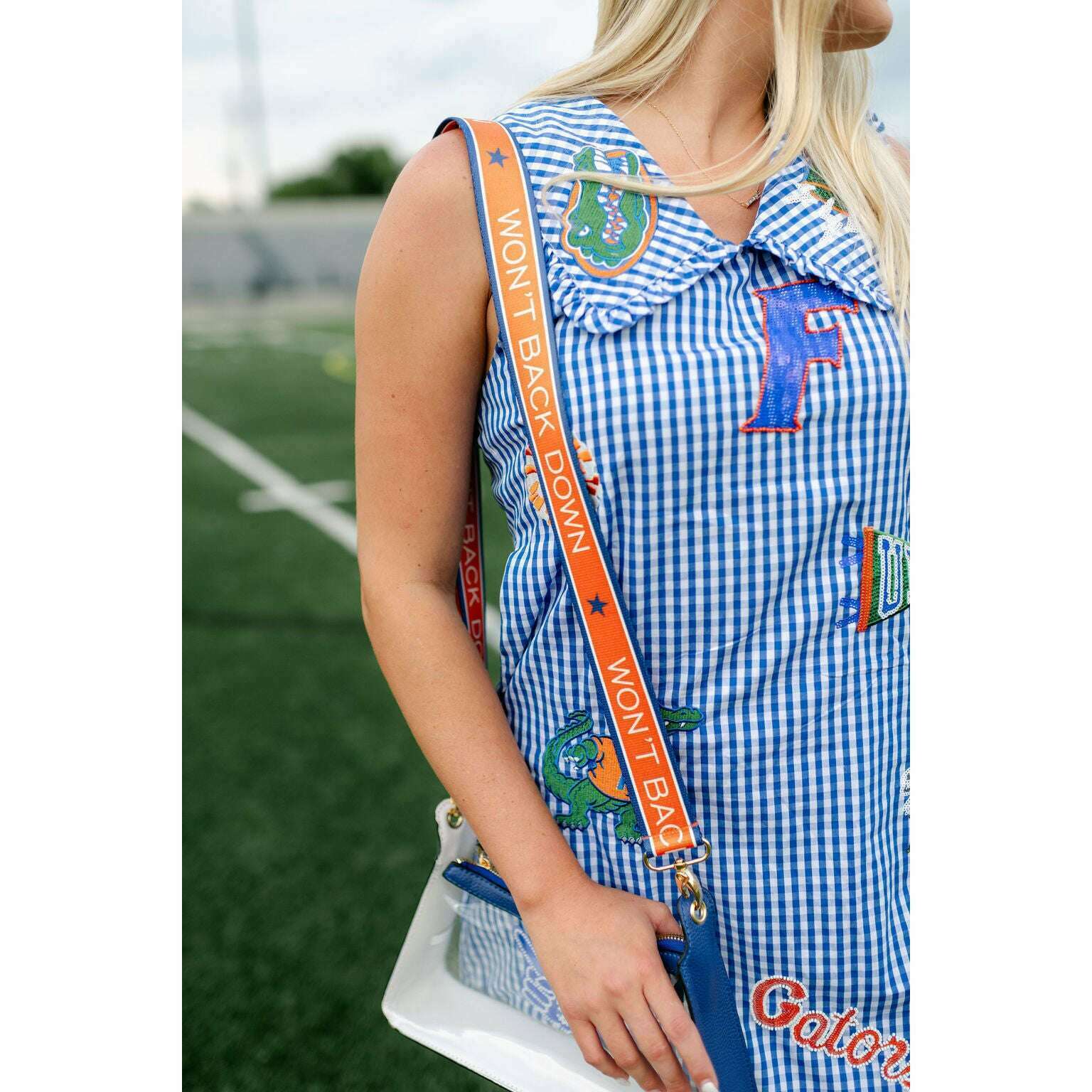 Stand out at your next game day with these Won't Back Down custom straps! As a Florida fan, you know the song and these straps were made just for you. They're not only cute, but they'll keep your game day outfit secure. Don't miss out on this unique accessory. (Go Gators!)