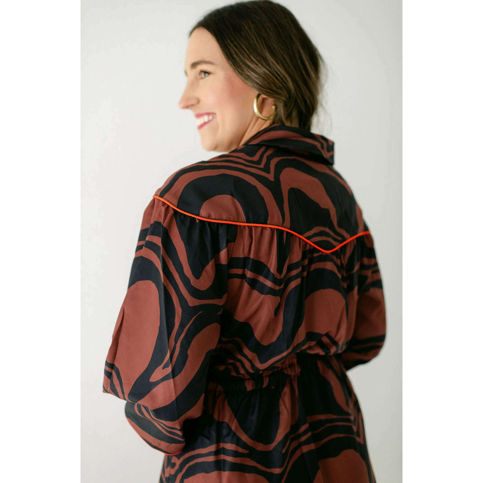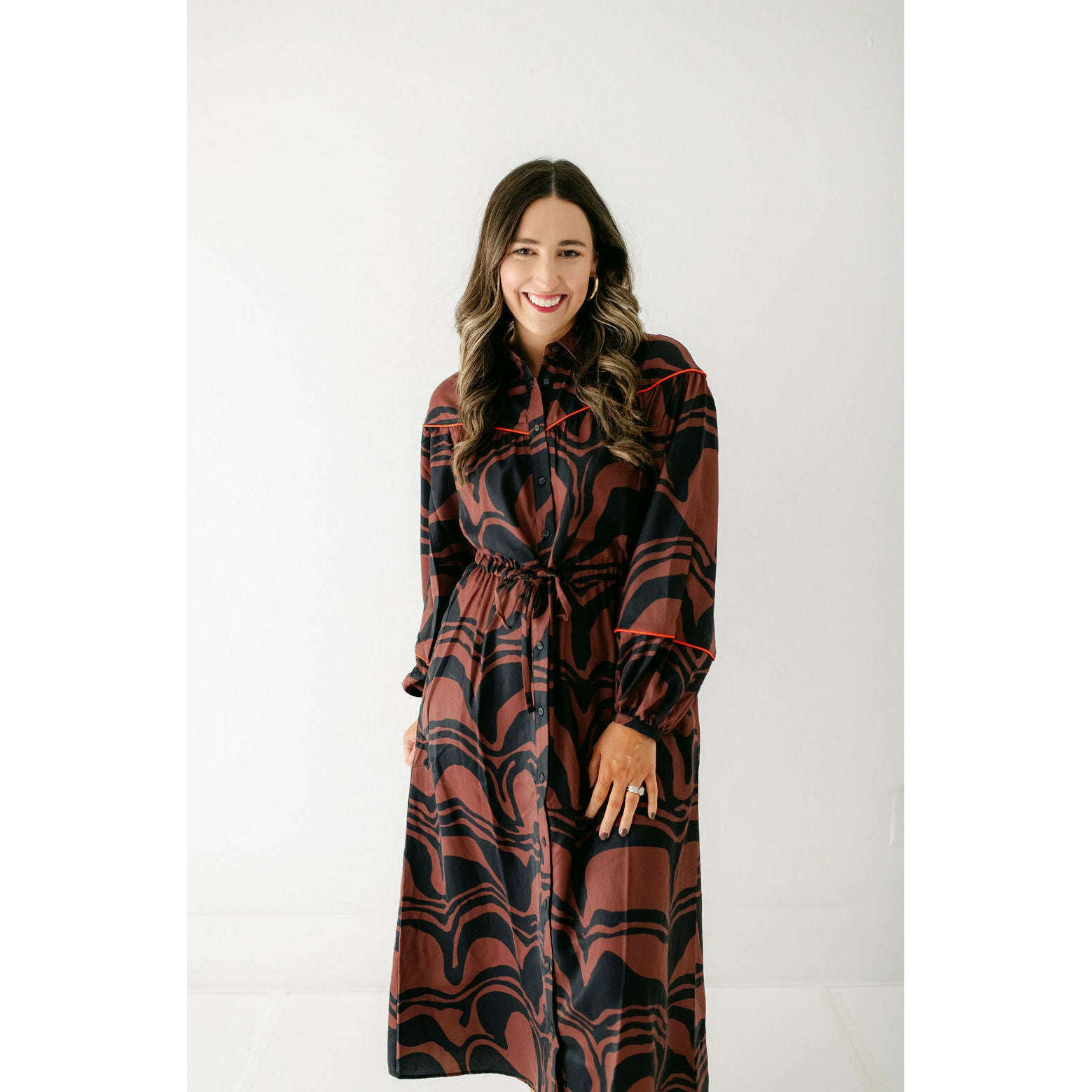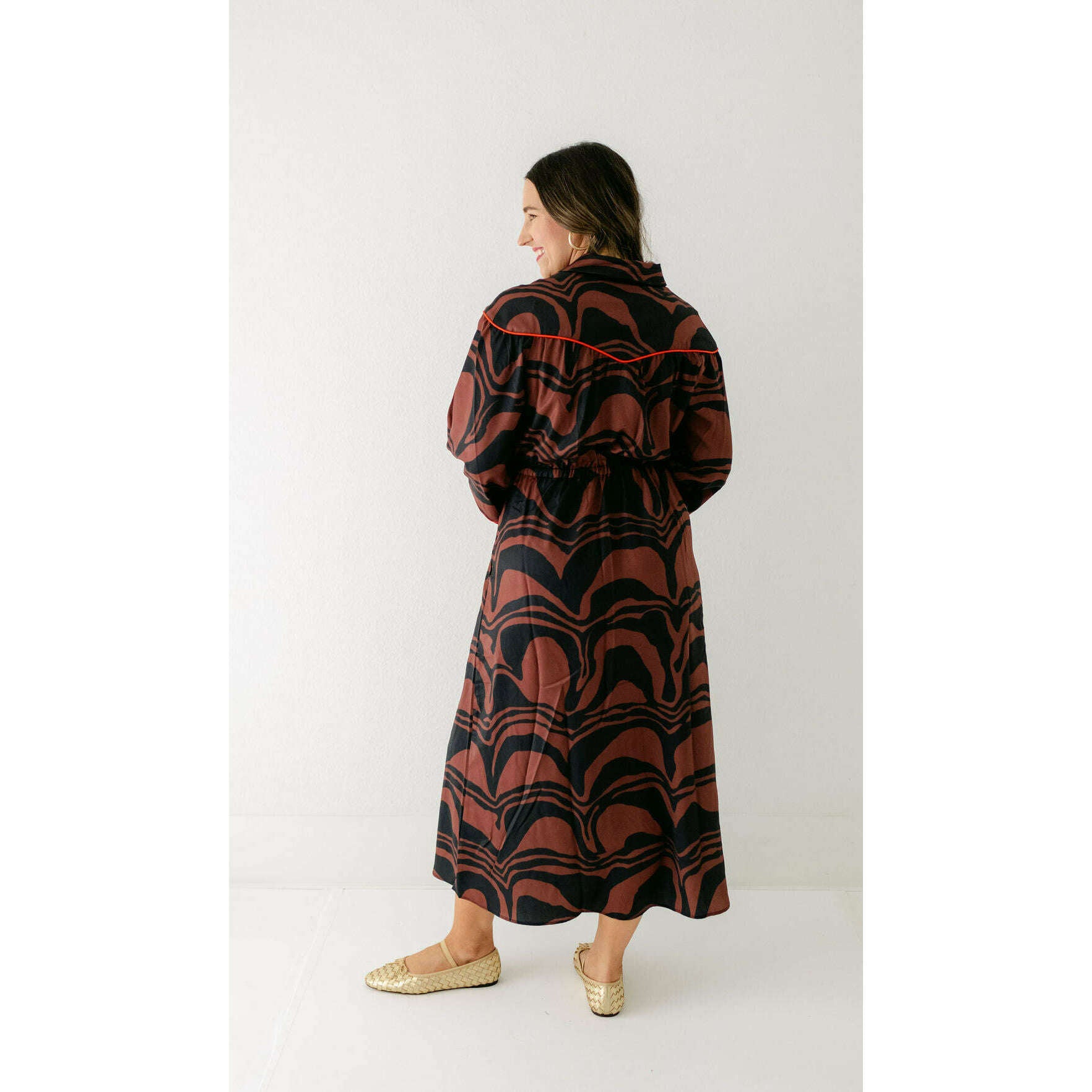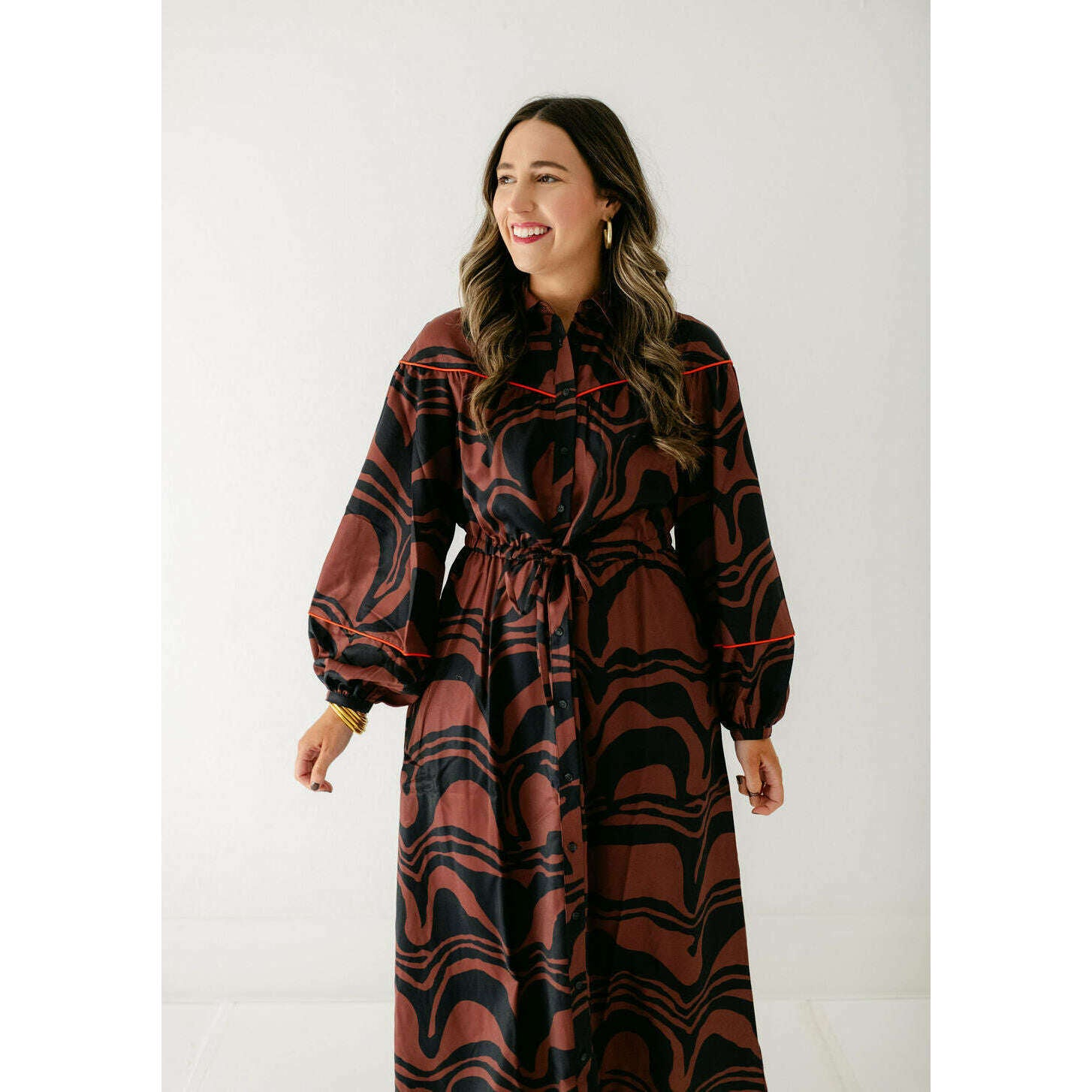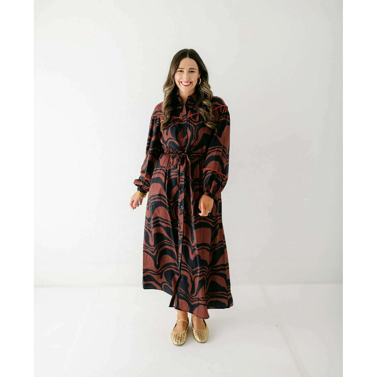 The perfect fall dress has arrived! Lucille is designed with a cinched waist, statement balloon sleeves, pockets, and a classic button front. The Canyon and Western Craft colorways feature bold contrasting piping details
