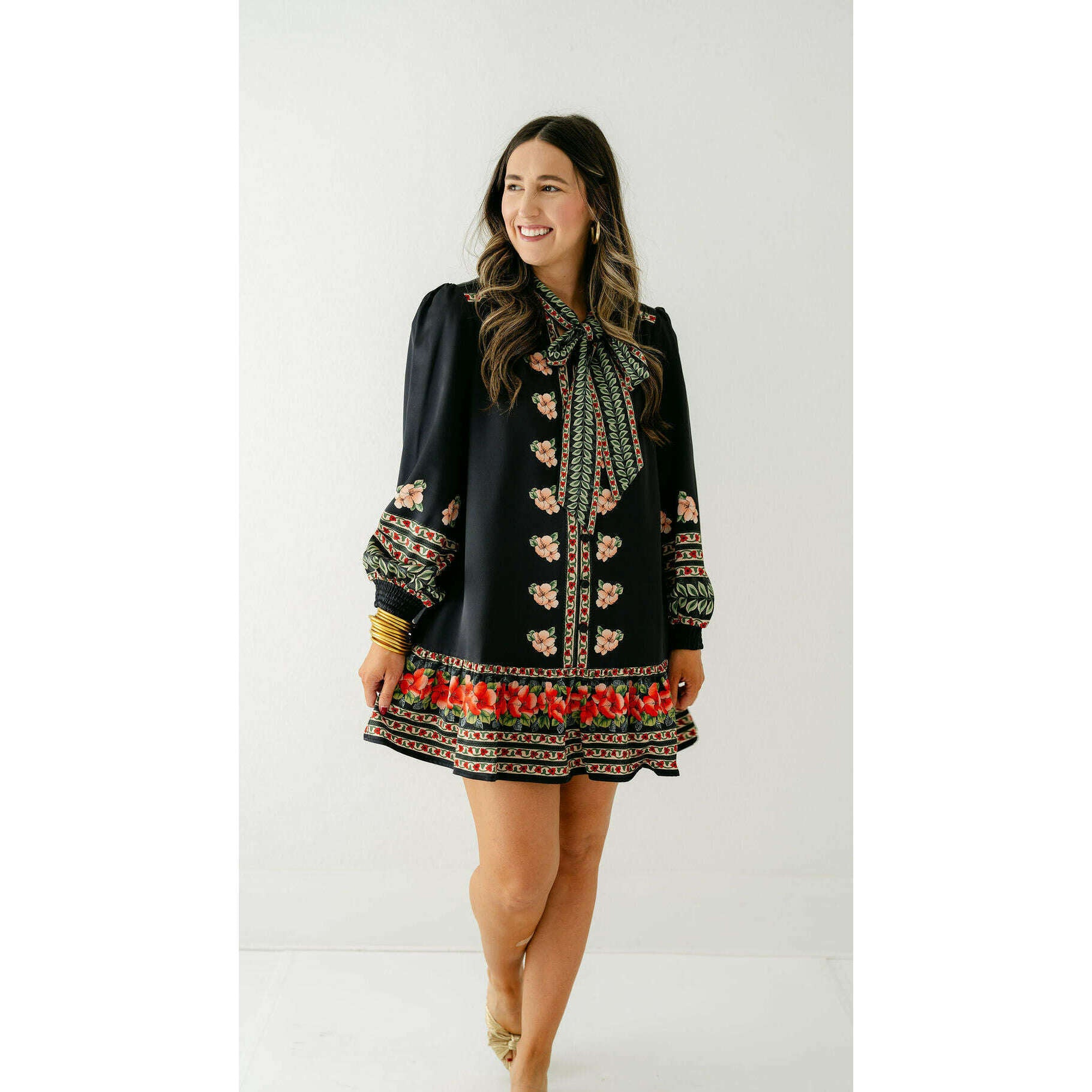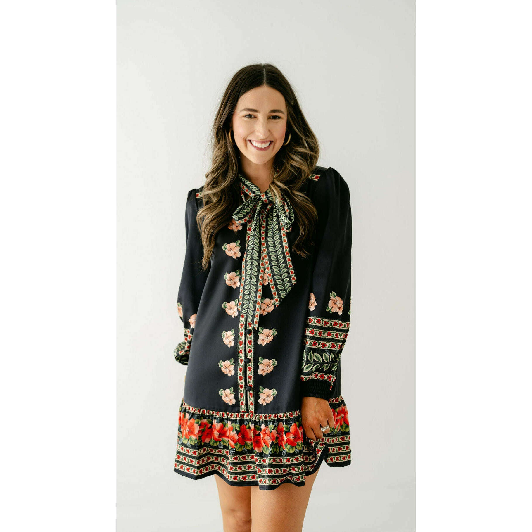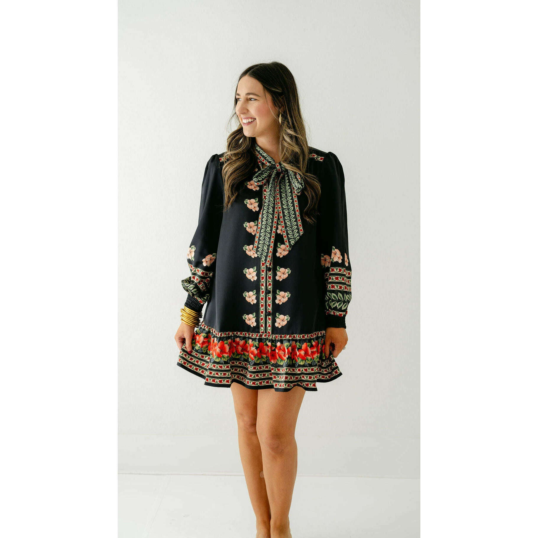 Our darling, feminine Elizabeth James Brit Bow blouse just got even better! We added a ruffle hem skirt, turning this vintage 80's inspired silhouette into the cutest Holiday mini dress. Pair with some black tights and heels for an easy, chic look.