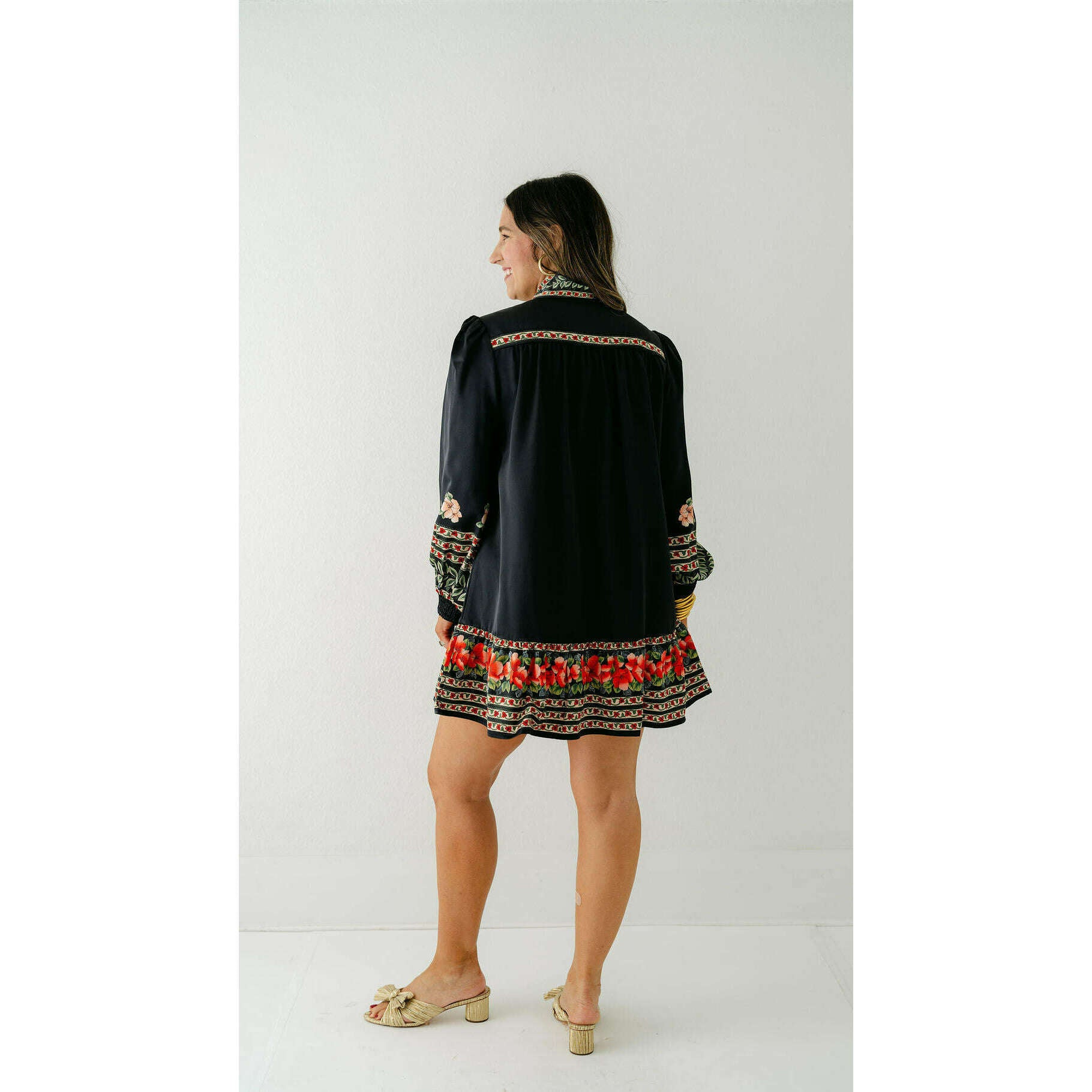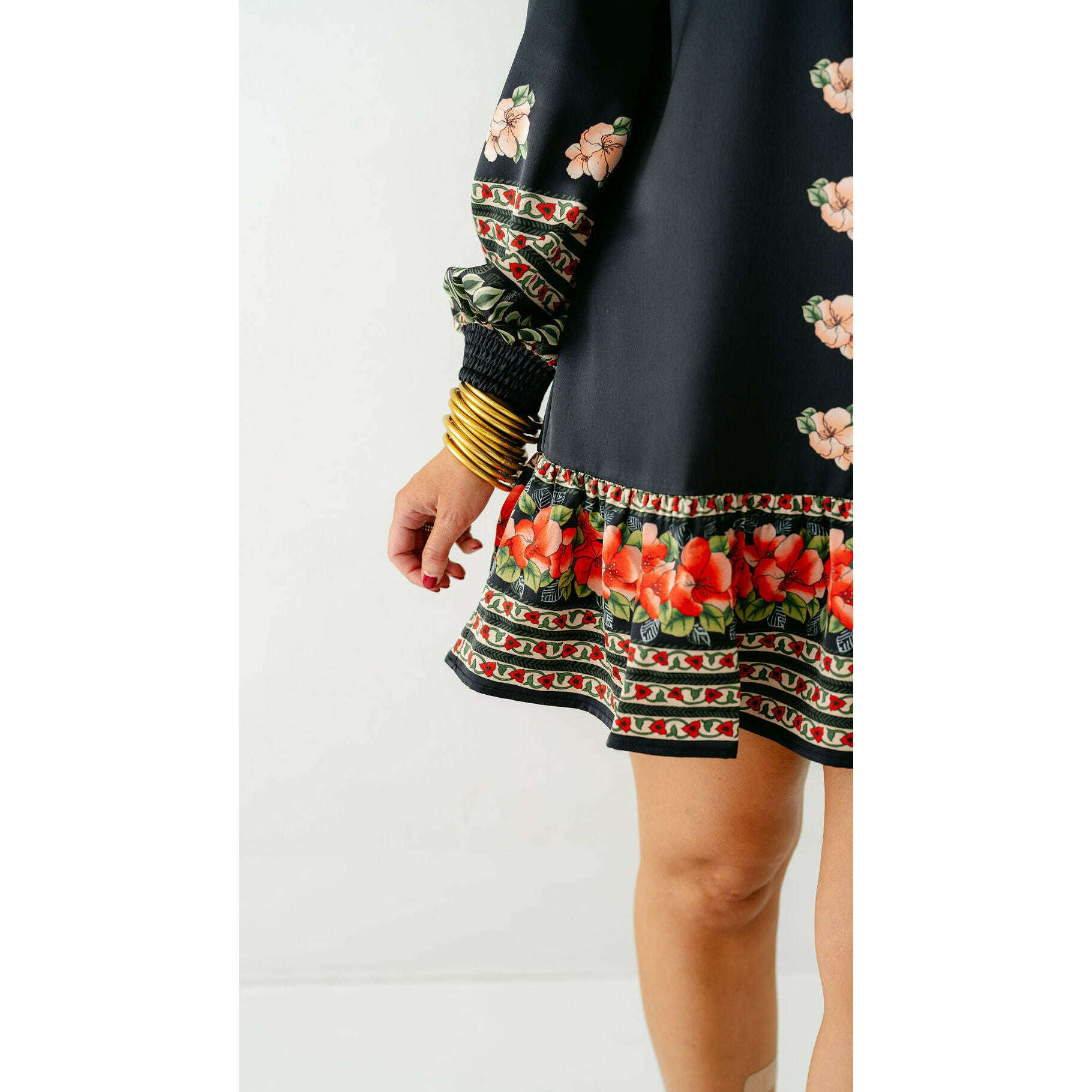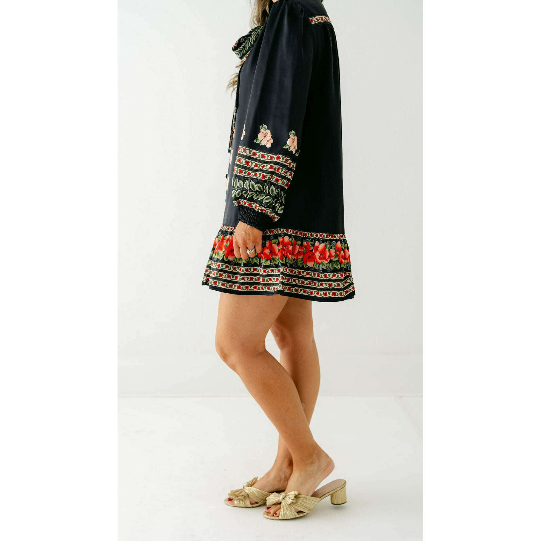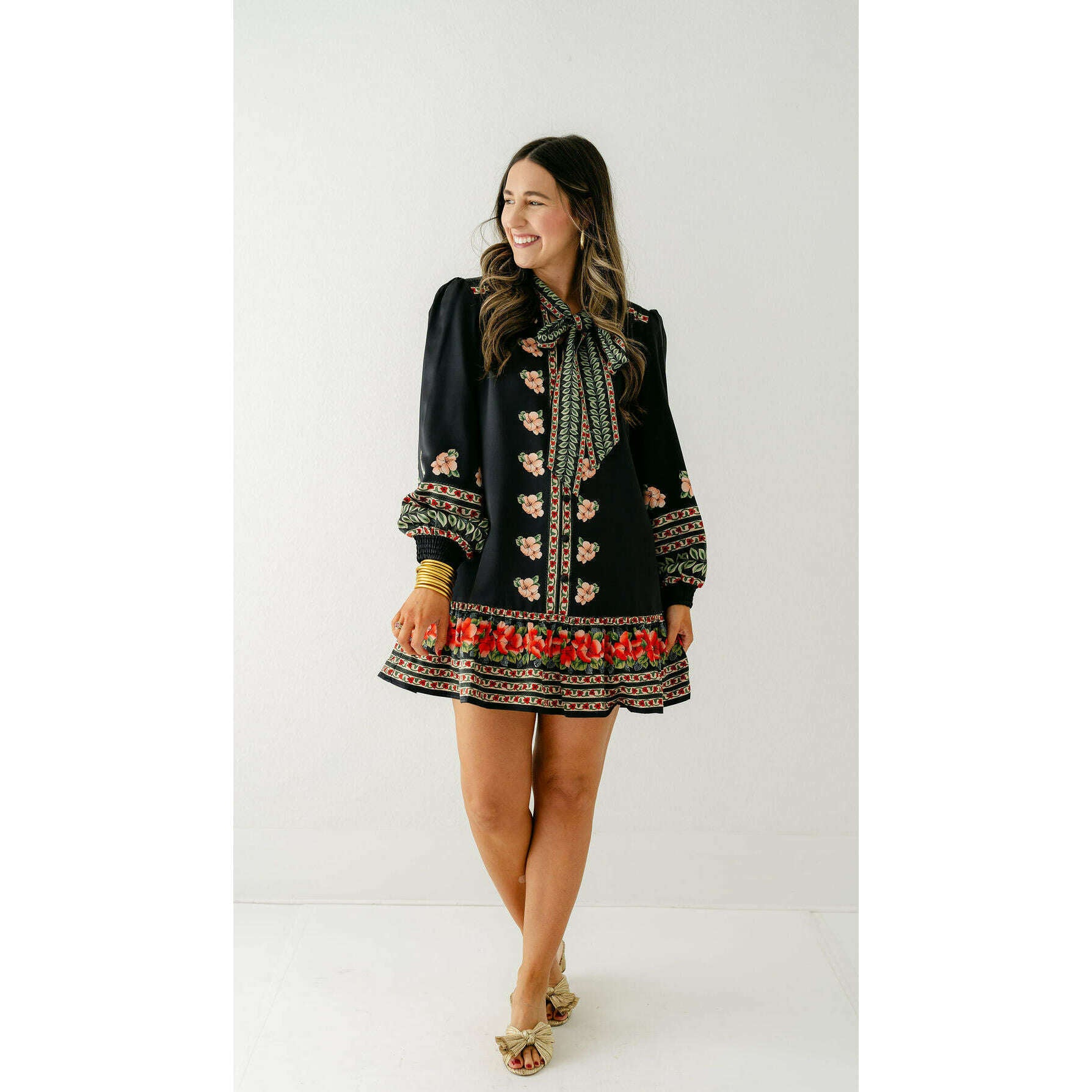 Our darling, feminine Elizabeth James Brit Bow blouse just got even better! We added a ruffle hem skirt, turning this vintage 80's inspired silhouette into the cutest Holiday mini dress. Pair with some black tights and heels for an easy, chic look.
