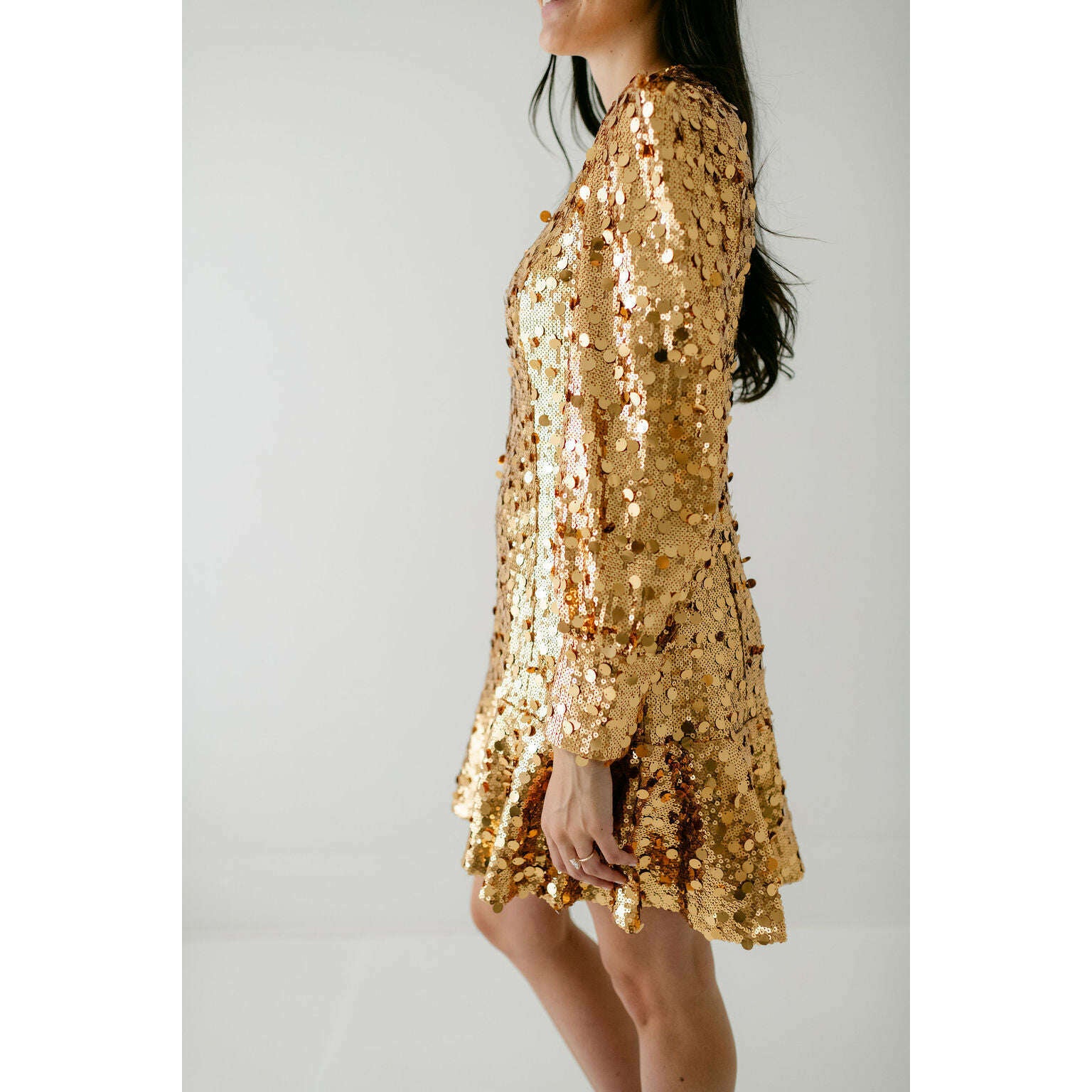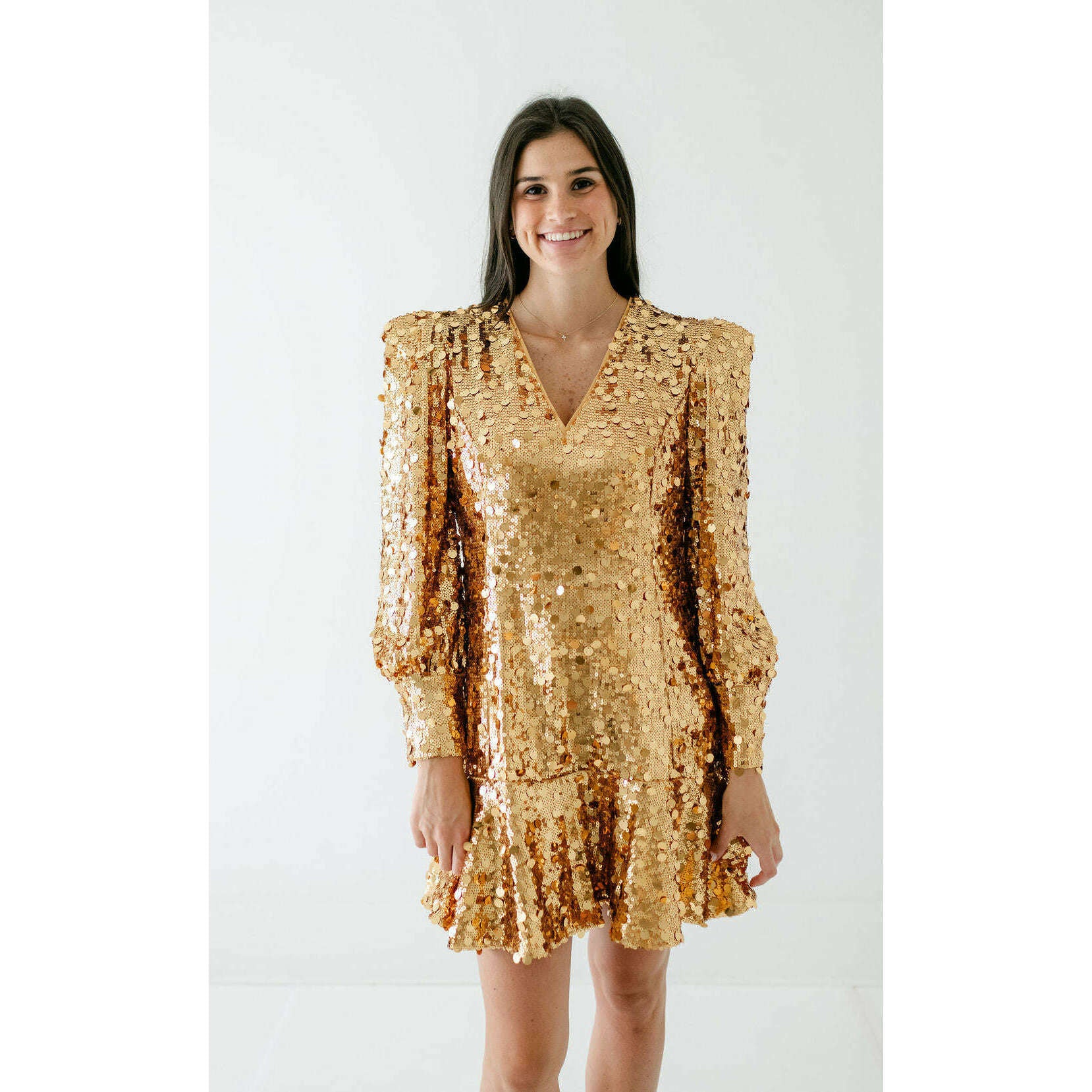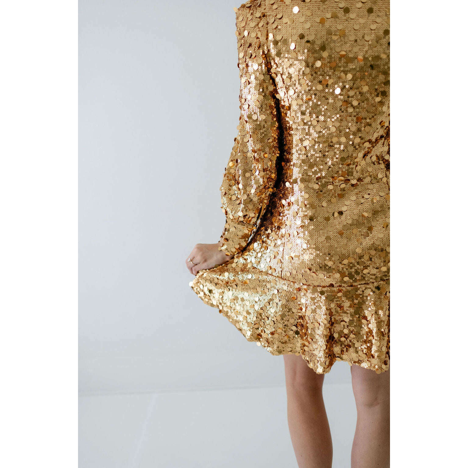 The Emily McCarthy Jenny Dress in Gold Sequin features a structured shoulder detail, flattering V-neckline, and flared tiered hem balanced with an invisible side zipper. Its tailored silhouette offers a romantic yet feminine shape, while the mix of large and small sequins creates an illuminating effect that ensures you’re the life of the party.