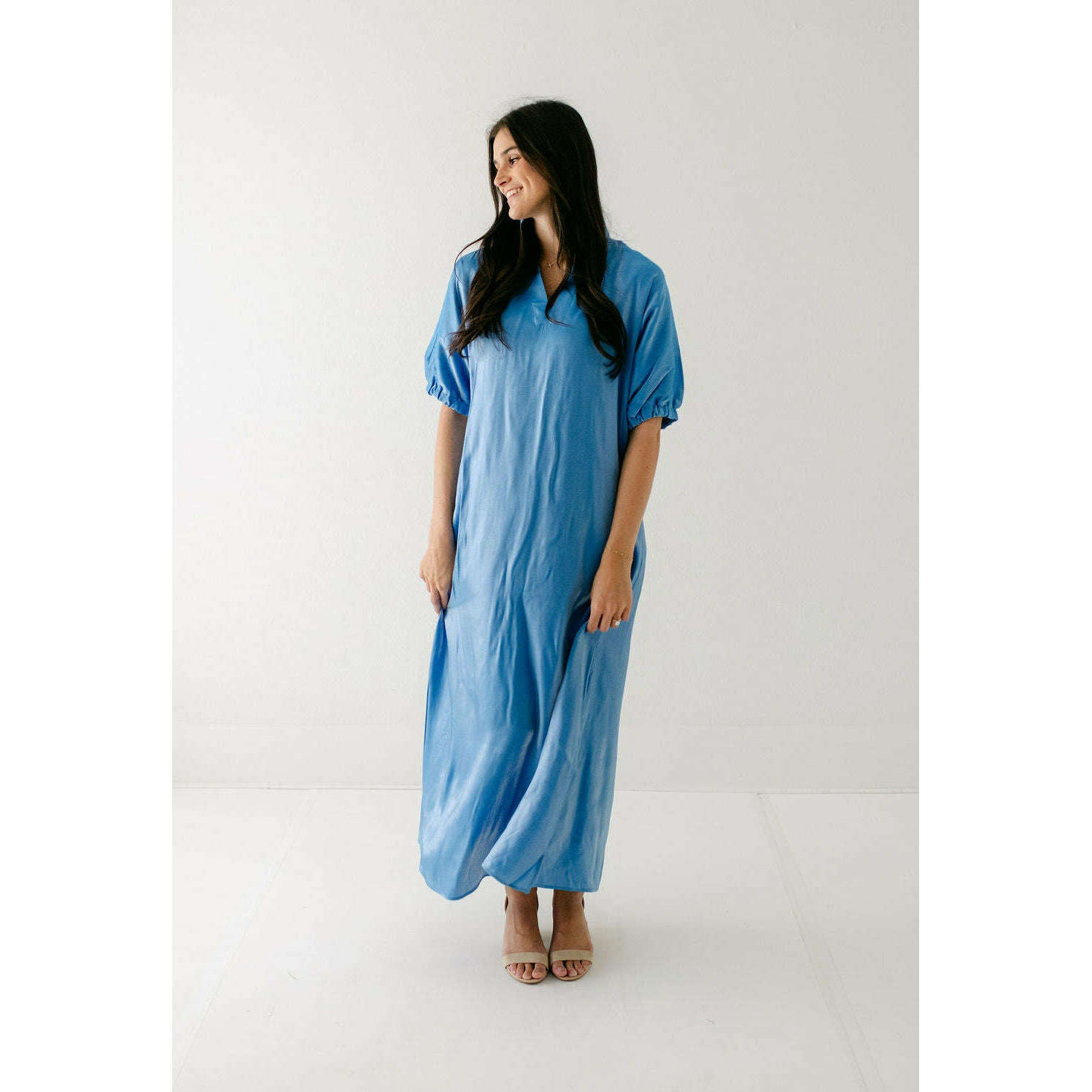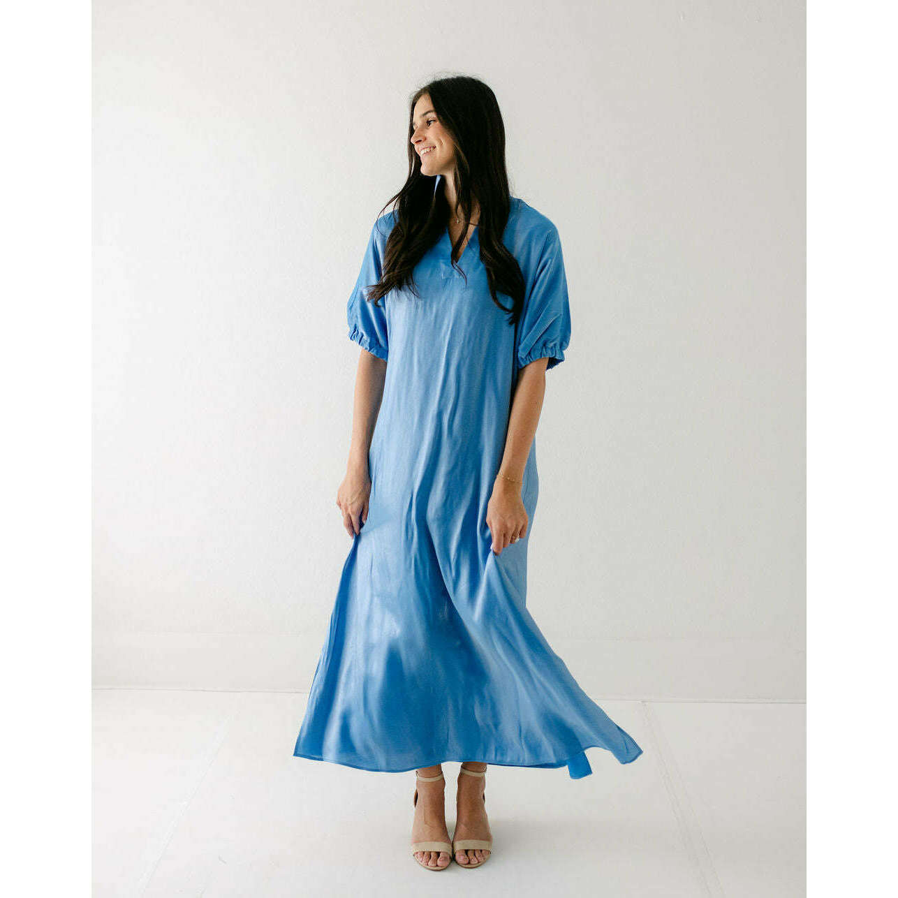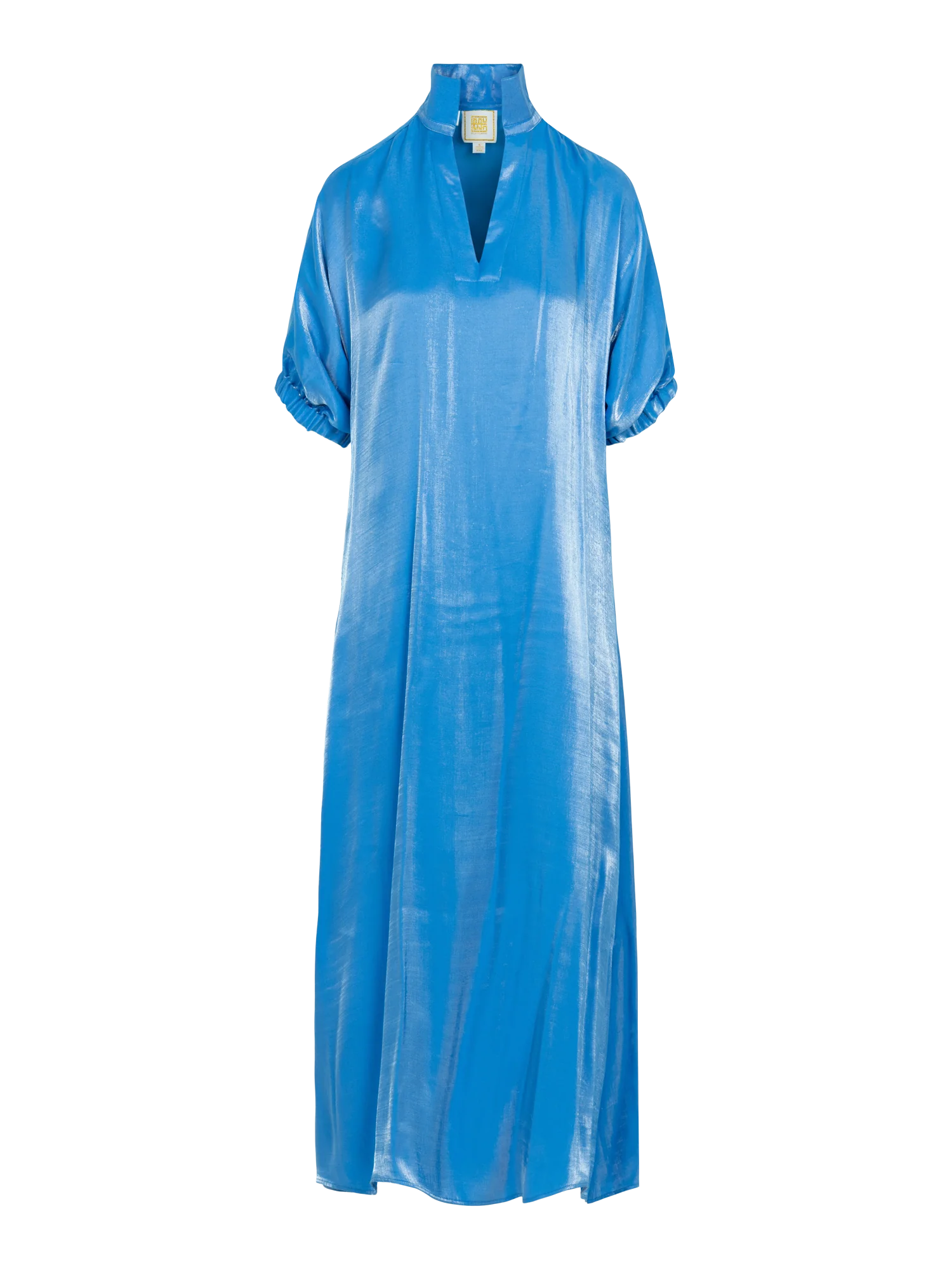 Radiant and effortlessly refined, the Emily McCarthy Poppy Maxi in Sapphire is designed to make an impression. Crafted in an illuminating silk blend that catches the light with every move, this maxi dress features a classic stand collar, loose elastic dolman sleeves, and an easy, flowy silhouette. Equal parts comfort and polish, it’s the perfect choice for elevated occasions when you want to turn heads—while feeling completely at ease.