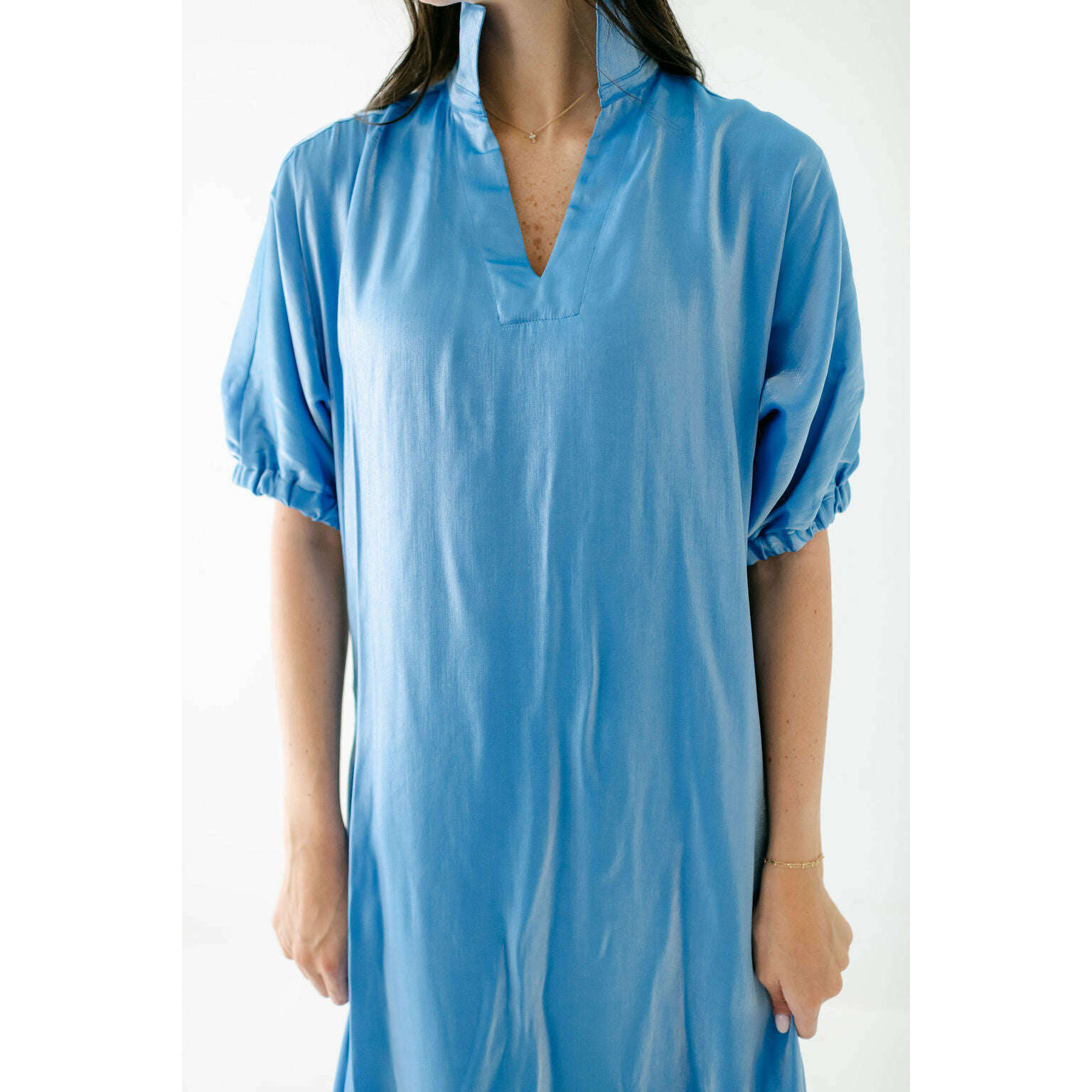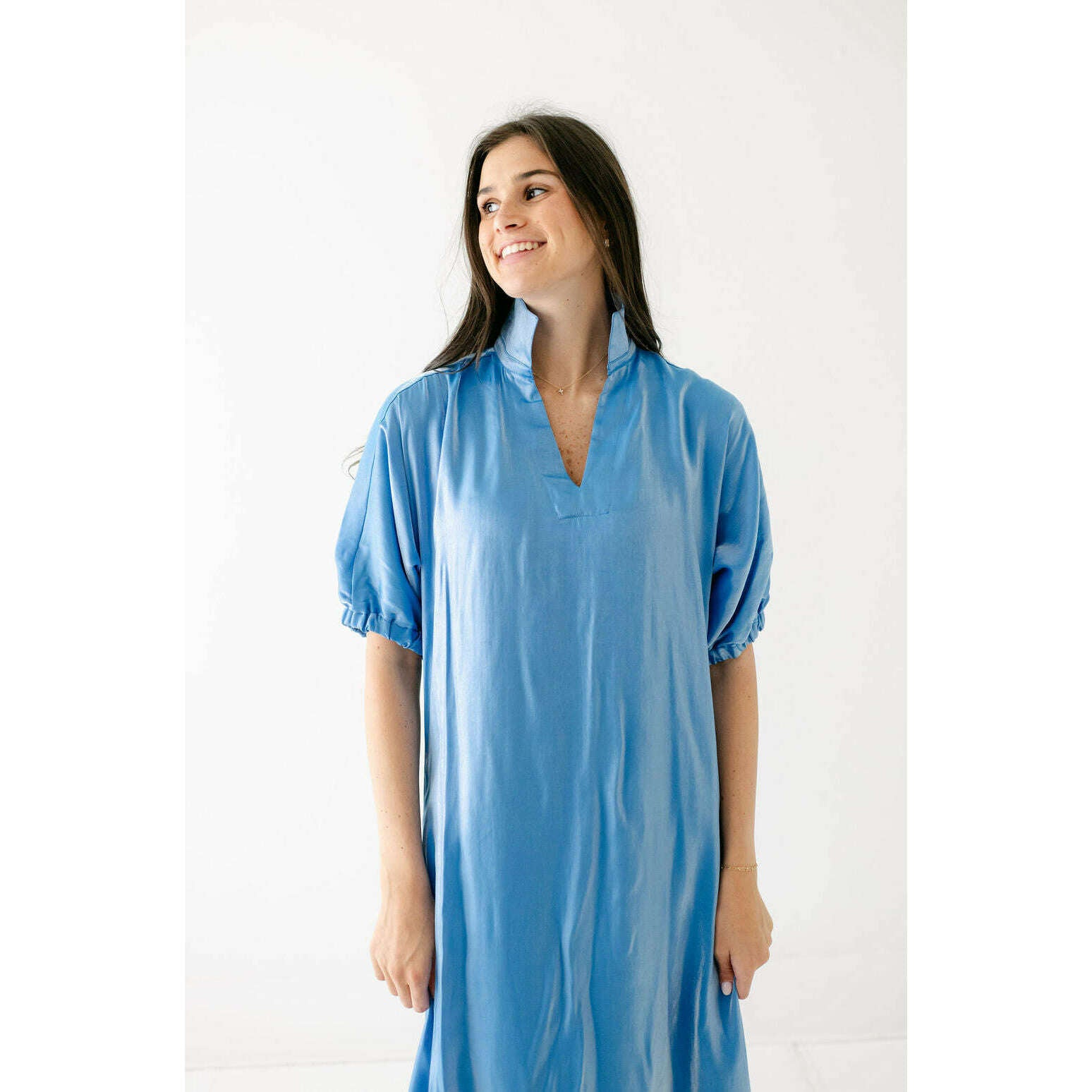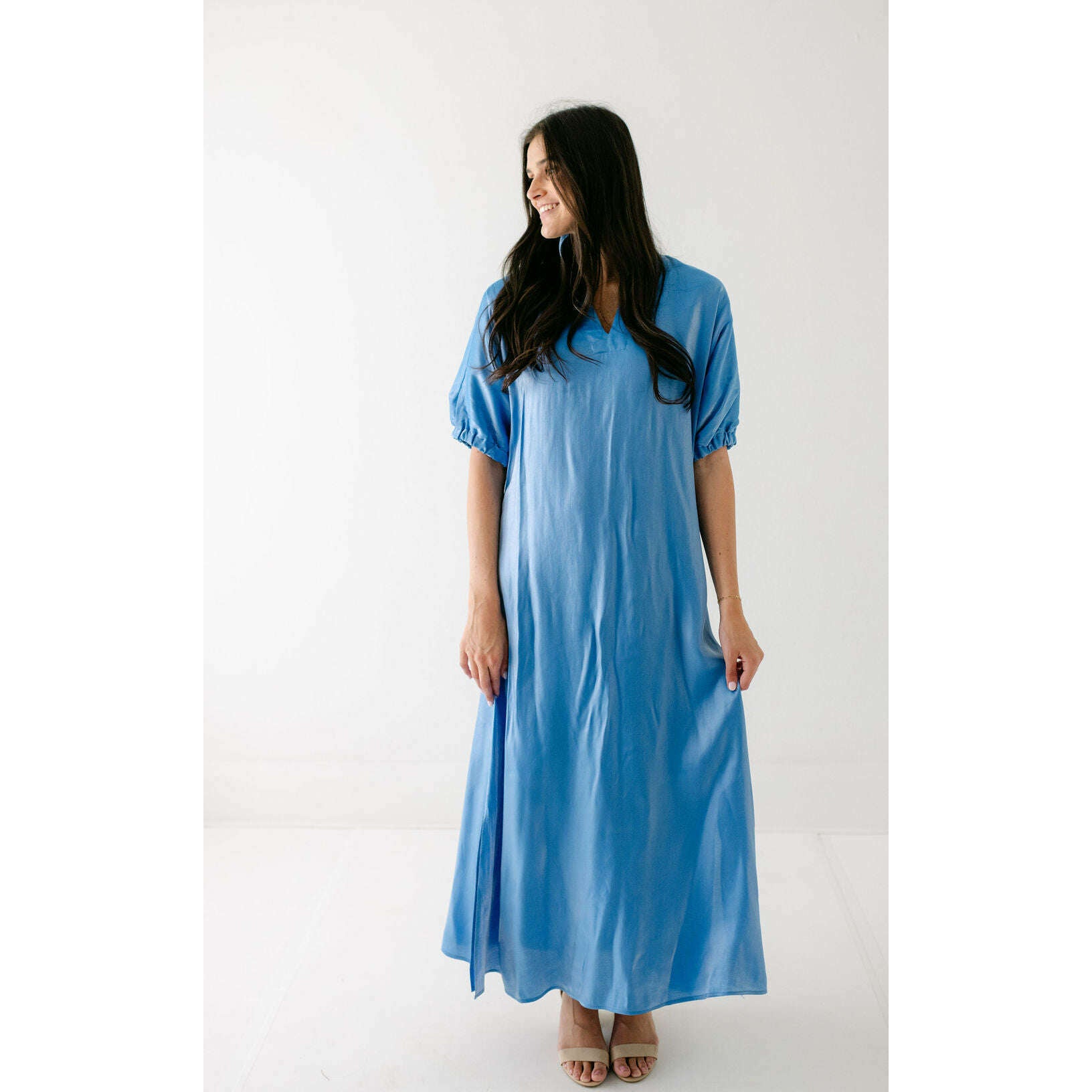 Radiant and effortlessly refined, the Emily McCarthy Poppy Maxi in Sapphire is designed to make an impression. Crafted in an illuminating silk blend that catches the light with every move, this maxi dress features a classic stand collar, loose elastic dolman sleeves, and an easy, flowy silhouette. Equal parts comfort and polish, it’s the perfect choice for elevated occasions when you want to turn heads—while feeling completely at ease.