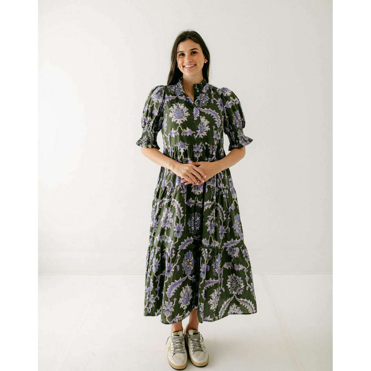 Elevate your fall wardrobe with this stunning Entro Ashlyn midi dress, featuring a captivating blend of green and purple florals that instantly brighten any seasonal look. The flattering midi length offers the perfect balance of elegance and playfulness, making it ideal for everything from casual outings to special occasions. Embrace the season's most charming style with a dress that combines vibrant colors and effortless sophistication.