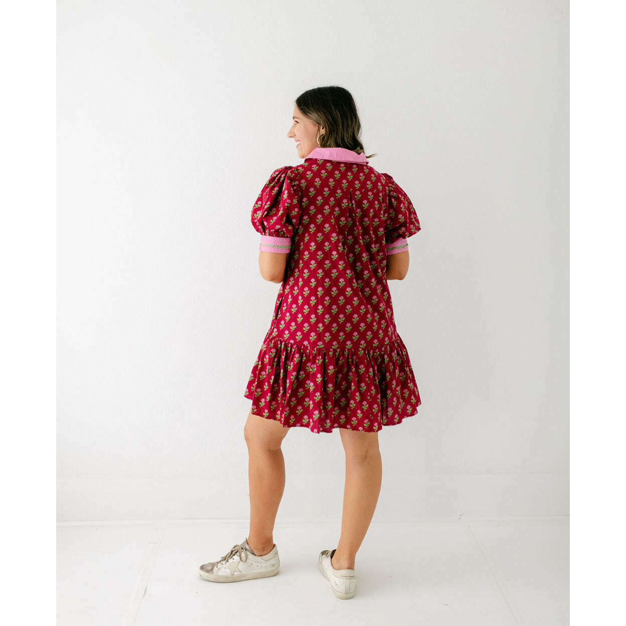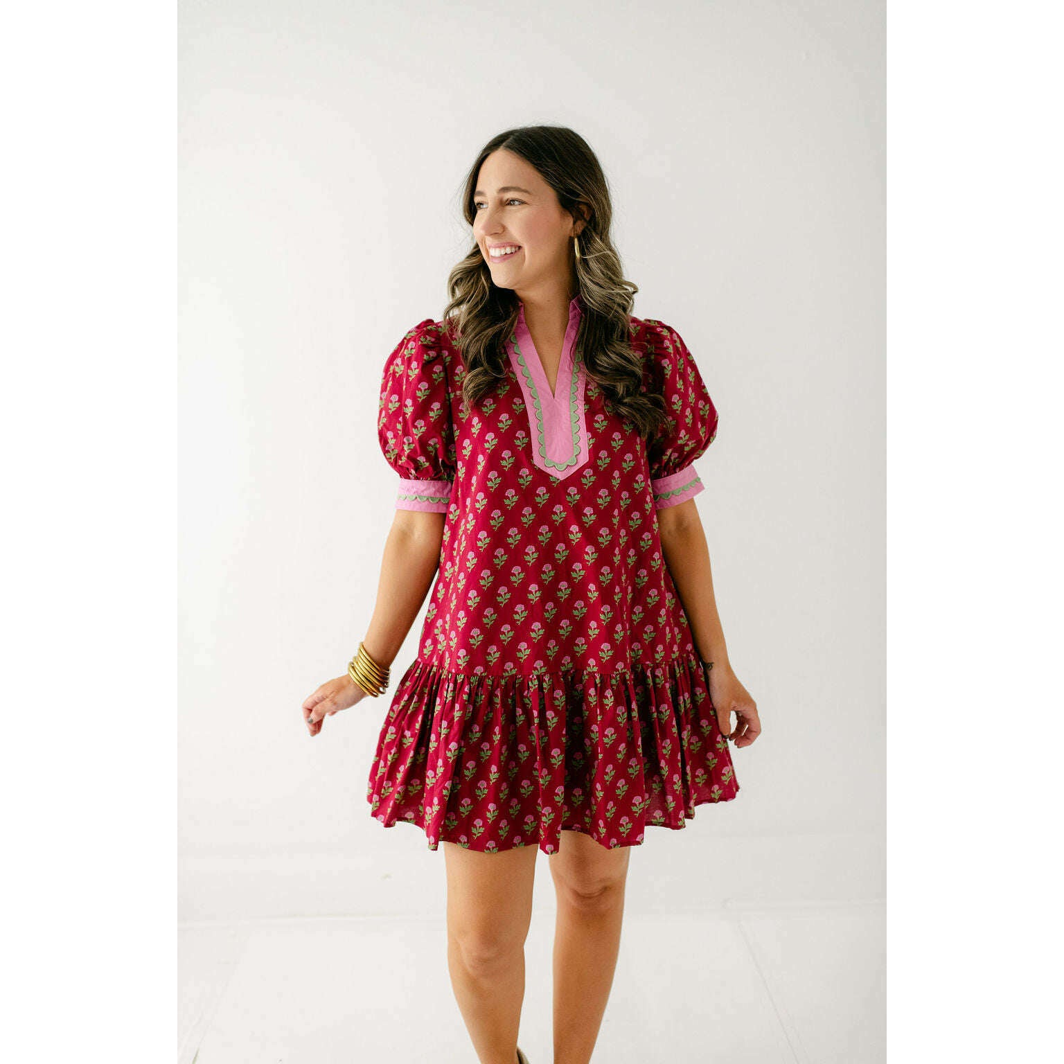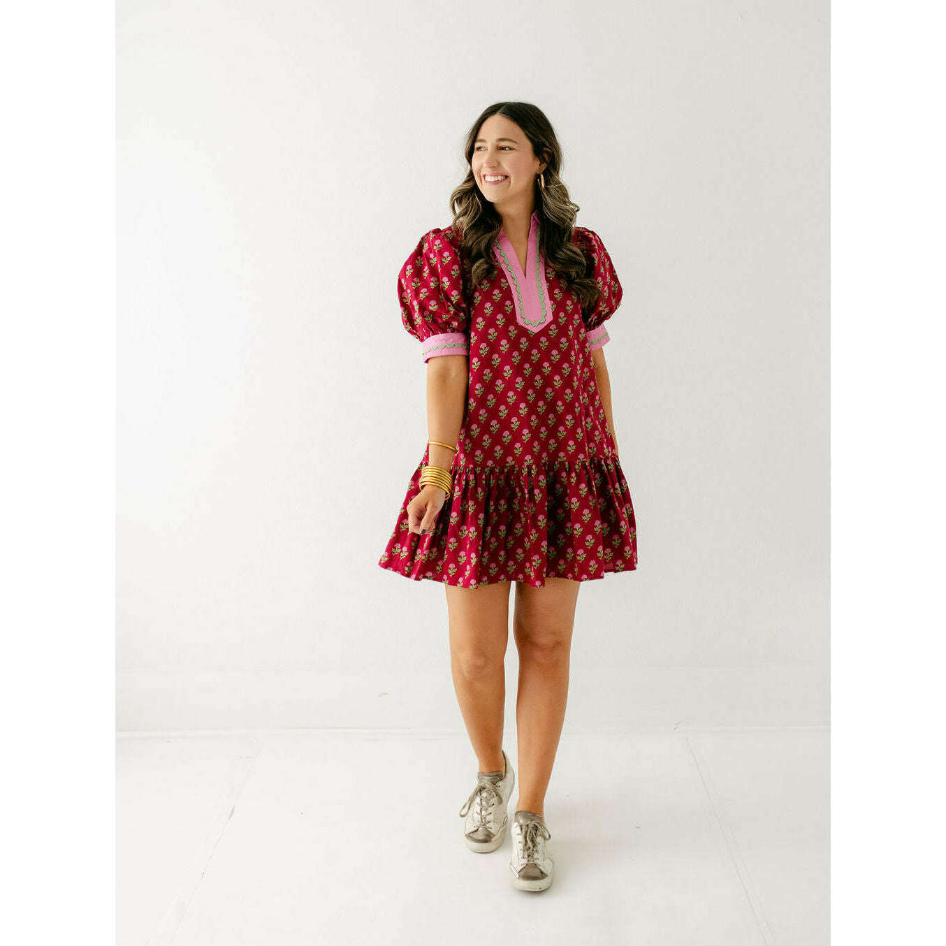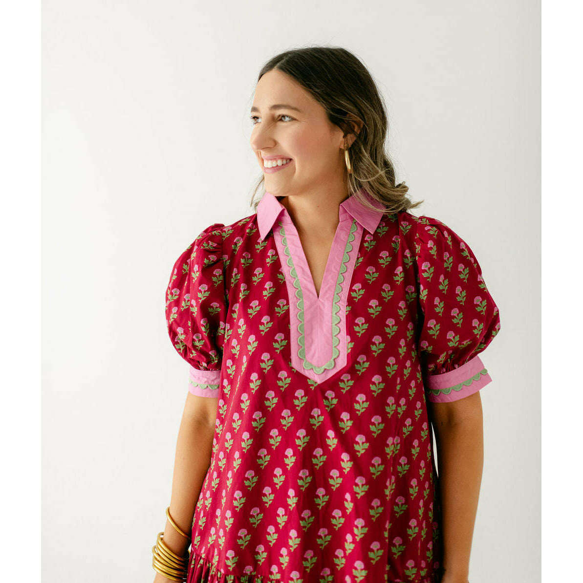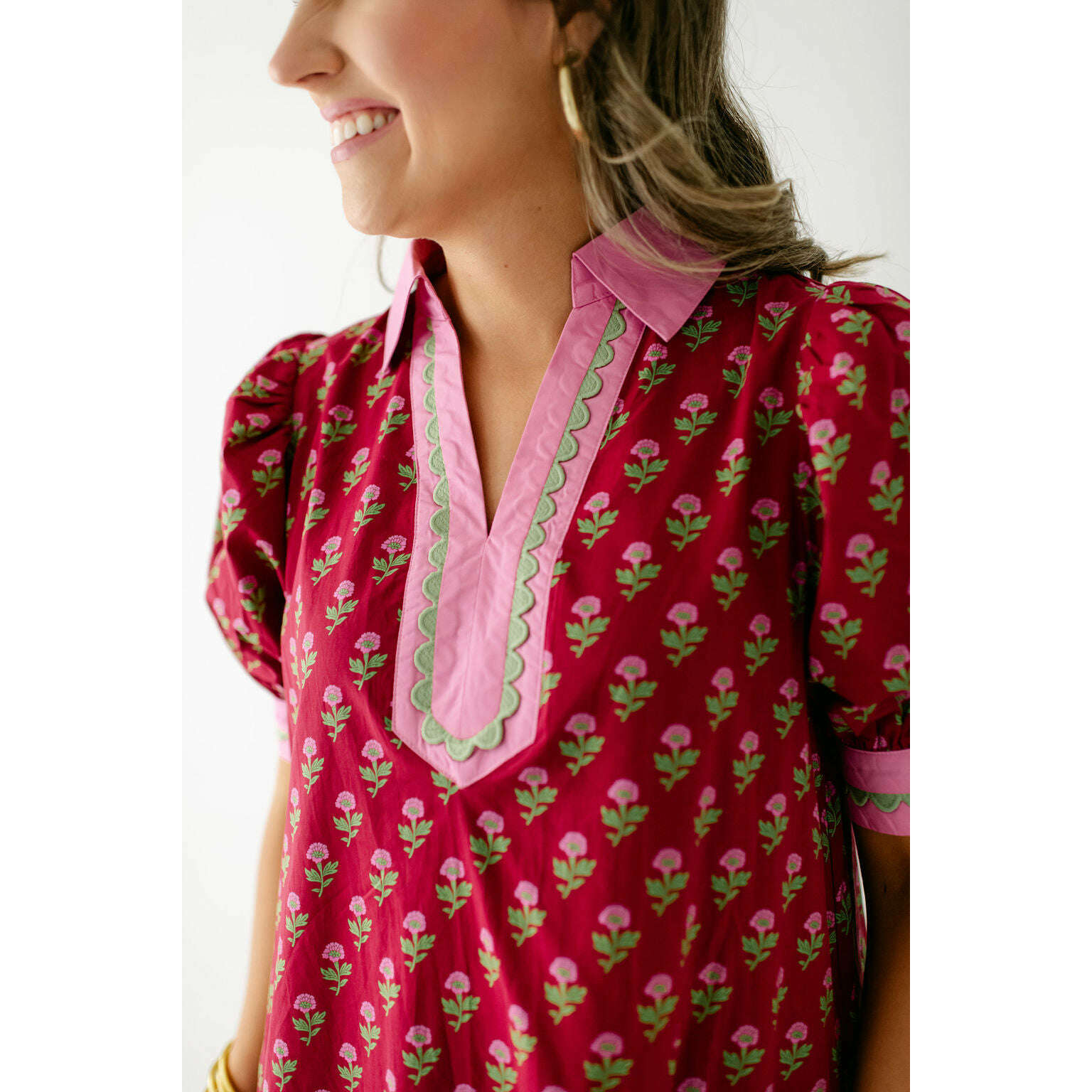 The Scarlet Floral Block Print Mini Dress in Wine features a charming floral pattern and delicate scalloped detailing, making it an irresistible choice for fall. Its rich wine color and playful design bring warmth and style to your wardrobe. Perfect for seasonal outings, this dress effortlessly combines comfort and flair to keep you looking cute and confident all day long.