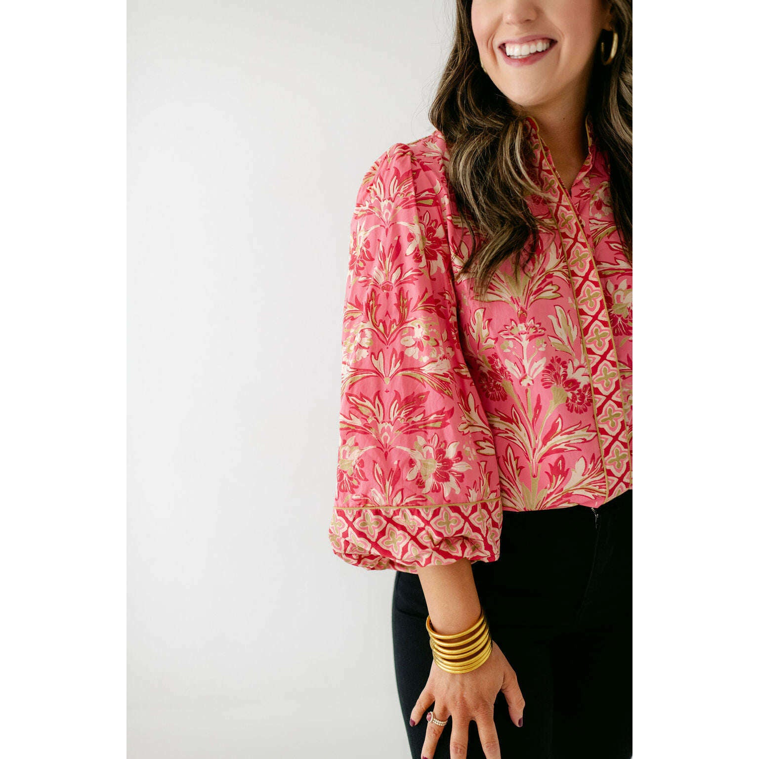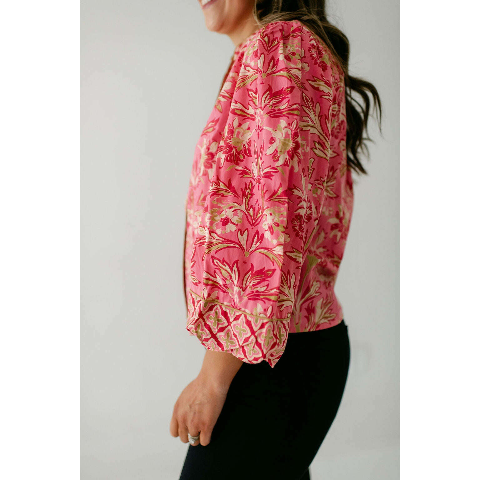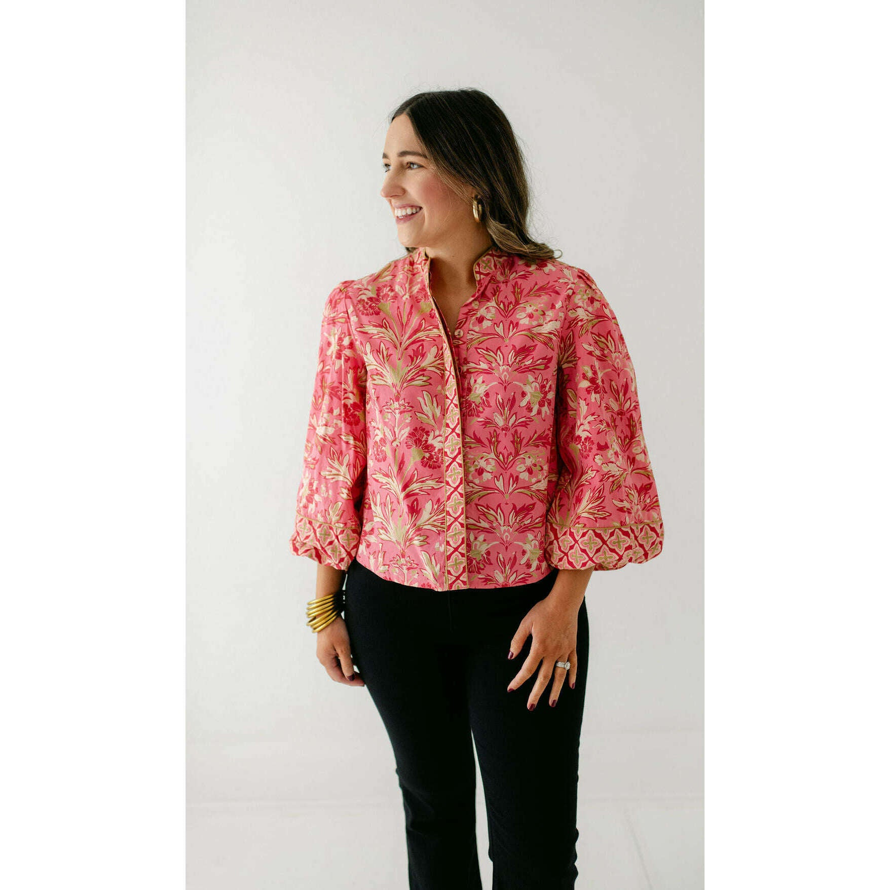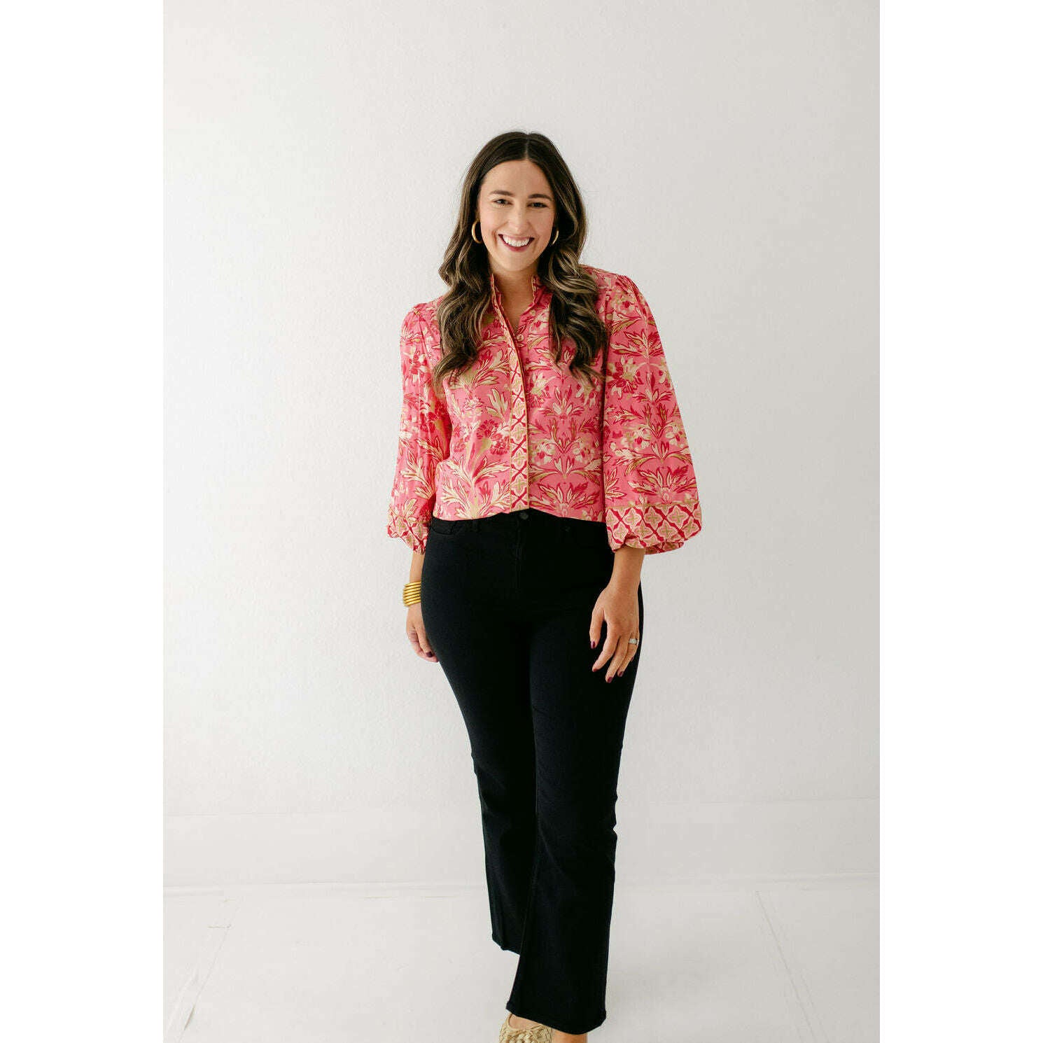 The Elizabeth James Emily Top is the perfect button front blouse, featuring a mandarin collar, covered placket, and balloon sleeves. This season, she is cut from a cotton blend fabric in our Grandeur Cherry print, perfect for dressing up or down this season.