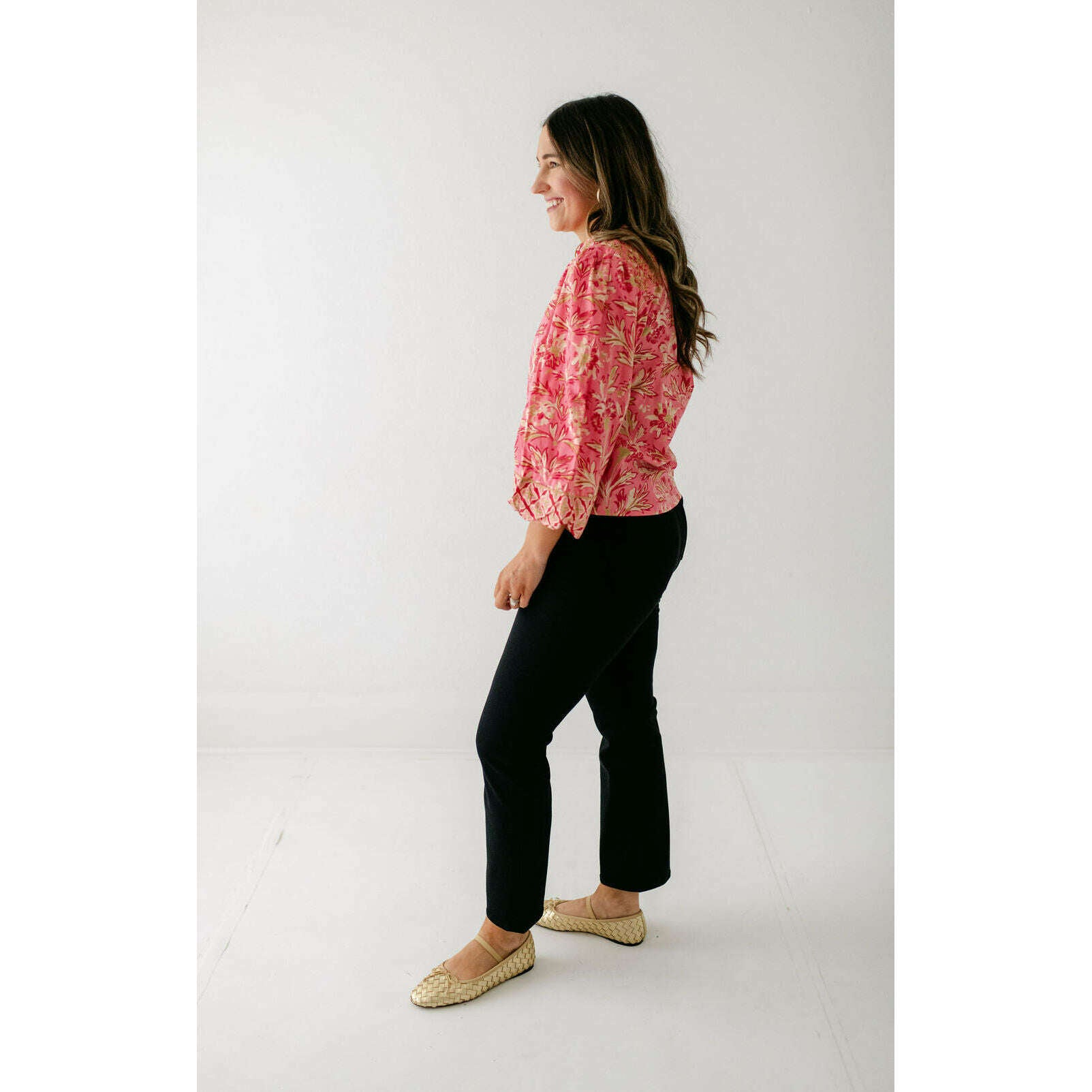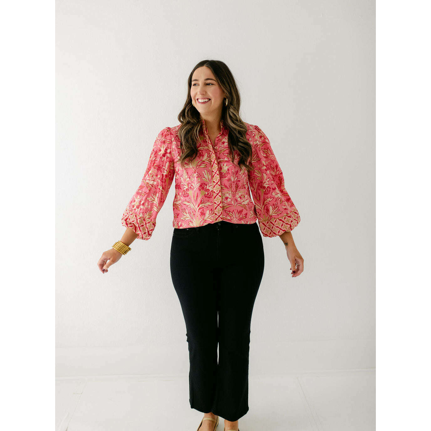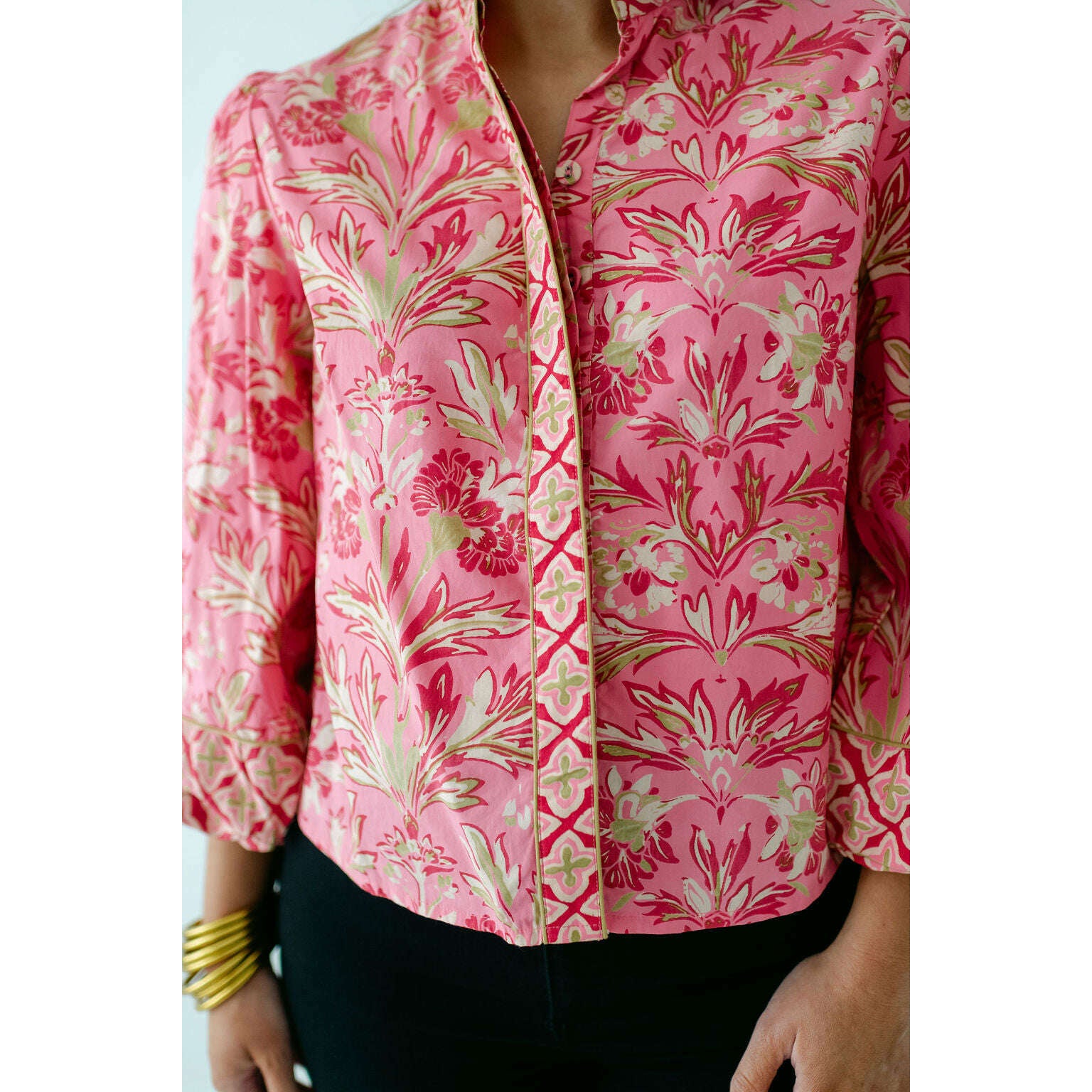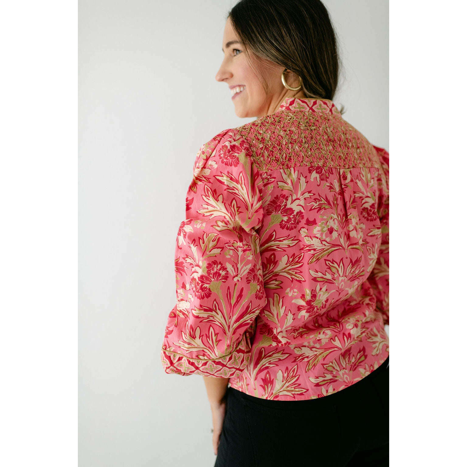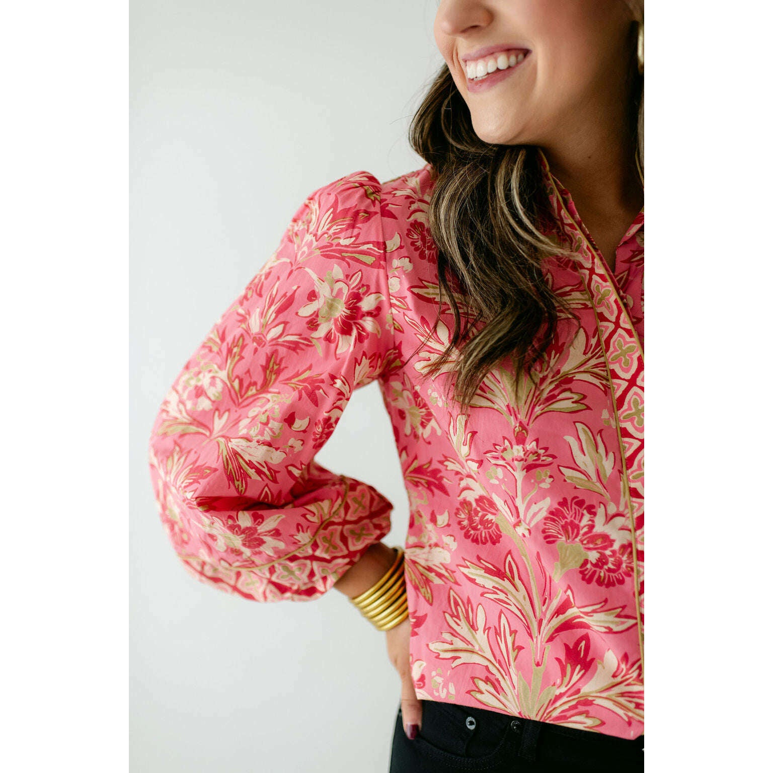 The Elizabeth James Emily Top is the perfect button front blouse, featuring a mandarin collar, covered placket, and balloon sleeves. This season, she is cut from a cotton blend fabric in our Grandeur Cherry print, perfect for dressing up or down this season.