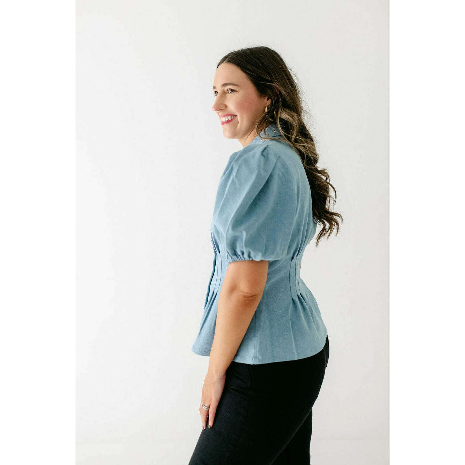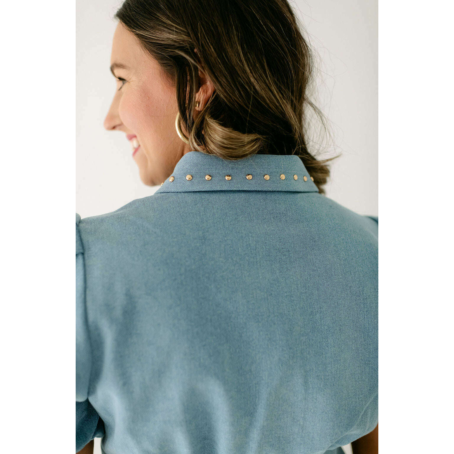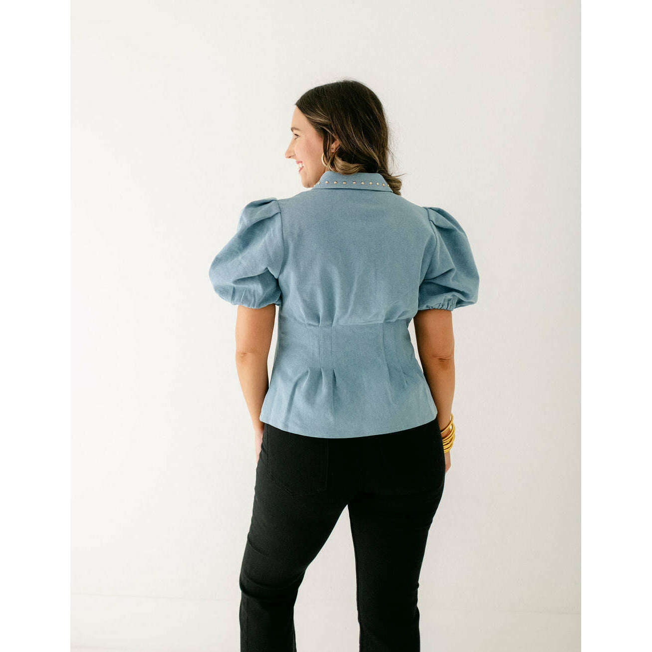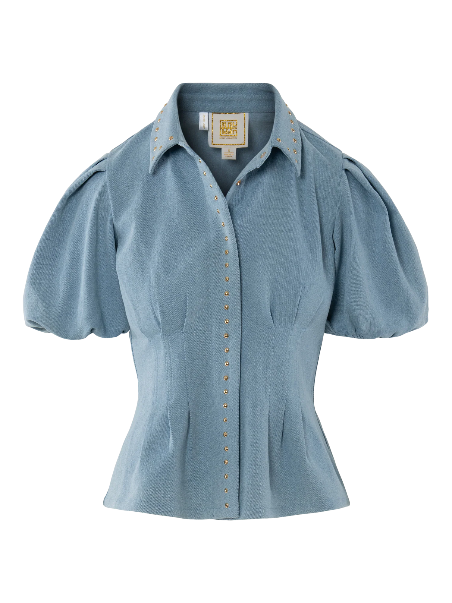 The Emily McCarthy Britt Top redefines denim with a feminine edge. Featuring a classic fold collar, puff sleeves with elastic cuffs, and a lightly boned bodice, this style offers both structure and ease. A concealed front button closure is framed by a gold-studded panel, adding a subtle western-inspired detail. Crafted in stretch denim, it flatters the figure while providing comfort, making it as timeless as it is on trend. Pair with the matching Paisley Pant for a full denim look that’s effortlessly chic and designed to turn heads.