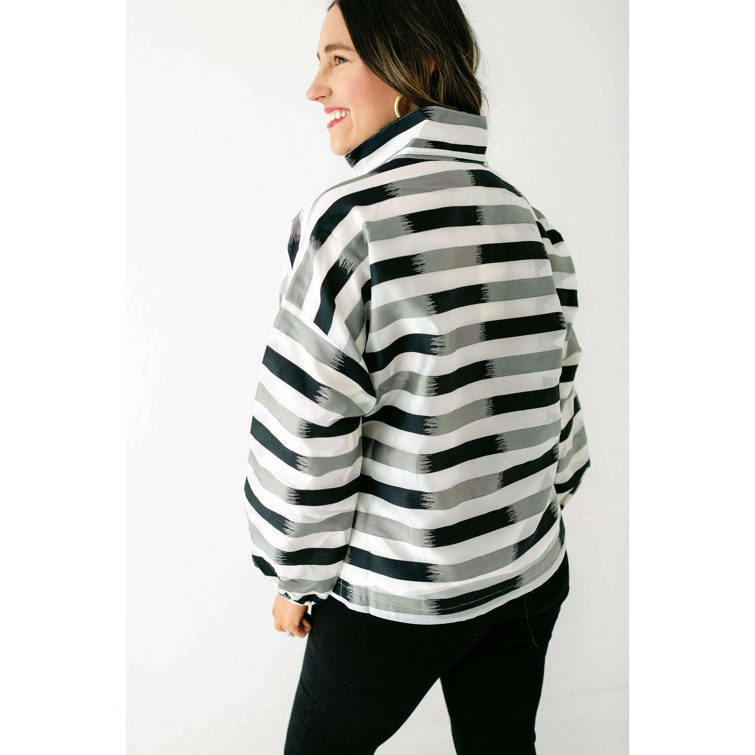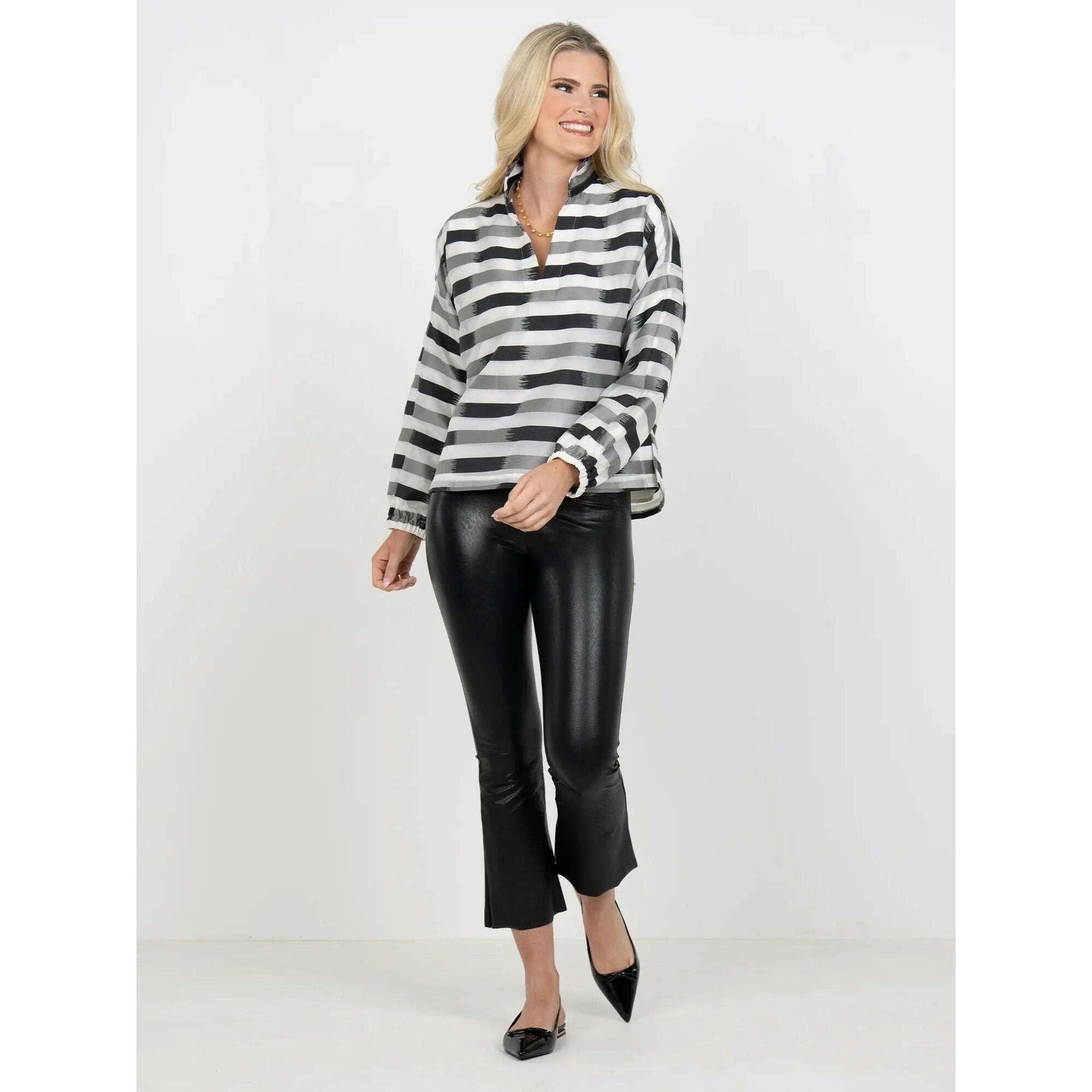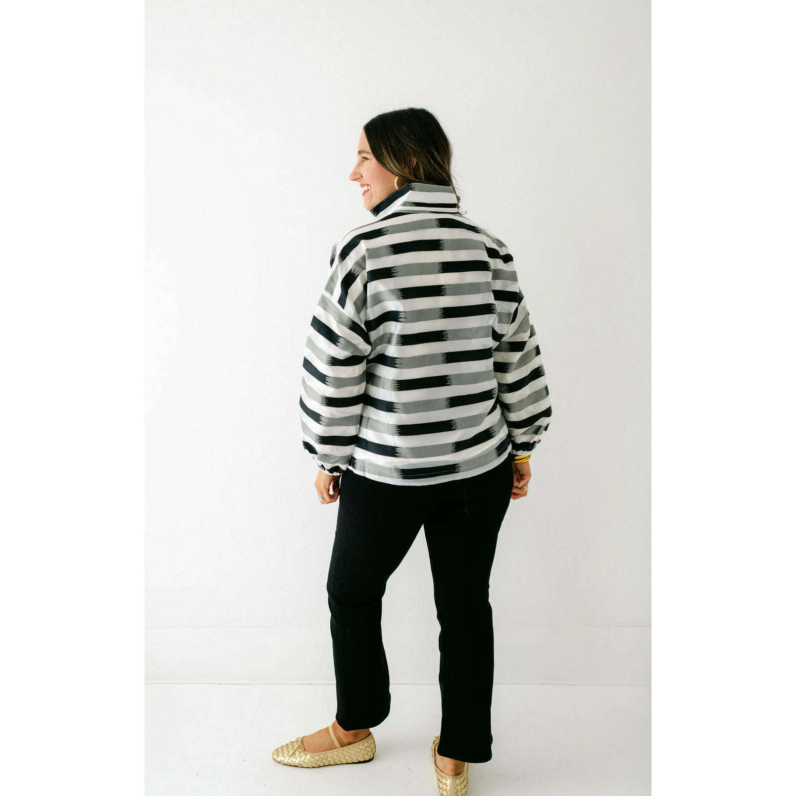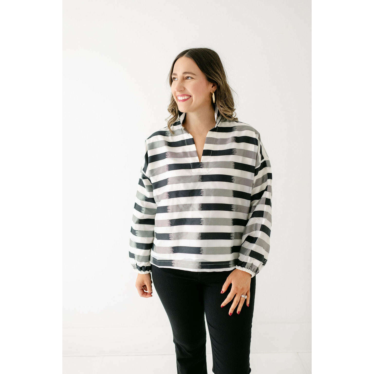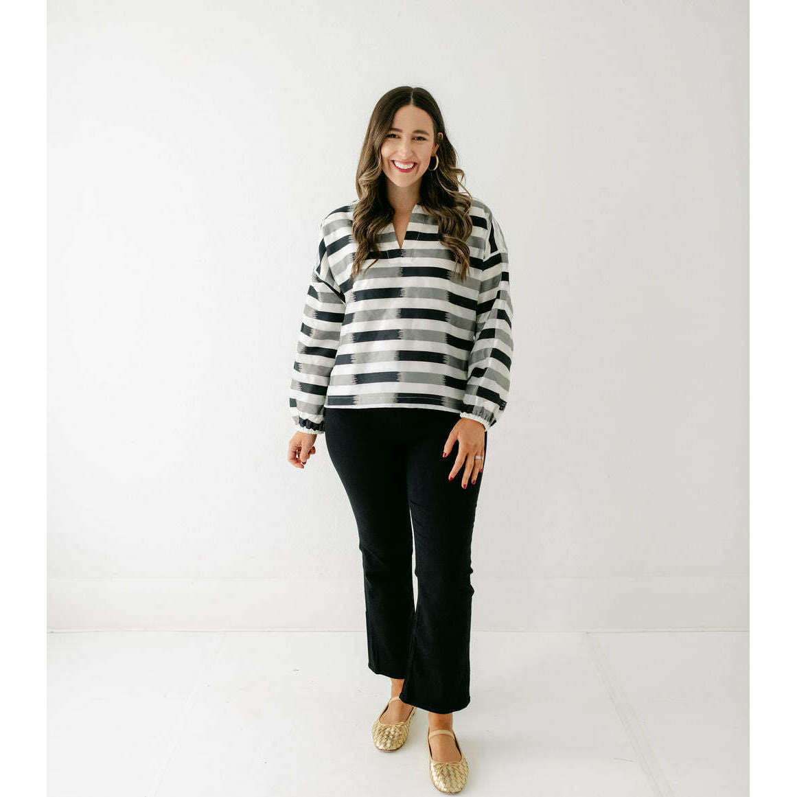 The Emily McCarthy Long Sleeve Poppy in Truffle Stripe features a classic stand collar, long elastic dolman sleeves, and a relaxed silhouette. The Truffle Stripe fabrication is a mix of matte and sheen, creating subtle dimension and movement as it catches the light. This modern textile gives the signature Poppy shape a fresh, playful update while maintaining its versatile appeal.