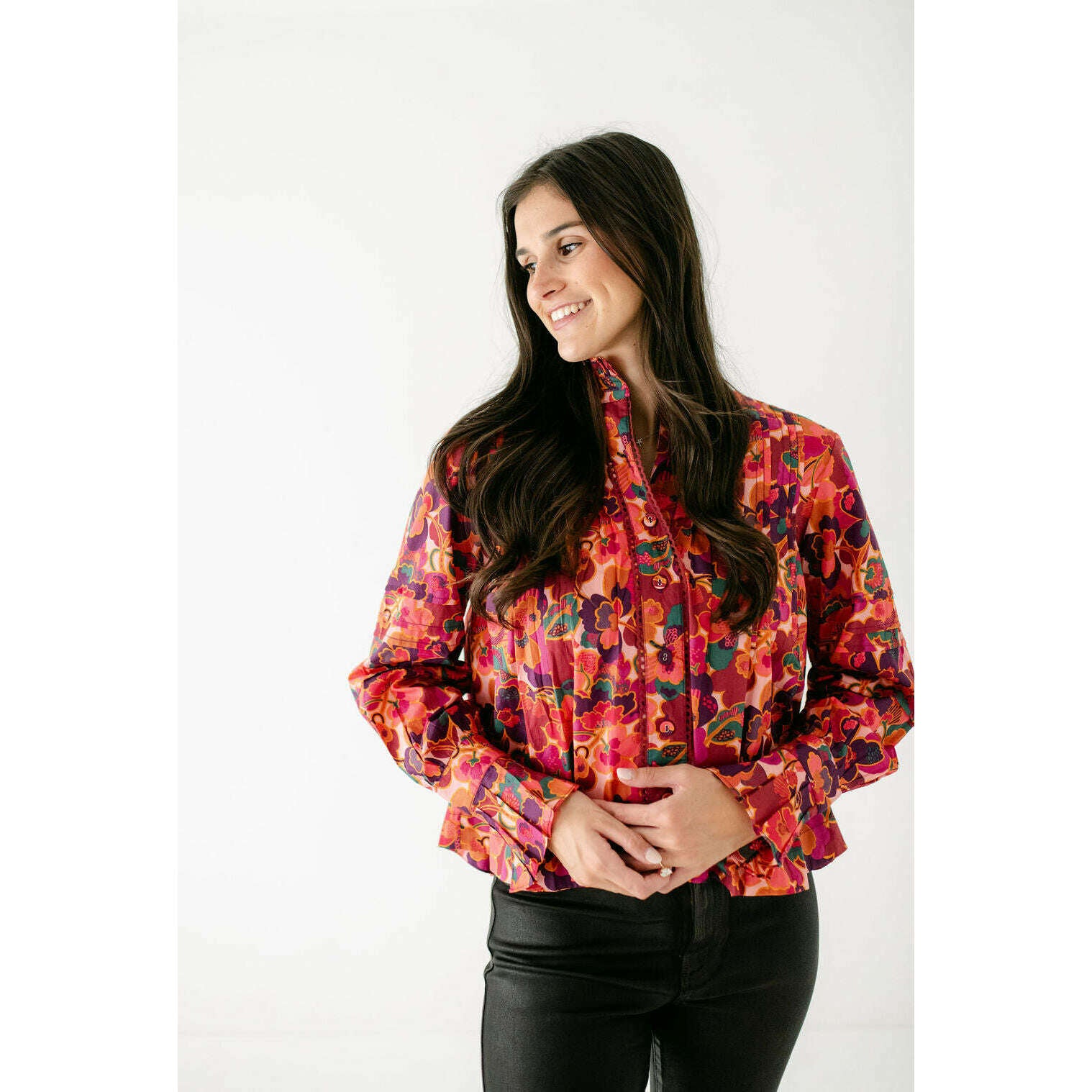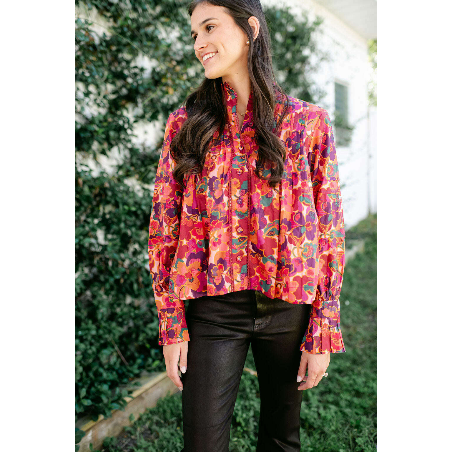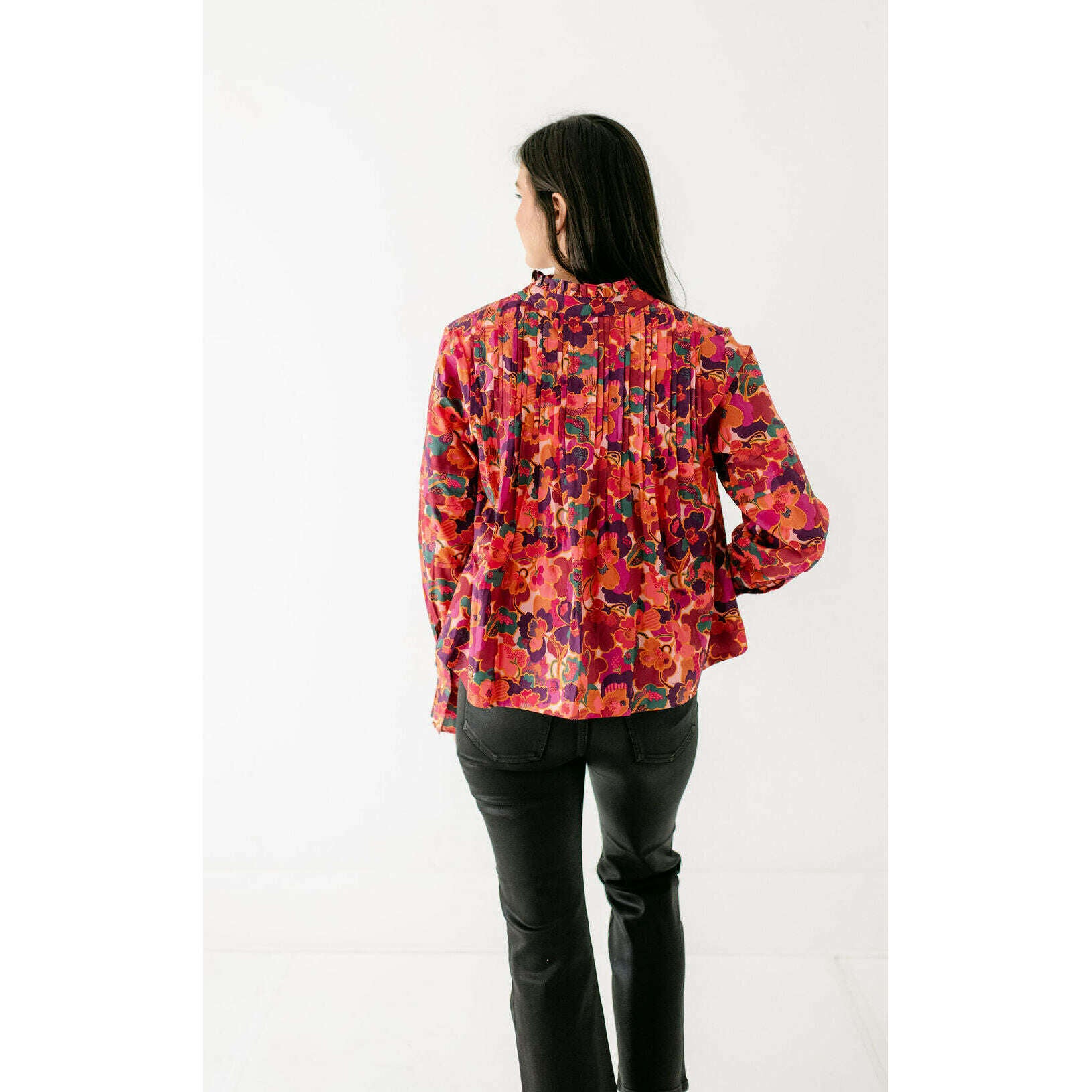 The Wiley Top in Prospect Floral Print is a vibrant statement piece with intricate highlights at the sleeves, neckline, and front button placket. Designed with feminine pintucks and a bold floral palette, it’s a versatile top that adds effortless charm to both casual denim and tailored looks.