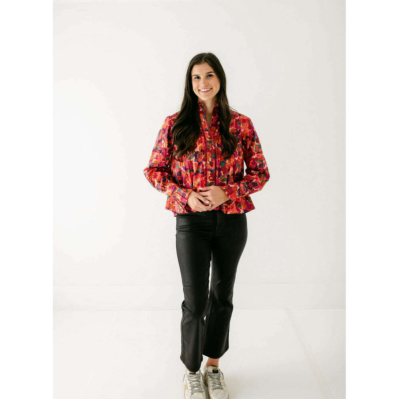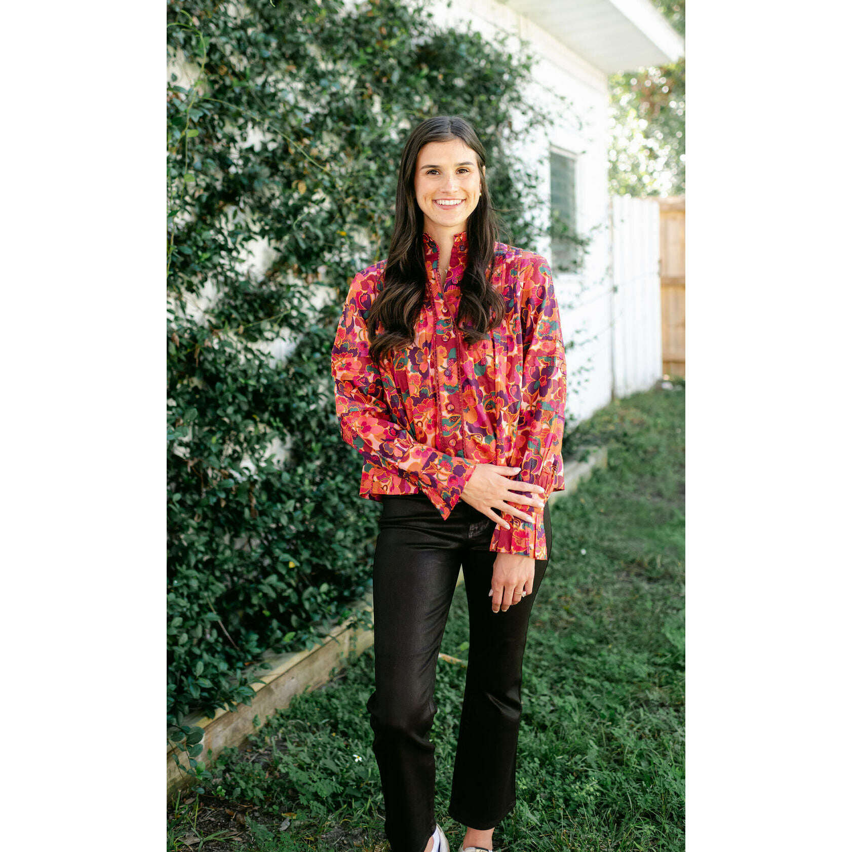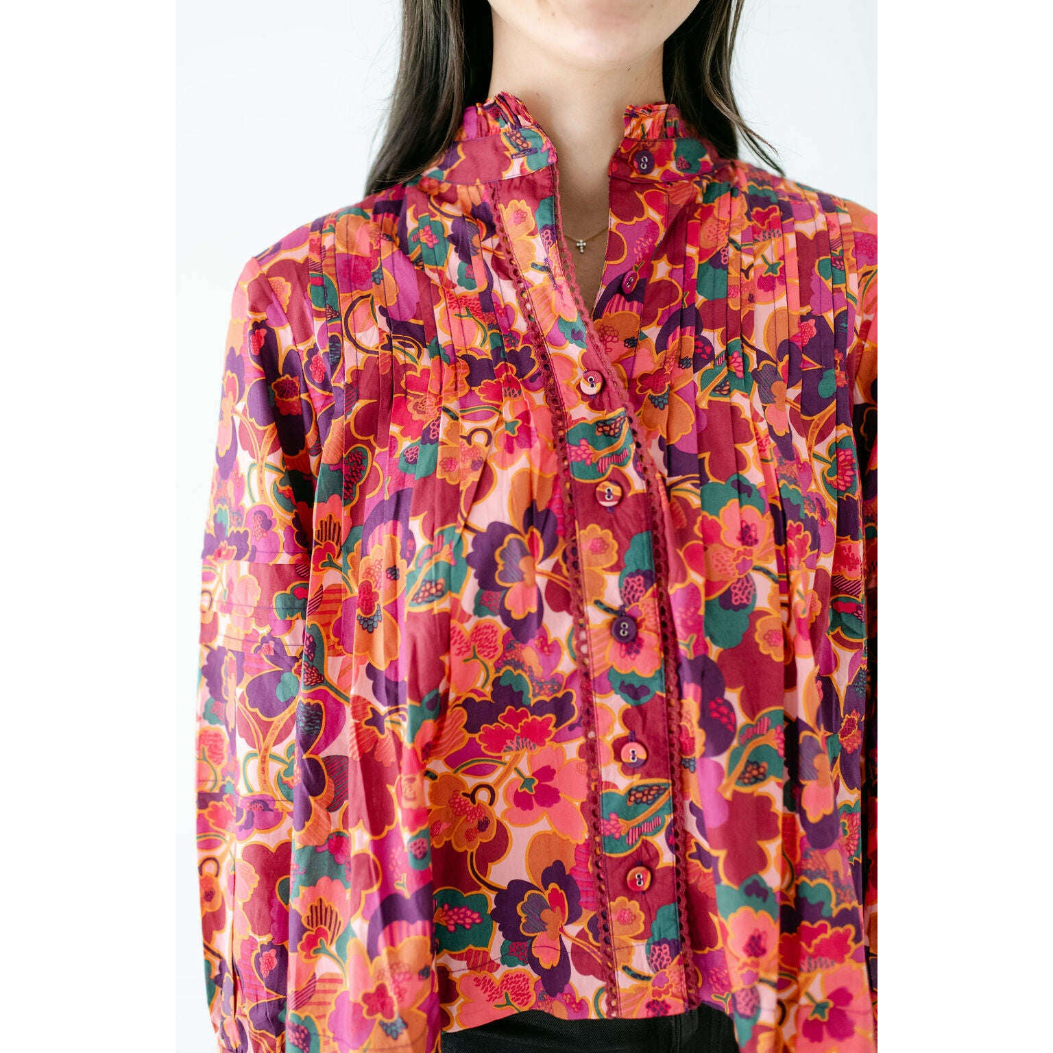 The Wiley Top in Prospect Floral Print is a vibrant statement piece with intricate highlights at the sleeves, neckline, and front button placket. Designed with feminine pintucks and a bold floral palette, it’s a versatile top that adds effortless charm to both casual denim and tailored looks.